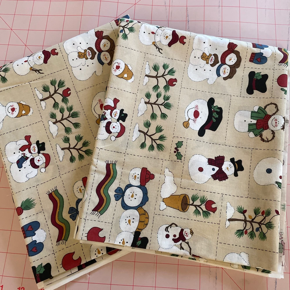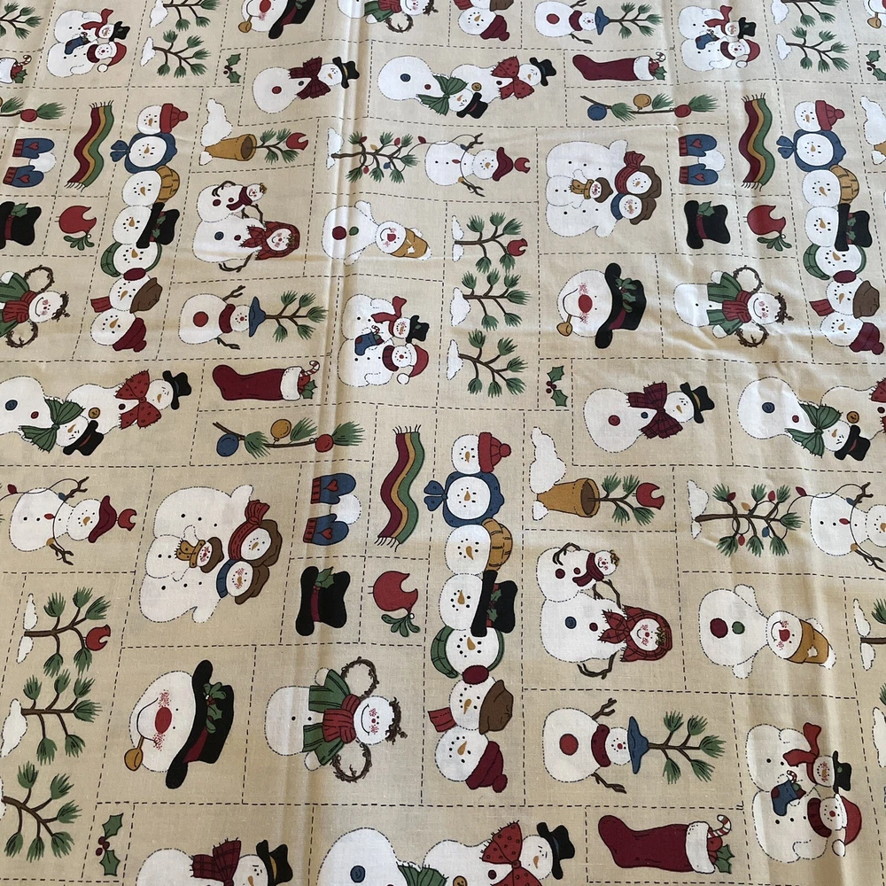 Winter christmas snowman Family patchwork print 2 Yard Bundle. Unmarked/unbranded piece. Comes with 2 cuts of the same print. In total measures just under 2 yards; one of the cuts is a yard and the other is 35”. Has been cut to print, so fabric may not be square. Has a slight musty odor.