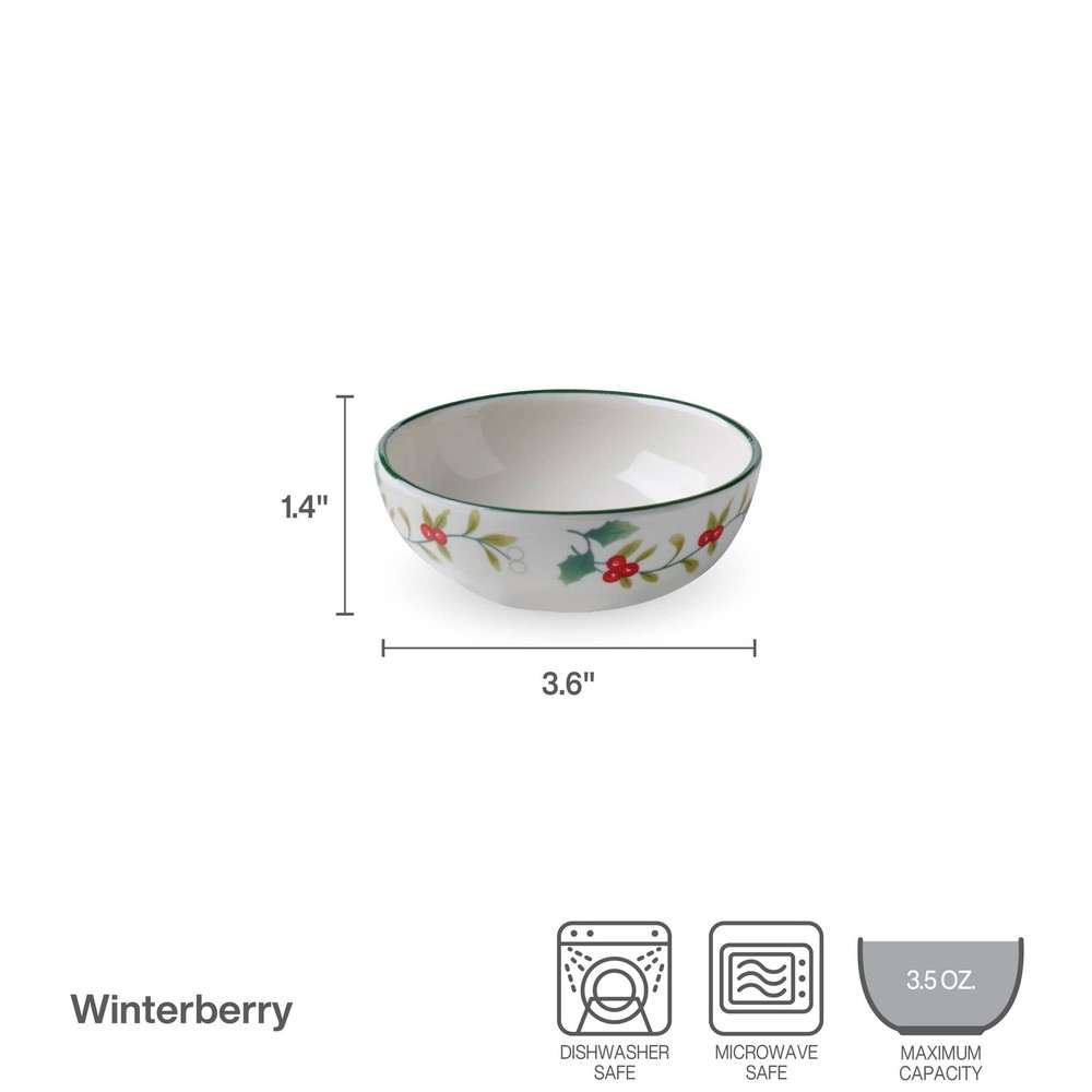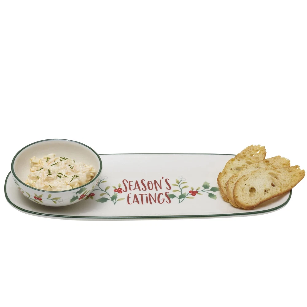 TIMELESS HOLIDAY MOTIF: Winterberry celebrates the holly leaves and berries that make their appearance each winter and are an iconic symbol of the Christmas season FESTIVE DIP BOWL AND TRAY SET: features the sentiment Season’s Eatings on the tray measuring 11.8 inches in lenght and dip bowl with a capacity of 3.5 ounces, accented by the Winterberry pattern and a green accent band around the rim MULTIUSE: place the dip bowl on the tray to serve appetizers and dips together, or use the components separately to serve a variety of foods and sauces BEAUTIFULLY CRAFTED: made of durable stoneware for long-lasting beauty EASY CLEANING AND REHEATING: dishwasher safe for fast, simple cleanup, and microwave safe for quick reheating