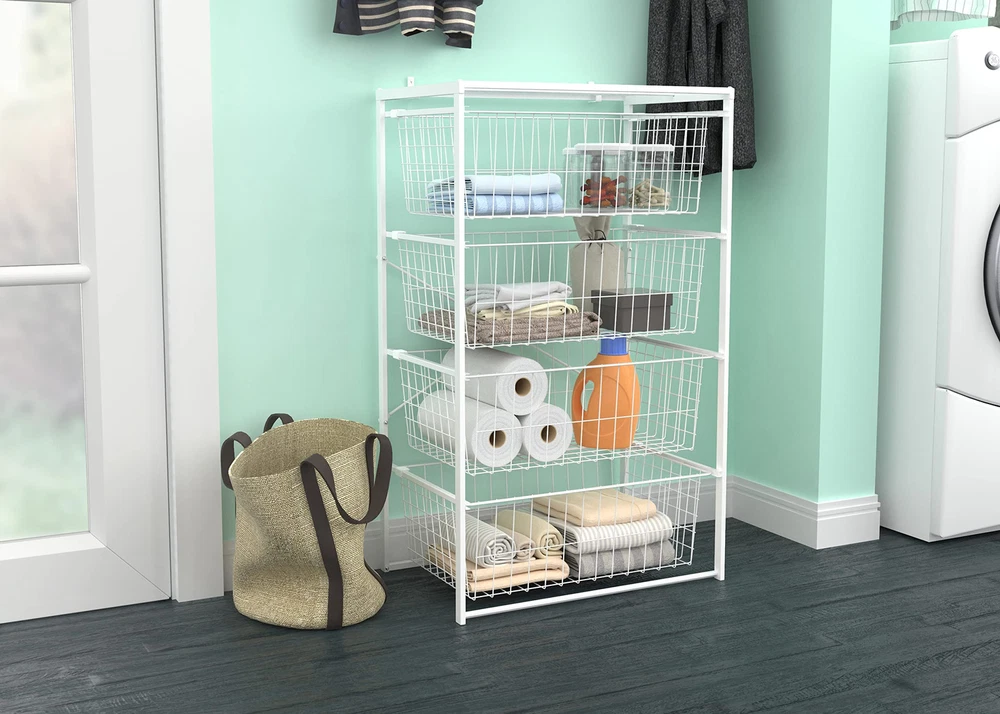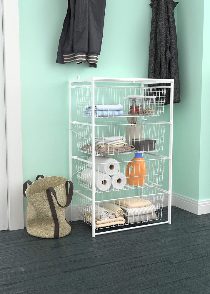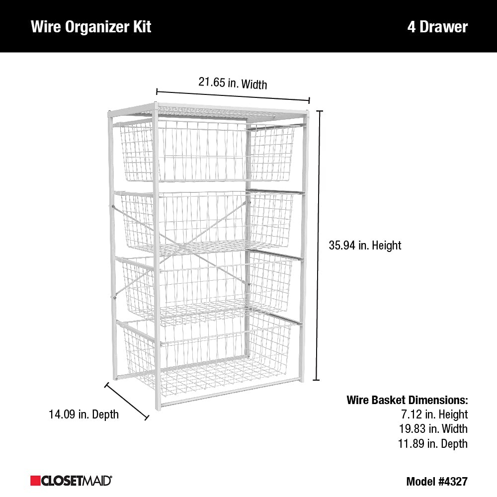 Organize your small spaces in your home or office with Multi-Functional Wire Basket Organizers. This wire basket drawer unit is a versatile solution for organizing bathrooms, offices, pantries, laundry rooms, craft room and closets. The deep drawers with easy to pull out design makes it easy to access stored items. Use this basket organizer to store food items, canned goods, toiletries, art supplies, craft items, folded clothes, books & more. The ventilated wire drawers allow your personal items to breathe, while giving you quick access to what you need, when you need it. Plus, you can see what’s inside making accessing items quick and easy. The convenient top shelf allows you to store additional items for even easier access. The durable epoxy coated steel design of the entire basket unit provides a sturdy construction. Choose from three different sizes with 2, 3 or 4 drawer options in various heights so you can find the right fit for your space. All hardware is included for easy assembly & installation so you can get your space organized in no time. Keep items neatly stowed away, saving you valuable counter and floor space with this convenient and versatile drawer basket storage solution. 4-DRAWER ORGANIZER: Wire basket drawer organizer adds ventilated storage to pantries, laundry rooms, closets, bathrooms, offices, craft rooms & more; Sturdy top shelf to organize additional items for easy reach PULL OUT DRAWERS: Easy to slide design for items like toiletries, towels, canned goods, books, crafts, folded clothes & more DEEP DRAWERS: Wire basket drawers measure 7.12 in. H x 19.83 in. W x 11.89 in. D to store a variety of items for quick access DURABLE DESIGN: Epoxy-coated steel for durability; Steel frame design EASY ASSEMBLY: Hardware is included with easy-to-follow assembly instructions, drill recommended for installation; Assembled dimensions: 35.94 in. H x 21.65 in. W x 14.09 in. D