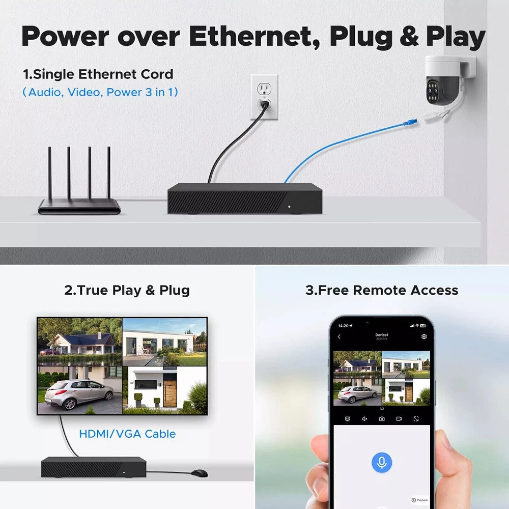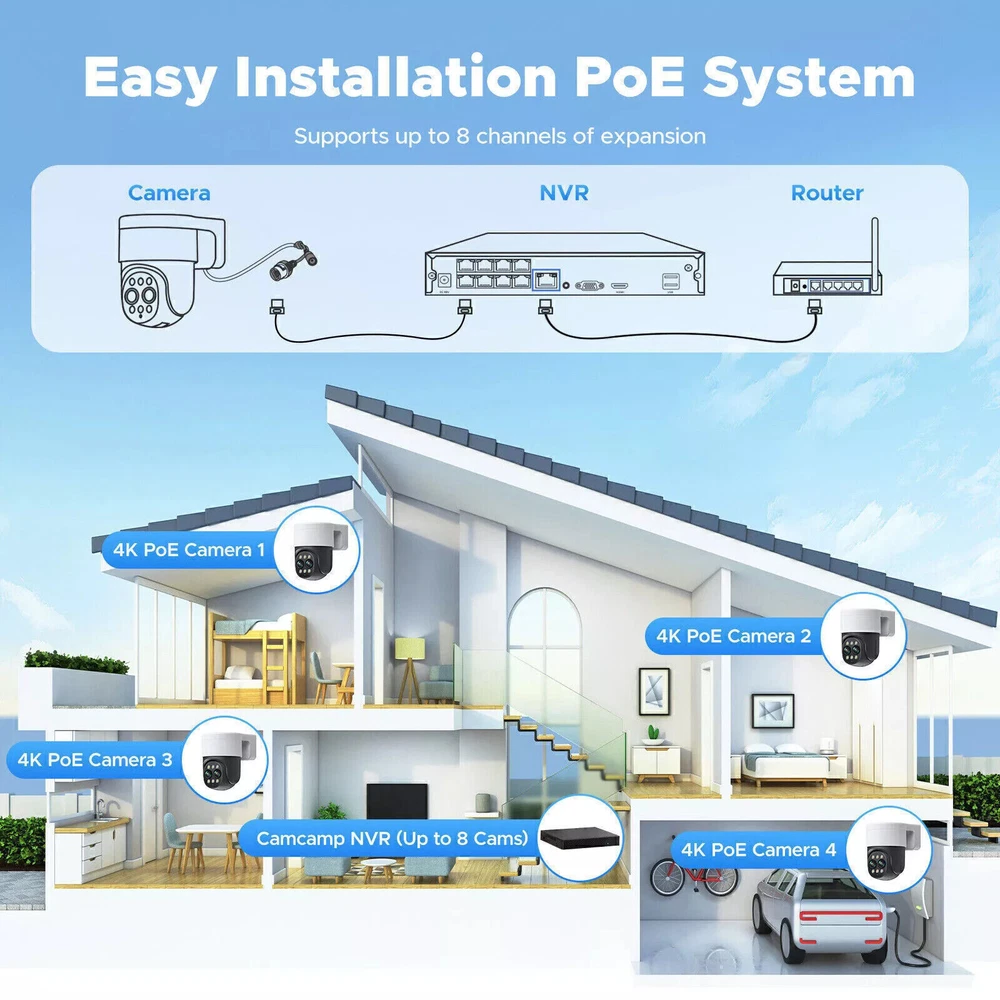 New Releases 6Pcs 4MP Wireless Solar Battery Powered Security Camera System Home Outdoor Wifi 329.99 USD Free shipping Toguard 10X Hybrid Zoom Light Bulb Security Camera Outdoor E27 PTZ Dual Lens 2MP 32.99 USD Free shipping CAMCAMP 8CH 4K POE Security Camera System IP Camera 3TBHDD 2-way Audio AI Detect 275.49 USD 289.99 USD Free shipping 5% off TOGUARD 8CH NVR 1080P Video Wireless Security Camera System Outdoor WIFI CCTV3TB 189.71 USD 199.69 USD Free shipping 5% off CAMCAMP 4K POE Smart Security Camera System Outdoor with 3TB Hard Disk Dual Lens IP PTZ Camera Auto Tracking 10x Hybrid Zoom Ultra H.265 8MP 8CH CCTV System Full Color Night Surveillance Kit Key Word: ▶ Dual Lens 10X Hybrid Zoom : Mind-blowing 10X PoE security camera system becomes affordable for your home and business security, giving you peace of mind with a wide field of view and clear close-ups. You'll see more detail in your security camera images, and small objects become larger and clearer in your field of view.(8MP=Dual lens :4MP+4MP) ▶ 355° Pan / 90° Tilt & Auto Human Tracking : Pan 355° Tilt 90°Captures every details without blind zone. More than that, AI Auto tracking function can track down suspicious human when enter surveillance area ▶ AI Algorithm Human Detection : By customizing the surveillance area or setting a line for human, and the alarm alerts will be triggered instantly to APP/NVR when detecting human crossing the line or intruding the alarm area ▶ Intruder Alarm lights and push alerts on Free APP : We could be alerted any time a person enter your property by receiving push notification from free phone APP, and alarm light will be triggered to drive away the suspicious objects ( Note: APP has No Monthly Fees) ▶ Real-time 2 Way Audio & Audio Recording : User can talk directly on phone app(No fees)for asking courier to put package to a certain place you point, and hear sound from Free App or TV monitor connected to NVR ▶ 3TB HDD+7/24/365 Record+Smart Playback : We have Various Record Modes like ①Regular 7/24/365 ②Motion Detection Record . AI Algorithm Tech allow you to select a certain period to playback the videos you want ▶ Work with or without Internet : For Local TV monitor surveillance, the camera system can work without Internet ,but If you want to remote access via APP or PC Client Software, we need to connect the system to router to access to internet Why Choose PoE Security Camera System? Disadvantages of Wireless Security Camera Systems Advantages of PoE Security Camera Systems Wireless security camera systems often face issues with limited range, PoE security systems provide reliable power and data over a single which can reduce their effectiveness in larger properties. Additionally, Ethernet cable, simplifying installation and without the interference they can suffer from signal instability due to interference from other issues common in wireless systems.They offer stable, high-quality wireless devices, leading to unreliable video quality and connectivity. video and have a range limited only by the cable length. Dual Lens 10X Hybrid Zoom, Get More Details With the hybrid zoom tech, you will never miss the bigger picture while also seeing what's important – down to every detail. This pan-tilt-zoom camera features advanced dual-lens technologies to fulfill unprecedented 10X mixed zoom for home protection. Pan & Tilt, Up & Down, Cover Your More Area Expand your coverage with the Pan-Tilt Security camera. Cover every angle and eliminate blind spots with the camera's vertical and horizontal rotation.Hybrid zoom in or out to see every detail near and far. Easily install on a ceiling or wall to get the perfect view. A uto Tracking Auto tracking helps you get the details on intruders by enabling it. When motion is detected the camera will automatically pan, tilt, Keep track of intruders and leave them nowhere to hide. Simplify POE installation,Easy to setup Video, Audio, and Power Carried By A Single Ethernet Cable(Included). Allows You Setup Your Home Security Camera System Easily. No Signal Issue Nor Wiring Hassles. The Power over Ethernet (PoE) is an advanced technology, which enables you to use a single network cable for both video and power transmission, installation easier! Besides, thanks to PoE you will never worry about electric leaks! Human Detection&Motion Detection If the camera detects humanoid movements, the system will send out an alarm (Show message to APP, Send email, system buzzer). You can know that someone is approaching your home anytime, anywhere. Put the Spotlight on Crime, Be Safe All the Time Motion turn on the spotlights , while also acting as a powerful deterrent. Work Even without Internet Color Night Vision The recording goes on with an HDD inserted in the DVR, even (1) Black-and-white (Infrared light) (2) Color mode (alarm light be on all night) without the Internet. Internet is only required when needing remote For energy saving, to set up alarm light by choosing Black and white mode, access, playback, etc. Real-Time Two-Way Audio Communication The built in high-quality speakers and m icroph ones make sure to communicate with people in the surveillance area when you’re away from home. 24/7 Monitoring and Recording, NVR Never Sleeps 8MP 4K PoE NVR security camera system supports simultaneous live feed and 24/7 recording for all cameras. the security IP camera can not only record just motion clips, but also every single minute of what happened. When something abnormal is detected, you’ll get notified instantly. You will never miss anything. Smart Playback Our security camera system boasts a built-in 3TB hard drive, offering extensive storage for seamless video playback. This allows users to efficiently review footage around the clock, facilitating comprehensive monitoring of events and enhancing overall security management capabilities. Detect Where You Want Define up to 32 coordinates to realize fixed-point and timed camera monitoring.