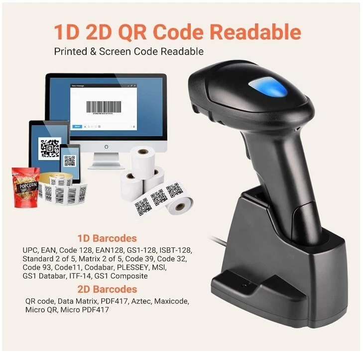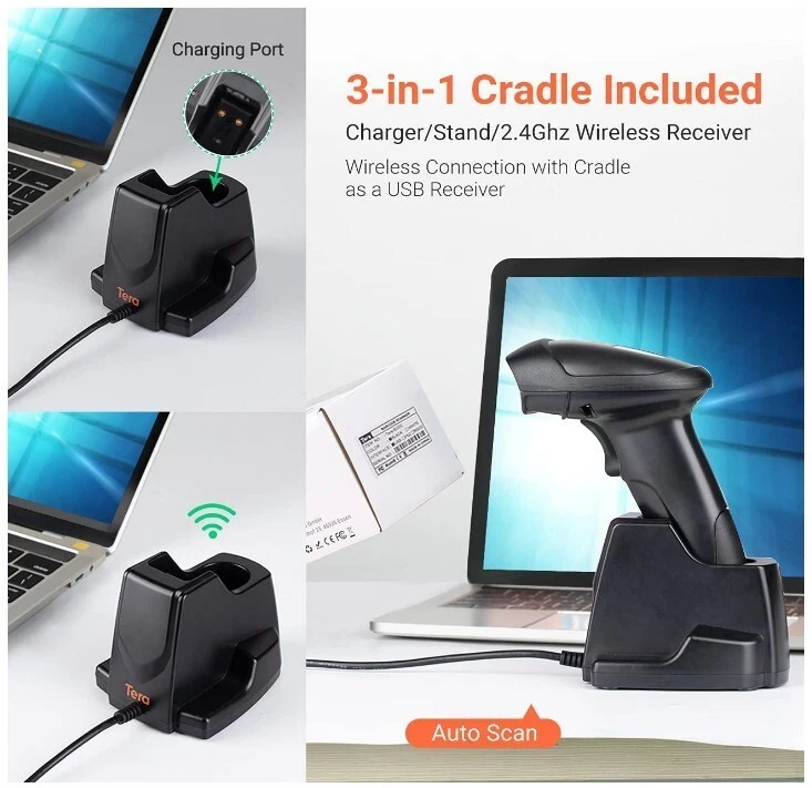 Wireless 1D 2D QR Barcode Scanner with USB Charging Base Code Reader Condition Brand New Features 3-in-1 Charging Cradle A versatile combination of Charger, Stand, and Receiver, designed to enhance your scanning experience. This innovative 3-in-1 Cradle optimizes the functionality of the scanner, making it an indispensable tool for businesses, shops, and warehouse operations. With seamless charging, effortless scanning, and hands-free operation, this cradle offers the ultimate convenience for all your scanning needs. Package Includes Barcode Scanner x1, Charging Cradle x1, User Manual x1 Uninterrupted Power Equipped with an charging crable, this scanner ensures extended standby time, providing reliable performance whenever you need it. While seated in the cradle, Tera HW0005 barcode scanner can operate continuously without any interruptions, making it a dependable tool for all your scanning requirements. Versatile Scanning Modes Experience flexibility with the Button/Continuous Mode options. In Button Mode, simply pull the trigger button to initiate scanning for quick and precise data capture. For a hands-free operation, set the scanner in Continuous Mode, and conveniently operate it while seated in the cradle. This seamless switch between modes empowers you to adapt the scanner's functionality to suit your specific scanning needs effortlessly. Swift and Precise Scanning Powered by a 32-bit CPU and boasting superior decoding capabilities, this scanner reads various codes with remarkable efficiency. It can recognize a wide range of 1D codes, including UPC-A, UPC-E, EAN-8, EAN-13, Code128, Code39, Code39 Full ASCII, Codabar, Industrial/Interleaved 2 of 5, Code93, MSI, Code11, ISBN, ISSN, and more (optional: GS1 Databar, Code32).It excels in decoding 2D codes, such as QR Code, Data Matrix, PDF417, Aztec code, Maxicode, and more. Rugged and Resilient With an IP54 shock-proof rating, this wireless barcode scanner can withstand falls from heights of up to 6.6ft, ensuring durability even in challenging environments. Its robust IP54 protection provides reliable shielding against dust, safeguarding the scanner's performance and extending its lifespan. Embrace confidence in its sturdiness, making it an ideal choice for demanding tasks in various industries. Shipping Free shipping to the Continental United States only. Most Items will ship by UPS or Fedex. Seller may also choose to ship some items by USPS For shipping to Alaska, Hawaii, Puerto Rico or APO/FPO addresses please contact seller with your complete address for a shipping price quote All orders are normally shipped within one business day. We do not ship on weekends or holidays Return Policy Free 30 day returns Powered by SixBit's eCommerce Solution