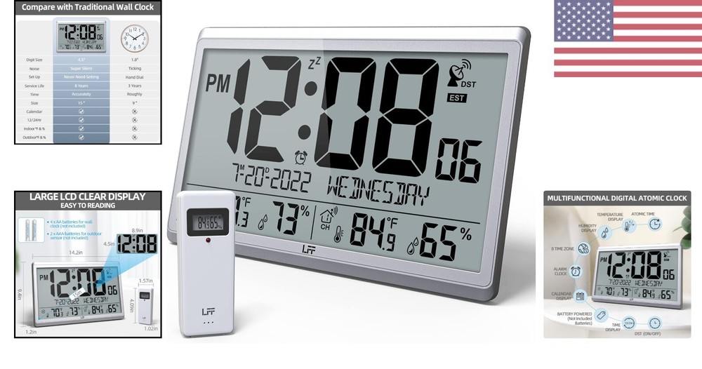 Wireless Atomic Wall Clock with Outdoor Temperature & Humidity Sensor ‹ › ‹ › ‹ › ‹ › ‹ › ‹ › ‹ › ‹ › ‹ › Wireless Atomic Wall Clock with Outdoor Temperature & Humidity Sensor 📡 ACCURATE ATOMIC CLOCK: Automatically synchronizes with the US Government’s National Institute for accurate timekeeping. 👍 15" LCD HIGH DEFINITION DISPLAY: Large numbers for easy reading, displays time, calendar, temperature, and humidity. 👍 WIRELESS OUTDOOR SENSOR: Transmits accurate outdoor temperature and humidity measurements up to 328 feet. 👍 OPERATED BATTERY: Powered by batteries for easy setup and use, perfect for seniors. 🎁 PERFECT GIFT: Stylish design, can be hung on the wall or placed on a desk, ideal gift for loved ones. ⚠️ Note: Temperature below -4°F require Lithium batteries in the outdoor sensor. Features: Accurate atomic clock with automatic time synchronization Large 15" LCD display with easy-to-read numbers Wireless outdoor sensor for accurate temperature and humidity readings Battery operated for easy setup and use Perfect gift for birthdays, holidays, and special occasions Benefits: Accurate timekeeping with atomic clock technology Easy-to-read display with multiple functions Convenient wireless outdoor sensor for outdoor conditions Simple setup and operation, perfect for seniors Stylish design for home or office decor Why choose our Wireless Atomic Wall Clock? Experience accurate timekeeping and weather monitoring with our Wireless Atomic Wall Clock. With automatic synchronization and a large display, this clock is perfect for keeping track of time, temperature, and humidity both indoors and outdoors. Easy to set up and use, it makes a great gift for loved ones. Don't settle for less - choose our Wireless Atomic Wall Clock for reliable timekeeping and weather monitoring. Order yours today and enjoy the convenience and accuracy of our Atomic Wall Clock! Shipping Free & Fast Shipping - We offer free shipping to most of the USA with a normal delivery time of 3-7 days. However, due to the current situation, additional delivery time (up to 3 weeks) may be required for some items. Alternative Carriers - We may use alternative carriers (e.g. USPS, FedEx, UPS, etc.) to ensure your package arrives safely and on time. Due to the use of multiple carriers, we are unable to provide a tracking number automatically. Handling Time - Orders are processed and shipped within 1-2 business days of receiving cleared payment. Shipping Restrictions - Shipping to Alaska, Hawaii, Puerto Rico, Guam, and other US territories may incur shipping charges or delivery restrictions. Please contact us before ordering, or your order can be refunded/cancelled. State Restrictions - There may be restrictions based on your state of purchase. For example, certain items may not be shipped to California due to state regulations. Contact for Tracking Updates - If you require tracking updates or have any concerns about the delivery of your order, please feel free to contact us, and we will be happy to assist you. Return 30-Day Hassle-Free Returns - We want you to be completely satisfied with your purchase. If you are not, you can return the item within 30 days of receiving it for a full refund or exchange. Easy Return Process - To start a return, simply contact us and we will provide you with a prepaid return shipping label and detailed instructions. Restocking Fee - There are no restocking fees for returns. However, the buyer is responsible for return shipping costs if the return is not due to a seller's error. Refund Processing Time - Refunds will be processed within 5 business days of receiving the returned item in its original condition. Payment We accept all major credit cards, PayPal, and Apple Pay for your convenience. Your payment information is secure and encrypted to ensure a safe and seamless transaction. Please complete your payment within 3 days of purchase to avoid any delays in shipping. Feedback Your feedback is extremely important to us. We strive to provide the best products and customer service possible. If you are satisfied with your purchase, please take a moment to leave us a positive review. If you have any concerns or issues with your order, please contact us before leaving negative feedback. We are committed to resolving any problems and ensuring your satisfaction. Contact Us If you have any questions or concerns, please feel free to reach out to our customer support team. You can contact us through the eBay messaging system. We are available Monday to Friday, 9:00 am to 5:00 pm EST, and we will do our best to respond to your inquiry within 24 hours. Thank you for supporting our small family business!
