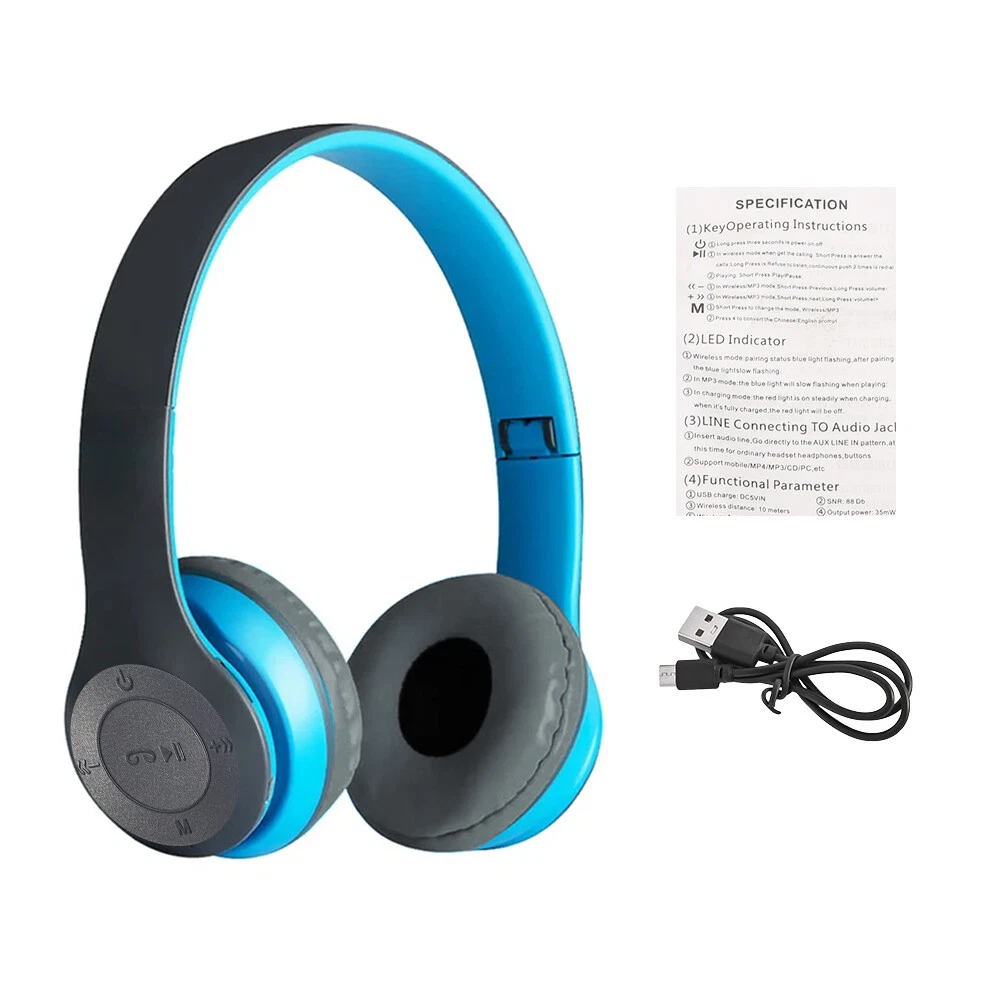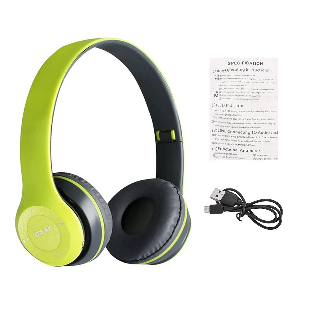 Specification: Connectivity: 3.5mm jack, Bluetooth, Micro USB, USB Type: Headset Color: Black, Blue, Green Features: Adjustable Headphones, Talking Function, Detachable Cable, Extra Bass, FM Radio, Foldable, HD Voice, Leatherette Padding, NFC Bluetooth Pairing, Noise Cancellation, Noise Isolation, Open Back, Rechargeable Battery, Replaceable Ear Cushions, Stereo, Surround Sound, Sweat Resistant, Volume Control, Waterproof, Wireless Wireless Technology: Bluetooth Form factor: On Ear Number of Headphones: Dual Suitable for: DJ, live monitoring, studio monitoring Type of microphone: Built-in Bluetooth version: 5.0 Voltage: DC5V FM frequency: 87.5-108MHz Bluetooth frequency: 2.401-2.480GHz Bluetooth distance: 10 meters Frequency Response: 50HZ-20KHz Output power: 35mW Signal-to-noise ratio: 88Db Charging time: 2 hours Frequency range: 20KHz-20000KHz Sensitivity: 90dB/mW Impedance: 32Ω Driver unit: 40mm Operating time: 5~6 hours Battery capacity: 250mA Transmission Frequency: 2402MHz-2480MHz Description: 1, 100% brand new and high quality manufacturing. 2, Bluetooth 5.0 chip, providing more stable and faster transmission. 3, Ergonomic design brings comfortable long time wearing experience. 4、Support TF card playback, FM, Bluetooth playback and make/receive calls. 5, Up to 6 hours working time, let you enjoy longer music and romantic LED light. 6, Foldable and portable, easy to carry and store. Package Includes: 1x Bluetooth headset 1x USB cable On Nov 29, 2024 at 23:15:10 PST, seller added the following information: