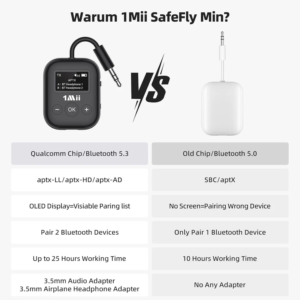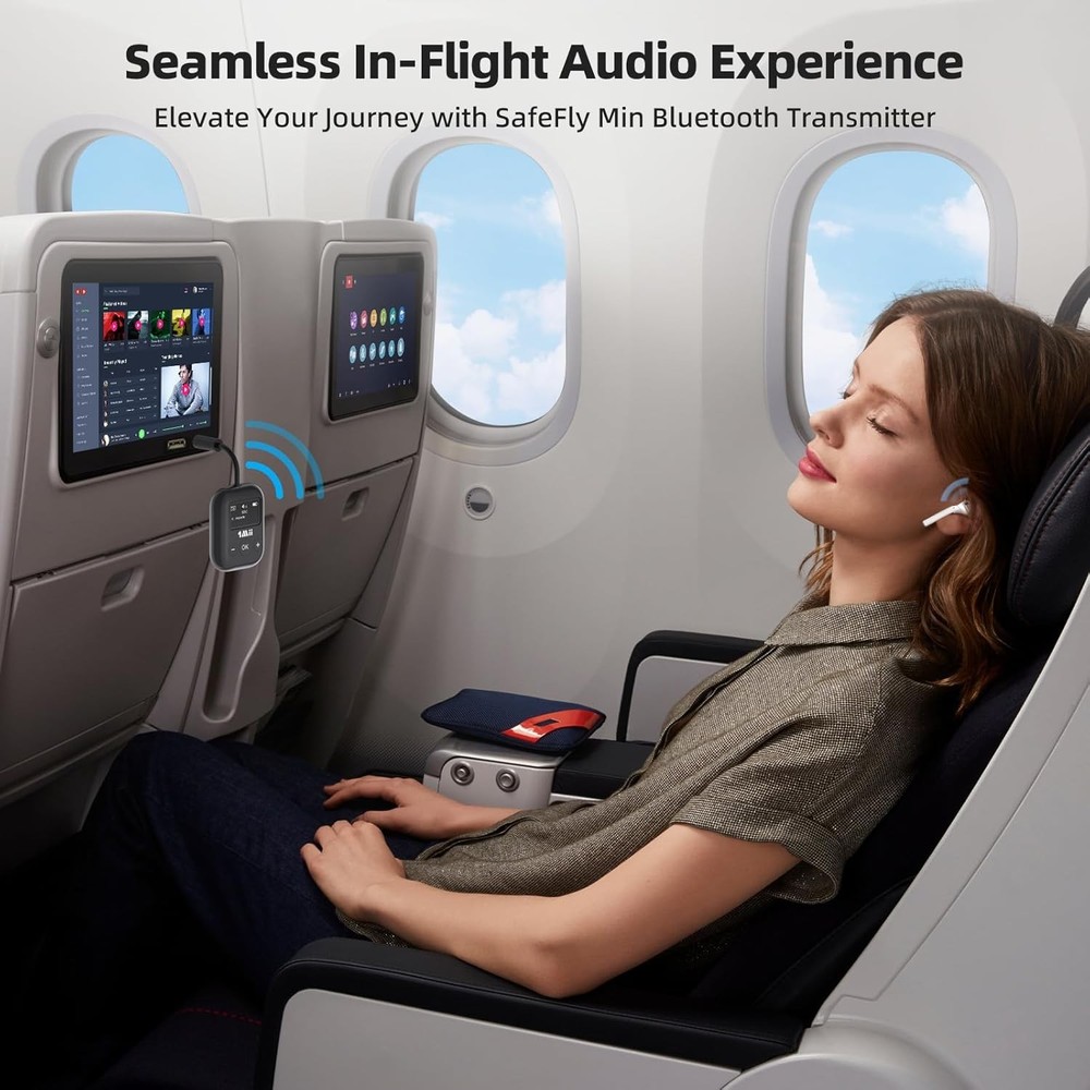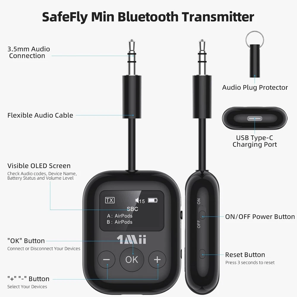 Airplane Bluetooth 5.3 Transmitter for All Headphones - Black Product Details Product Dimensions: 1.38 x 0.39 x 4 inches Item Weight: 2.39 ounces Item model number: RT7027Q1 Batteries: 1 Lithium Metal batteries required. (included) Manufacturer: 1Mii Brand: 1Mii Hardware Interface: 3.5mm Audio Color: Black Compatible Devices: Computer, Gym Equipment, Gaming Devices, TV, MP3 Player, Portable DVD Player, Airplane, iPad, Tablet Product Dimensions: 1.54"L x 0.55"W x 4.07"H Data Link Protocol: Bluetooth 【Bluetooth Adapter for Airplane】The 1Mii SafeFly Min 3.5mm Bluetooth transmitter is designed to transmit audio from in-flight entertainment systems to headphones, it up to Bluetooth headphones simultaneously. Besides, this Bluetooth airplane adaptor is compatible with any audio device featuring a 3.5mm audio jack, including computers, gym equipment, gaming devices, TVs, MP3 and portable DVD players.Note:This product is not compatible with Airpords Pro Gen 2. 【OLED Visible Bluetooth Transmitter for TV】1Mii SafeFly Min Bluetooth transmitter, its ease of use is unparalleled, thanks to the OLED screen that not only displays real-time battery capacity and volume levels but also shows the paired devices and audio format like SBC/aptX-HD/LL/AD. This feature eliminates all guesswork, enhancing your audio streaming experience remarkably. 【Low Latency High-Fidelity Audio】Experience crystal-clear sound with our Bluetooth transmitter for airplane, featuring the unique AptX Low Latency Technology. With latency reduced to less than 40ms, enjoy distortion-free audio that enhances your listening experience. This cutting-edge technology ensures seamless connectivity, especially when paired with aptX-enabled devices. Note: Your paired device must also support AptX LL for optimal performance. [Bluetooth 5.3 Plug and Play] 1Mii SafeFly Min airplane Bluetooth adapter features Bluetooth 5.3 technology, delivering a robust wireless signal and seamless, barrier-free transmission for up to 20 meters. Enjoy the freedom to move around freely on planes or at home, immersing yourself in wireless audio bliss. 【Extra Notes】①It is a Bluetooth Transmitter ONLY. ②To ensure optimal battery life, the transmitter will automatically power off if there's no Bluetooth connection or audio stream for more than 5 minutes. Simply restart the transmitter when you're ready to use it again. ③SafeFly Min feature industry leading aptX Low Latency Codecs, to avoid latency issues, make sure your device supports Bluetooth 5.3. 【Extra Notes】Please note that our product is not suitable for musical instruments such as hearing aids and guitars and APTX mode requires the device you are paired with to also use low latency mode