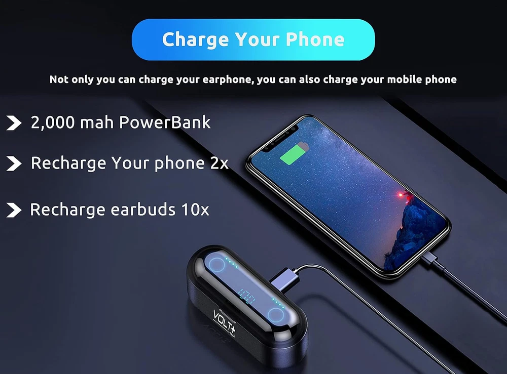【SPECIFICALLY DESIGNED WITH POWERBANK】: This is specifically Compatible with Samsung Galaxy S24/Ultra/S23/S23+/S23 Ultra /S22/Ultra/S22+/S21/Ultra/S21+/S20/5G /Galaxy A/Note/Z Flip & Fold Built in 2000mah Charging base for this earphone and mobile phone. Second: Operational function upgrade: One touch switch previous/next song & volume adjustment & wake up. 【COOL LED SCREEN】: Bright Bluetooth LED display will clearly show the accurate power level of the charging box and the earphone, this way you can better arrange the future management of the headset, and will not worry about the earplugs without power/electricity. 【CHIP WIRELESS UPGRADE】: Upgraded using the NEWEST digital optimized 5.3 Authentic Certified Bluetooth Chip, Pick up the automatic boot and matching. CVC 8.0 intelligent noise redution,Enjoy HD call effects without being affected by noisy environment. 【IPX7 WATERPROOF AND 8D BASS】: Daily life waterproof, support rainy outdoor sports, gym sweating, let you enjoy music in sports.Enjoy the HIFI scene and enjoy the immersive 8D stereo surround sound effect 【WHAT YOU GET】: You will get a 2,000Mah Enabled PowerBank with up to 24h of Life for your Portable Bluetooth Volt Plus Tech Version F9 TWS earphone with a Power Pack Storage Gift box, and the charging bank headset can charge for over 24 hours of use. Product Description 1 CVC Noise Reduction 2 Earfix Secure-Fit 3 Crystal Clear Sound 4 Hi-Fi Audio Experience 5 Fast Bluetooth Connection The video showcases the product in use. The video guides you through product setup. The video compares multiple products. The video shows the product being unpacked. 1 IPX7 Water Resistance 2 Bright LED Display 3 Long Lasting Battery 4 What's in the Box