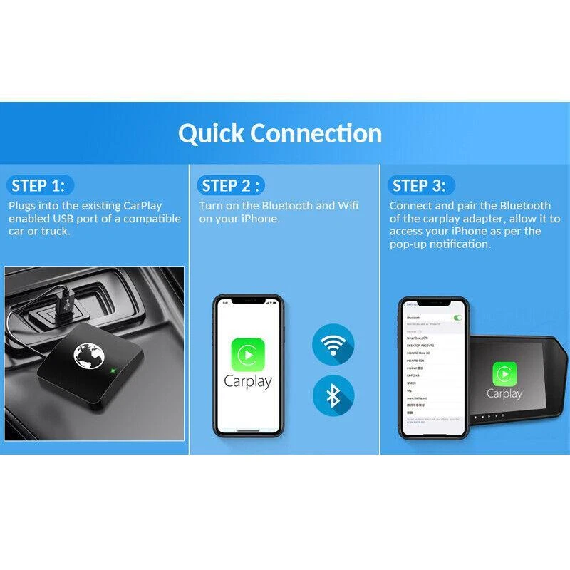 UPC: Does not apply Input DC: 5V 1-2.1A Product Name: Wireless Carplay Adapter Mobile phone: iPhone ISO10 and above Feature 2: Apple Car Play makes driving smarter Car models: Car models has OEM wired Carplay Feature 1: Support Apple system. Universal Fitment: Yes Brand: Unbranded gtin13: Does not apply C onnection method: Bluetooth & Wifi Package Included: 1 xWireless carplay +1 xType-C data cable Output DC: 5V 1-2.1A