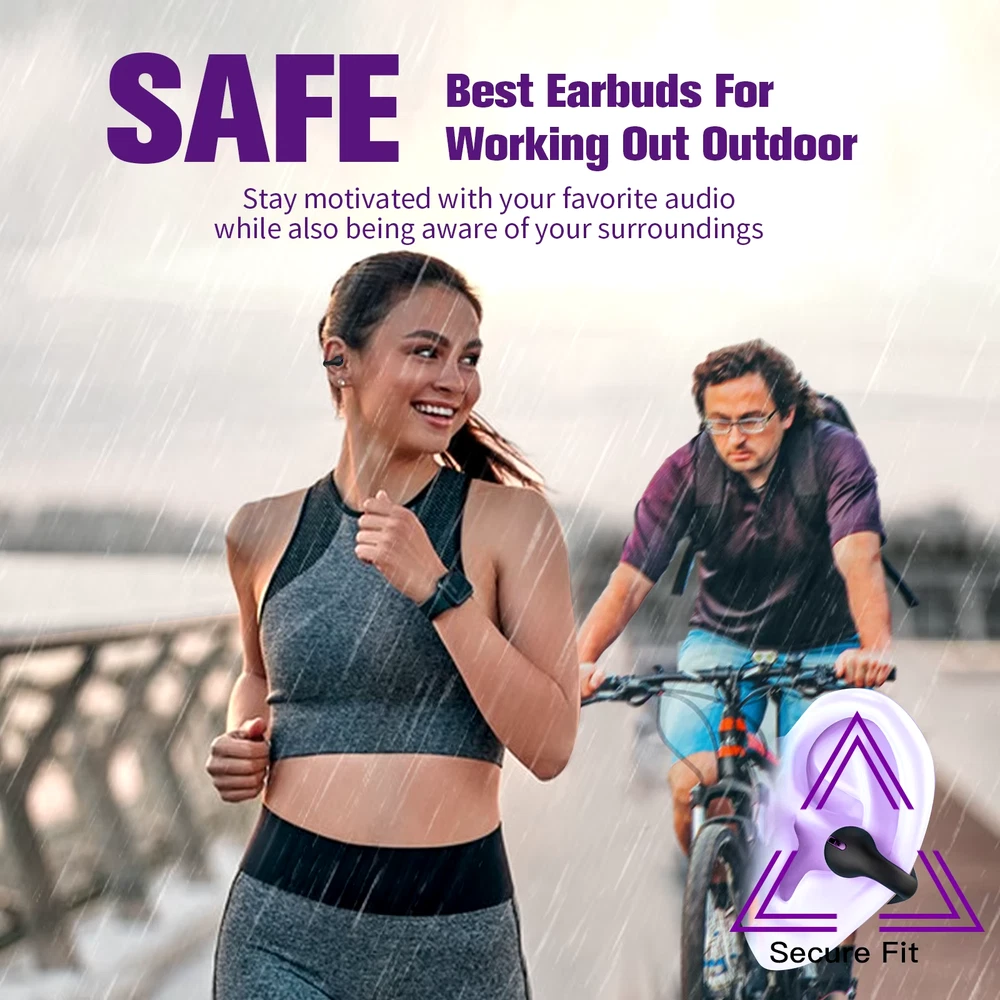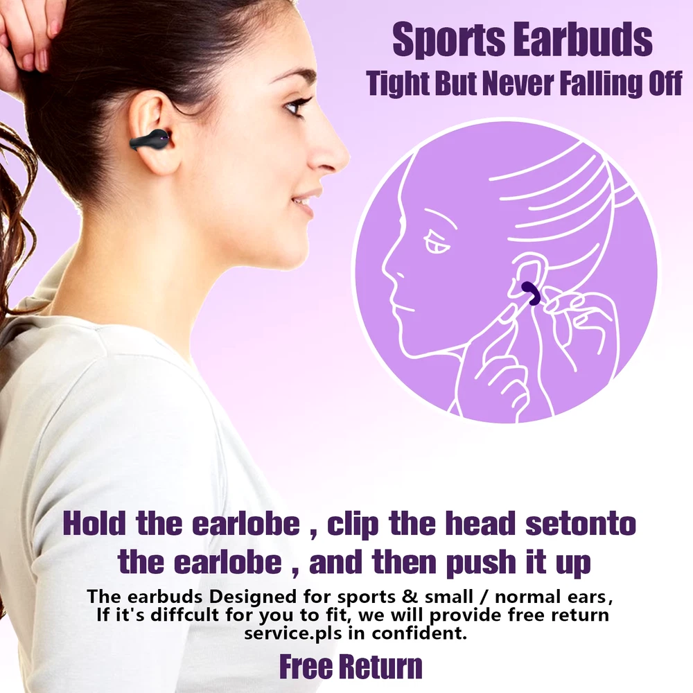 About this item 《Open Ear Safety connection》 In contrast to over ear Earbuds,Open Ear wireless ear clip bone conduction bluetooth headphones allows sound to reach the inner ear through the ear bone,effectively protecting the child's and yours Hearing,Earbuds that don't go in your ear help you have a safer life,stay motivated with your favorite audio while also being aware of your surroundings. 《Random Use Single / Two Earbud》 Upgraded technology allows you to randomly pick one mini earbud (either left or right) for instant use when you are driving on the road or working in the office, with no need to worry if it’s the master earphone and working right away. 《0.13 OZ Lightweight & Soft Wear & Stable Fit》 Our wireless sport earphones clip on headphones made of premium soft silicone,weigh 0.13 OZ,Ergonomic and comfortable,open ear earbuds keeps running relax,Pain-free design.Compared with over the ear headphones, wireless clip on bone conduction running headphones help you Feel free to wear,even if you wear glasses. 《5 Hours Play & Suitable for the Crowd》 Bone conduction headphones bluetooth USB charging and include 400mAh battery, enjoy 5 hours of non-stop music or podcasts,Suitable for people who like outdoor sports, such as running, hiking, cycling, etc.; Open ear headphones are suitable for wearing headphones all day long, need to protect their hearing. 《Clear Call & Premium Sound Quality & Ultra-low latency》 Earclip Bone conduction headphones,Advanced bluetooth 5.3 headset connects to your mobile phone or other devices faster and more stably than Bluetooth 5.0,it can greatly reduce natural sound leakage and offer you a premium sound quality. 2 Built-in microphone achieves clearer phone call,allowing you to hear crystal clear calls like you are communicating face to face with others. 《Automatic Pairing & Smart Touch Control》 Open ear headphones adopts automatic switch. After first connection, wireless ear clip headphones will connect with your device once you open the charging case, which is faster and more convenient. During using, you can touch either earbud to control the phone, such as the music switch, volume adjustment, phone calls, voice assistant, etc.It is compatible with IOS, compatible with Android smartphones, compatible with Macs, computers or laptops.