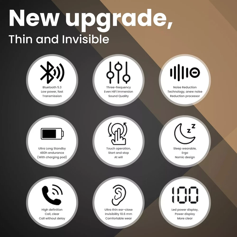 Inear Bluetooth Earbuds Headset TWS5.3 Wireless Earphone Invisible for All Phone Note:the earbuds is not in the earphone case,individually placed in blisters 100% brand new and high-quality made. Totally wireless high-performance earphones with stable Bluetooth 5.3 connection. Designed to be mini and light, they are suitable for long time wearing and will not cause any discomfort, and are extremely comfortable. You can sleep with the earbuds on, the U-shaped rubber skin-friendly ear caps make the earphones fit your ears all night without any discomfort. Equipped with touch control, you can easily switch between pausing music, answering calls, rejecting calls, or tracking music with the touch of a finger. Up to 10 hours of listening time and talk time (more than 70 hours with charging case). Reinforced design for sweat & IP5 water resistance. Great for workout & daily use. Specifications: Bluetooth Version: 5.3 Bluetooth Protocol: HFP1.7,1.2, A2DP1.3, AVRCP1.6, SPP1.2 and PBAP1.2, BDR/BLE Transmission Distance: 10M Rated Power: 50mW Power Amplifier Type: Chip built-in Receive Sensitivity: 120dB Impedance: 32Ω Frequency Response: 20-20KHz Battery Capacity For Earphone: 60mAh, 3.7V Charging Case: 950mAh, 3.7V Charging Time (h): About 2 hours Taking Time: 9-10 hours Standby Time (h): 120 hours Charging Criteria: With Charging Case Package Includes: 1x Set of Bluetooth Earbuds 1x Charging Box 1x Charging Cable 1x User Manual