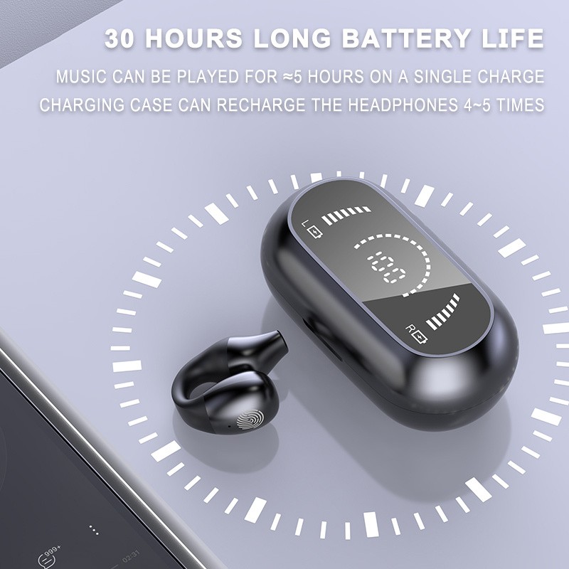 Product Description If you have any questions, please contact customer service first, do not open disputes easily, thank you! Features: 1. Open the world of music at any time: reject the tedious connection process, manually connect the headphones once and then remove the charging case, the headphones can be connected automatically. 2.Compatible Blue-tooth 5.3: more stable audio transmission and longer transmission distance. 3.30 hours long battery life: the headphones can continue to play music for ≈ 5 hours on a single charge, and the charging case can recharge the headphones 4~5 times. 4. Ear clip wearing: another silicone material support, comfortable not to press the ear, sports not easy to fall. 5. Smart touch: operation is no longer cumbersome, cutting songs, answering calls, summoning voice assistants, etc. can be operated with one key. Specifications: Charging capacity: 200mah Headset capacity: 35mah Compatible Blue-tooth version: 5.3 Speaker: 16±15%ohm (<5MW) Charging time: 1h Working distance: 10-15m Charging compartment input: 5V/300MA Charging interface: Type-c Weight: 85g Product Use: Wake up voice assistant: long press on left ear for 1 second Play/pause: click Answer/hang up: touch once Switch on/off: long press for 3-5 seconds Previous song: Double click on the right ear Next song: double tap left ear Increase volume: triple tap right ear Decrease volume: triple tap left ear Package Includes: 1*Ear Clip Headphones Note: 1. Due to manual measurement, please allow 1-3mm error. Please make sure you don't mind before ordering. 2. Please allow 1-3 gram weight error. Please make sure you don't mind before ordering. 3. Due to different lighting in the photos and differences in monitors, the pictures may not reflect the actual colour of the object. Please make sure you don't mind before ordering, thank you! About Us We accept all payments authorized by eBay. powered by