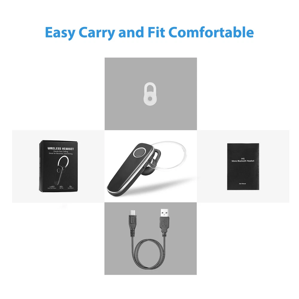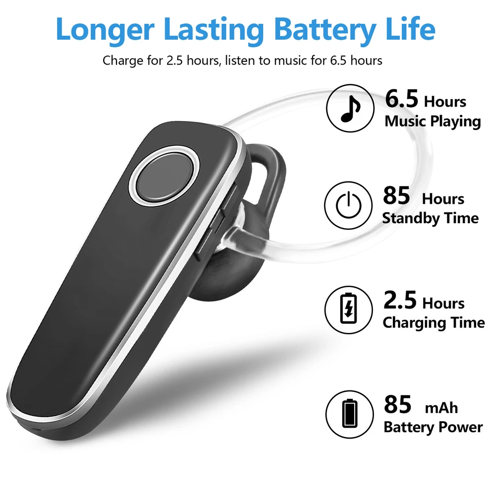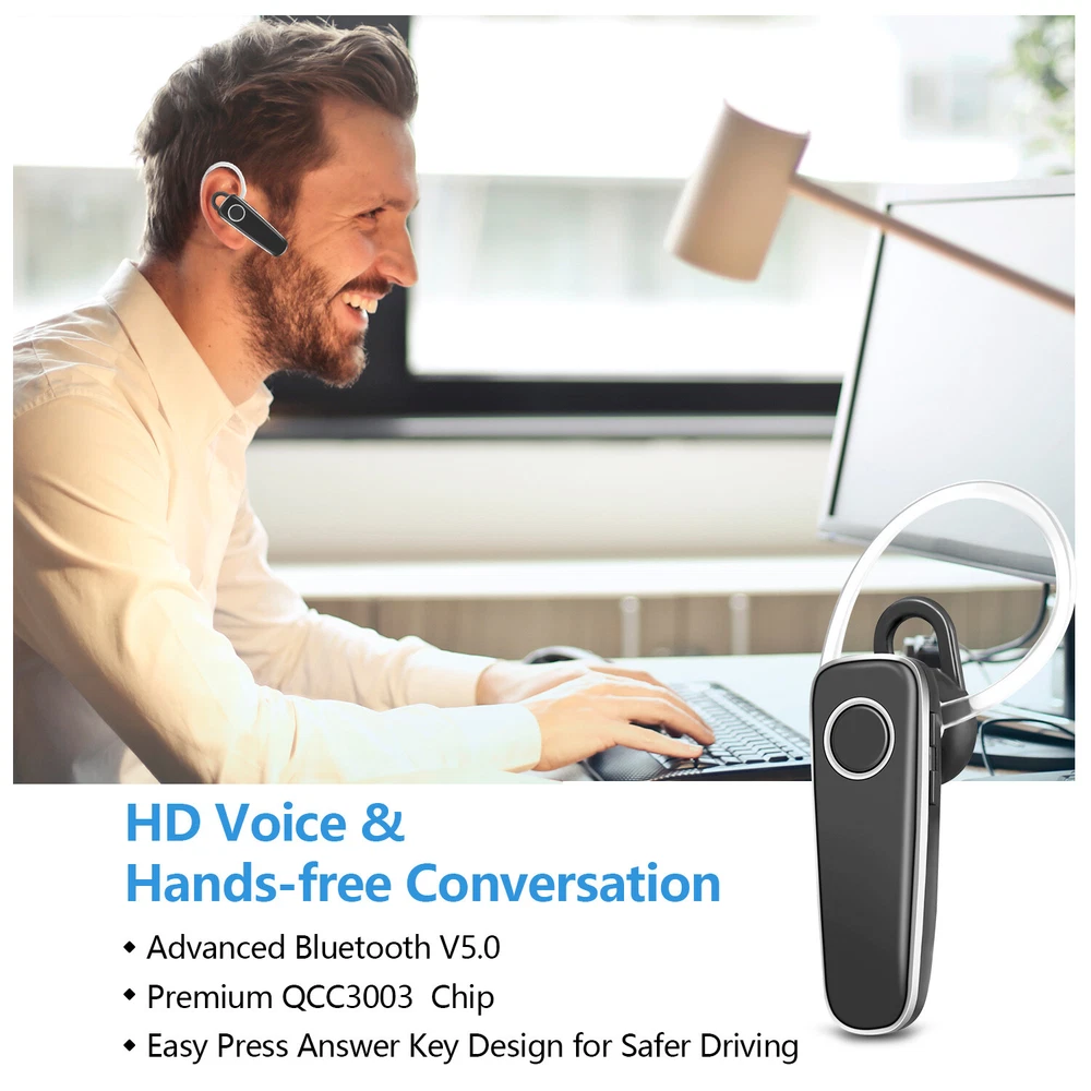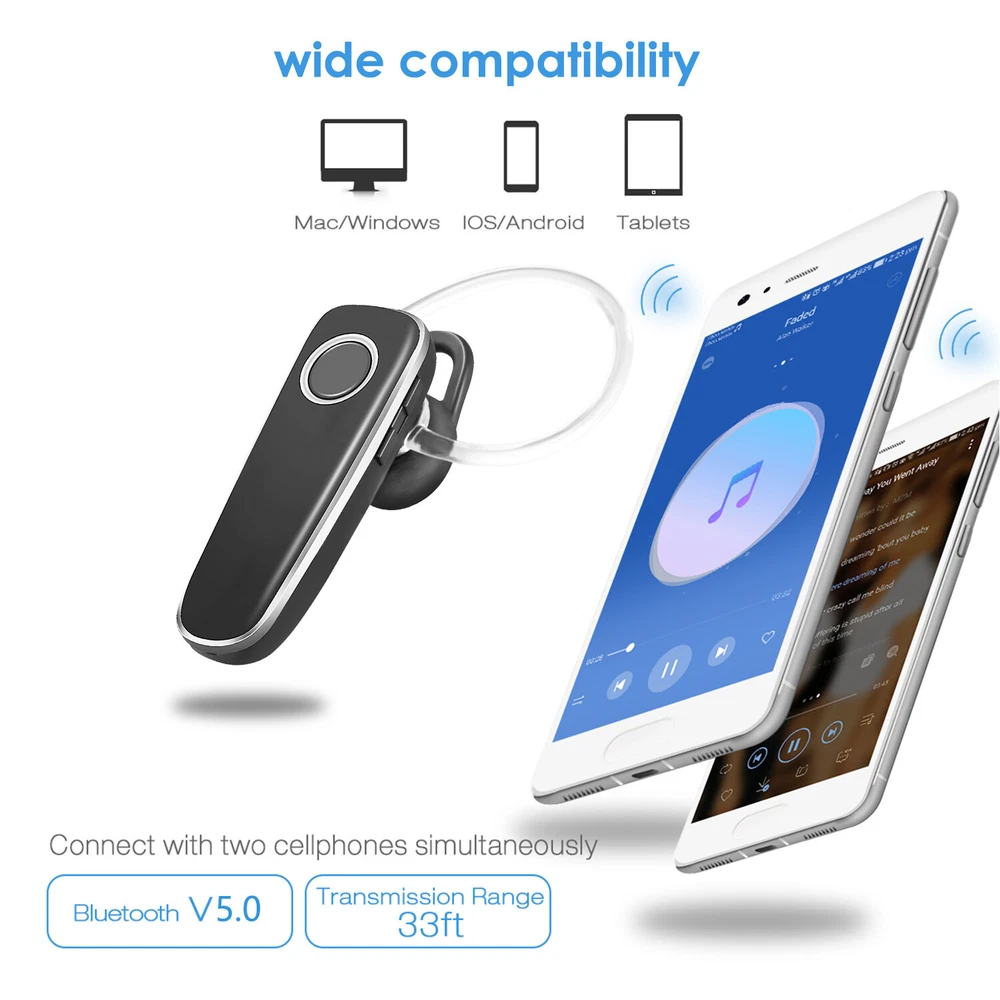 Description This hands-free headsets employs CVC 6.0 Noise cancelling technology, builds for a clear chat. Besides, you can also enjoy your music to relax with it when you on the way, on the train/bus or other occasions. This wireless headphones can offer you 6.5 hours talking time and 140 hours standby time with fully charged in 2.5 hours. It can connect with 2 devices at one time. Ideal for driving or not wanting to miss the sound around you. Latest Bluetooth 5.0 & HD Sound Quality. Compared to other Bluetooth headphones with Bluetooth 4.1 or 4.2, wireless earbuds adopt Bluetooth 5.0 to ensure stable connectivity and smooth transmission in high speed and long distance with low consumption. Comfortable to Wear. Do our best to suit everyone's auricle after scanned hundreds of auricle simple to more comfortable to wear, conforms naturally to the shape of the upper ridge of your ear. Easily handling with hands free calls, siri activation, next& previous track, pause& play music. Super musical outputs are light and comfortable to wear, perfect for business, sport, jogging, running, biking, hiking, gym exercise. Specifications: Bluetooth Version: 5.0. Declaration ID: D044412. Bluetooth chip: CSR 8615. Support agreement: A2DP, AVRCP, HSP, HFP. Weight: 0.35oz/10g. Battery: 3.7V, 85mAh. talking time: 6.5 hours. Music time: 6.5 hours. Standby time: 140 hours. Charging time: 2.5 hours. Working environment: -10-50℃. Multi-point with 2 Device: Support. Valid distance: 10m. Features: Noise Cancellation, Rechargeable, Hands free. Apply: Driver, Call Center, Skype Chat, Conference Calls, Listen to Music, Sports and More. Using this Bluetooth headset, it's very comfortable to make and receive any CALLS, enjoy your MUSIC for relax. Connections: This wireless headset can be connected with any device that is Bluetooth wireless technology enable and connect with 2 devices at one time when you have 2 smart phones or other devices. Bluetooth 5.0 Wireless Headphones Built-in Mic and Noise Canceling Stereo for iPhone and Android. Package includes: 1x Bluetooth earphones 1x USB charging cable 1x User Manual