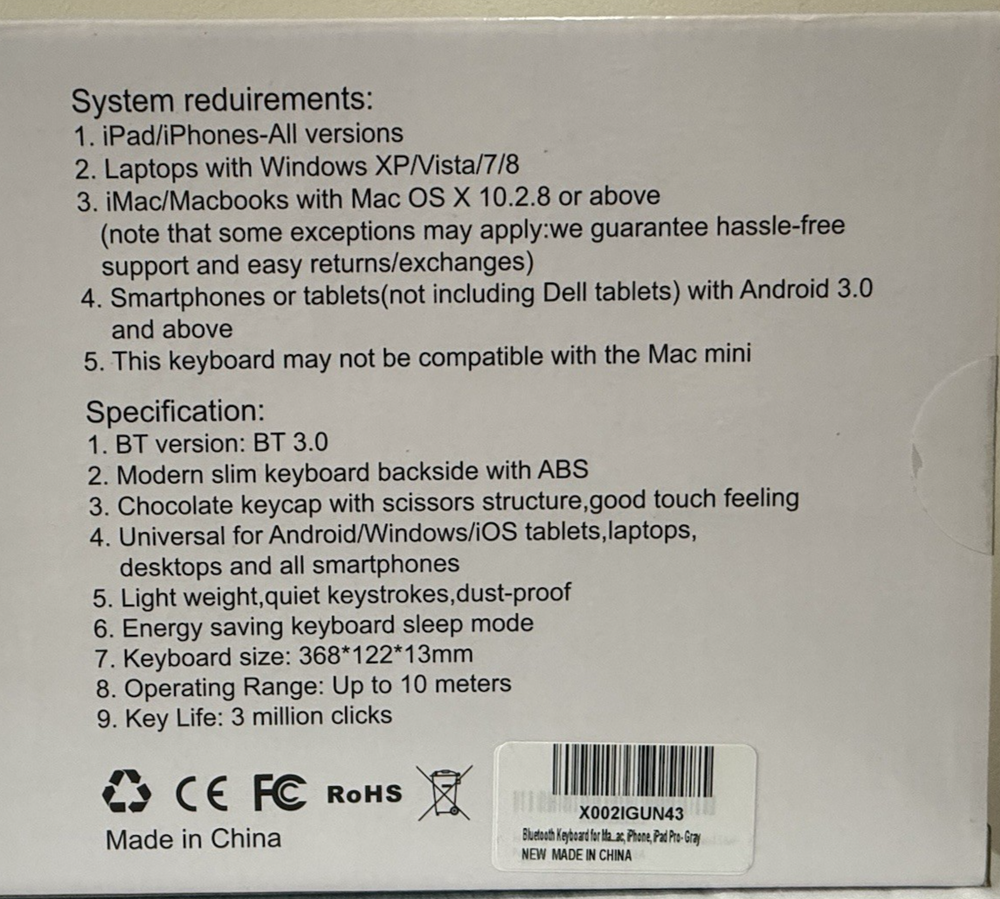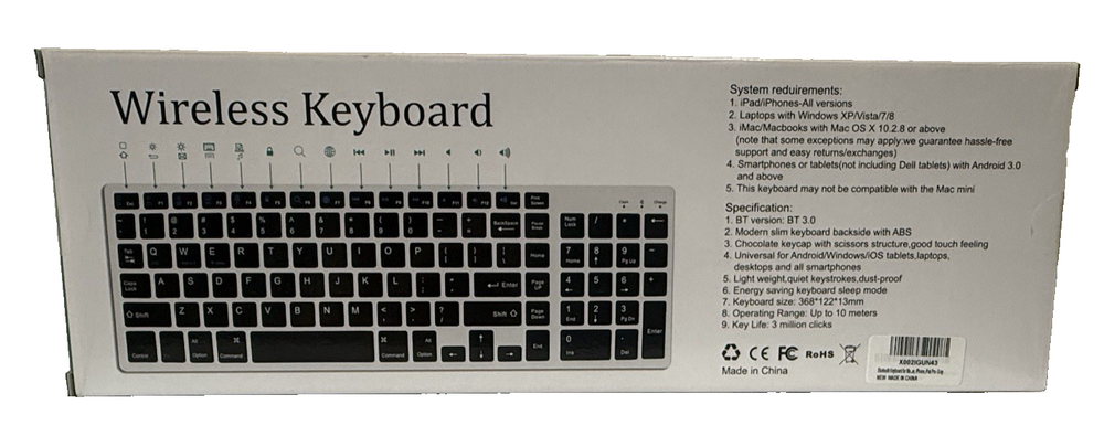 FAST FREE SHIPPING IN USA!!! ORDERS RECEIVED BEFORE 2PM - SAME DAY SHIPMENT!!! AFTER 2PM - NEXT DAY SHIPMENT!!! OUR WAREHOUSE WORKING MO-SAT(9am-9pm) CLEARANCE! Wireless Bluetooth Keyboard β Slim, Lightweight & Universal Compatibility Upgrade your workspace with this modern Wireless Bluetooth Keyboard , designed for comfort, style, and seamless connectivity. Featuring a slim aluminum-style body , quiet scissor keys , and Bluetooth 3.0 technology , it connects instantly to your laptop, tablet, or smartphone without the need for extra dongles or cables. π§ Key Features πΉ Universal Compatibility β Works with iPad, iPhone, Android, Windows laptops, tablets, and MacBook devices. πΉ Bluetooth 3.0 Connection β Fast, stable pairing with up to 10 meters (33 ft) range. πΉ Slim & Lightweight Design β Compact size fits easily into any bag for travel or office use. πΉ Quiet & Smooth Typing β βChocolateβ scissor-switch keys for a soft, responsive feel. πΉ Energy-Saving Mode β Automatically enters sleep mode when not in use to extend battery life. πΉ Durable Construction β Built with ABS material for long-lasting performance and up to 3 million keystrokes lifespan. πΉ Dust-Proof Surface β Keeps keys clean and responsive over time. π Specifications Attribute Details Condition New Type Wireless Keyboard Connectivity Bluetooth 3.0 Operating Range Up to 10 meters Material ABS Plastic Keyboard Size 368 Γ 122 Γ 13 mm Key Life 3 million clicks Power Source Rechargeable (USB) Compatible Devices iPad, iPhone, Android, Windows, Mac Color Black with Silver Trim Features Slim, Quiet, Energy-Saving, Portable Country of Origin China π Fast & Free Shipping from New Jersey β Brand New β’ Factory Sealed β’ Fully Tested β Compatible with iOS, Android & Windows Devices β Ships same or next business day