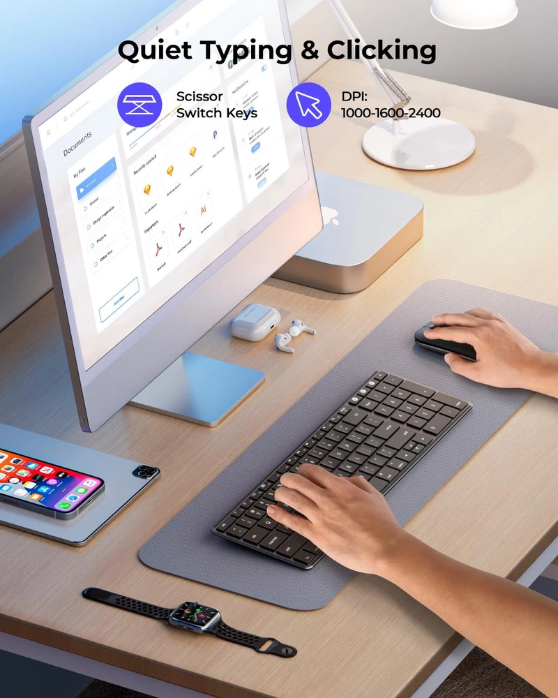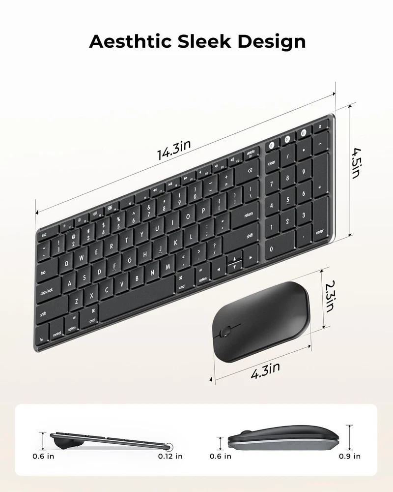 Perfect for Apple Users: The Bluetooth keyboard and mouse is designed for Mac users with a standard apple layout. With advanced BT1/BT2/BT3 modes, this combo allows you to easily type across three devices, perfect for your iMac, MacBook Pro/Air, iPad Type-C Rechargeable Battery: Say goodbye to constantly changing batteries! Our combo features Type-C rechargeability, it provides an standby time of up to 200 hours. Auto-sleep mode and on/off design also keep a low consumption Whispered-Quiet Typing and Clicking: With increased key stability to reduce noise and optimize responsiveness, the wireless keyboard and mouse give you that satisfying “click” feel, but not to hear it, perfect for those who are productivity-focused Slim Metalic Appearance: Ultra-thin design with only 0.12 in for keyboard and 0.9 in for mouse, which is easy to slip into your bag. The combo are made from stainless steel and premium ABS materials, making them a beautiful decoration on your desktop Wide Compatibility and 12 Months Warranty: Compatible with Mac OS 10.15 or above, iPad OS 13 or above, and iOS 13 or above. And this keyboard and mouse set enjoy 12-month warranty, welcome to contact us if you have any issues with the order