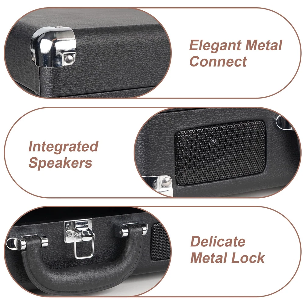 Flexible record player for your home The record player works as a stand-alone record player with integrated stereo speakers. Alternatively use the USB port to connect the player to your PC and use it as a USB record player, recording and converting your favourite vinyl to WAV or MP3 format for your MP3 player. If you want to connect it to your home stereo, no problem too, with stereo phono outputs on the rear can simply and quickly be connected. Stylish design & portable This one is built in to a stylish vintage styled briefcase / suitcase design and bound in a leather look finish with chrome coloured fasteners and black interior. Not only does it look great but it makes it incredibly portable too. 3 speed record player An absolute necessity for any record player is that it can play all your vinyl. It is switchable between 33 1/3, 45 or 78 RPM so will support your whole record collection. Includes record player, USB cable, mains power cable, CD with Audacity audio software & manual Wireless Bluetooth Connection: The built-in Bluetooth speaker can play MP3 audio or smartphone audio through a powerful Bluetooth transmission connection. The Bluetooth signal is stable and the connection is faster, allowing you to enjoy your favorite music more freely. Three-Speed Turntable: Supports three playback speeds (33-1/3, 45 or 78 RPM) and three record sizes (7"/10"/12"). The turntable includes a 45 RPM adapter. Built-in HD Speakers: 2 built-in stereo speakers. The turntable can also be connected to external home speakers via RCA outputs. Equipped with a 3.5mm headphone jack for connecting headphones. Auto-Stop Switch: Stops spinning once the record reaches the end of the record. Quick mode switching (Bluetooth/auxiliary input/phono) for your convenience. It is perfect to use when you need to relax, party and party etc. Audio conversion: Convert analog audio signals from vinyl records to digital audio files, such as MP3, WAV and other formats.