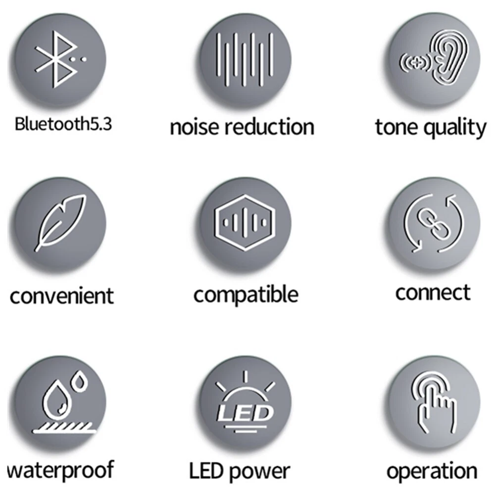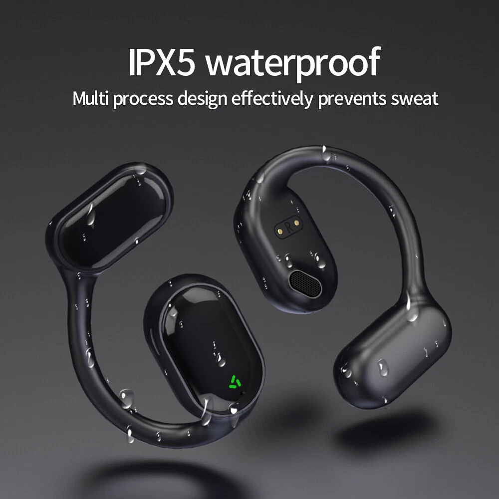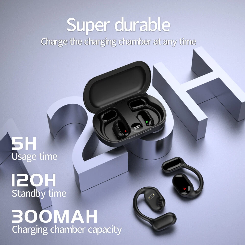 True Wireless Bone Conduction Headphones Bluetooth 5.3 Wireless Headset Earbuds 100% brand new and high-quality made. This is the first true wireless bone conduction earbuds, the very first of it's kind. Our bone conduction technology and open fit design delivers music through your cheekbones while ensuring your ears remain completely open to ambient sounds for maximum situational awareness during long-term wear. Stable Bluetooth 5.3 connectivity and convenient multipoint pairing compatible with your iOS and Android smartphones, tablets, Macs, PC computers and laptops. The large dynamic diaphragm is used for directional audio transmission without loss, creating a realistic surround sound field. Titanium wraparound headbands are lightweight and flexible to ensure maximum comfort during extended wear. These bone conduction headphones deliver wide dynamic range, rich bass and premium sound experience. Compact, slim fit design allows you to enjoy continuous music and calls for six hours at a time. Repels sweat, dust and moisture throughout your indoor or outdoor exercise routine. Easy read display on side of the headset, you'll know how much battery left. Specifications: Color: Black Battery Capacity: 50mAh Charging Case Battery Capacity: 300mAh Standby Time: 10 D ays Listening Time: 5 Hours + Additional 30 Hours From Charging Case Charging Time: 1.5 Hours Bluetooth Version: V5.3 Transmission Distance: 10M Charging Voltage: 5V Headset Weight: 15g Package Includes: 1x Bone Conduction Headphone 1x Charging Cable 1x Charging Case 1x User Manual