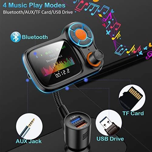 Return Policy Fast Delivery Trusted seller Wireless Car Bluetooth Adapter,Radio FM Transmitters HandsFree Call Receiver and MP3 Music/APP Audio Play,QC3.0 and Smart 2.4A Dual USB Charger,1.8" Color Display,Aux Port,TF Card Product Description [UNIQUE BLU-RAY &1.8" DISPLAY] Larger and clearer color display featuring LED color screen show music mode, FM channel, car battery voltage, volume, with Blue colors led backlit that it can offer visual enjoyment; 360-degree flexible gooseneck to offer a more comfortable visual interface. [HANDSFREE CALLS] The Bluetooth FM transmitter for car have the latest Bluetooth 5.0 provides a stable connection; Built-in microphone with advanced CVC noise cancellation reduces background noise for clearer calls; Answer calls phones safely with one , reducing interference while driving. [FOUR MUSIC MODES] The car Bluetooth transmitter can play your favorite songs on the car stereo through 4 methods: Bluetooth devices, USB Flash Drive(≤32GB), TF Card(≤32GB), Aux(3.5mm Jack). The music adapter can bring you an auditory experience with its clear and stereo sound. [DUAL USB CHARGING] The car charger with a QC3.0 and 2.4A charging port, Input 12-24 V,Supports 2 USB ports to charge 2 devices simultaneously.The smart output current pairs most cellphones or tablets. Safely charging to your device without damage to the battery with this Bluetooth radio transmitter. [WIDE COMPATIBILITY] The radio adapter works well with most Bluetooth enabled devices, such as iPhone, iPad, iPod, Samsung, HTC, Sony, LG, Google phone, tablets, and smartphones, etc; And it will fit most of Cars or Trucks(voltages among 12-24V). Shipping Returns Payment Shipping Shipping is FREE to all addresses other than APO/PO boxes in the lower 48 states. All our stock ships from US-based warehouses. Shipped via USPS or UPS (depending on location and package weight) Unless stated otherwise, all orders will ship within 24-72 hours of your payment being processed. Check our feedback to see the great reviews of FAST shipping we offer. Returns Seller does not accept returns Payment We currently accept payment via eBay managed payments only. Once payment is cleared, we will dispatch your shipment within 1-3 business days. Please refer to the "Shipping" tab for more information regarding shipping speed to your destination.
