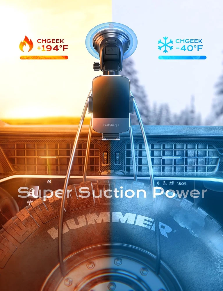 【15W Qi Fast Wireless Charger】CHGeek's upgraded chip ensures intelligent and safe charging for your Qi-enabled device at the fastest speed. It supports 15W Max Charging Speed for Google phone/LG V60/V50/V40/V30+, 10W Fast Charger for Samsung Galaxy S24 Ultra/S23/S22/S21/Note 10+, 7.5W Fast Charger for iPhone 16/15/14/13/12 Pro Max/11/XR/XS, and 5W for other compatible phones. Requires QC 3.0 Car Charger Adapter (not included) for 15W, 10W, and 7.5W fast charging. Includes 1 USB-C charging cable. 【Intelligent Identification & Smart Charging】Experience effortless and safe driving with our phone car mount. It automatically clamps your phone when connected, providing convenience and enhanced safety. The charger's arms open with a simple touch on the 2 sides button. Plus, it intelligently powers off and protects your phone's battery when it's fully charged 【Foreign Object Detection With Led Alarm】Our wireless car phone charger prioritizes your phone's safety. If a metal substance is detected between the charger mount and your phone, it immediately stops charging and flashes a red light to alert you. This innovative feature effectively prevents damage caused by metal-induced high temperatures 【Case Friendly & Flexible Angle Adjustment】Enjoy hassle-free charging through phone cases up to 6mm thick with our CHGeek phone holder for car. Please note that metal cases, magnets, credit cards, grips, and stands may interfere with charging. For optimal viewing and safe driving, the 360° rotating sphere and retractable & foldable bracket allow you to adjust the angle to your preference 【2-In-1 Design】Simplify your life with our versatile wireless charger and car cell phone holder. It ensures a secure hands-free experience, eliminating the hassle of tangled cords or cables. Our cell phone holder is compatible with car windshields, dashboards, and air vents, making GPS navigation and phone calls more convenient than ever Product Description Please read the following information carefully before purchasing: Please ensure your phone supports wireless charging. Incompatibility case: If your phone case thickness is ≥4mm (0.16 in), or uses an OtterBox case (too thick), it may cause overheating or other anomalies during charging. For leather cases, as they do not dissipate heat well, it is normal that the surface temperature of the phone during charging is higher than with silicone or transparent cases. When attaching the wireless charger suction cup to the dashboard, make sure to choose a flat area and press the suction cup tightly before locking it. Wait 30 minutes after installation before placing the phone on it for better adhesion and to prevent falling off. If the arm clamp occasionally cannot secure the phone, it's probably due to the phone being placed at an angle. Adjusting the phone's position should resolve this. If your phone's rear camera is against the charger surface and it doesn't charge or charges intermittently, it indicates that the wireless charger may not be compatible with your phone. Should you require more information, we are available. If the charging speed is slower than expected when using the wireless charger in a car, it could be due to high in-car temperatures and running map or music apps simultaneously. The charging power will prioritize the phone's motherboard, with only a small part going to the battery. Once the in-car temperature drops to ≤26℃ (78.8℉), overall charging power will increase, improving the battery charging speed. Please note, a QC3.0 car charger is needed as the device's power source (to be purchased separately).