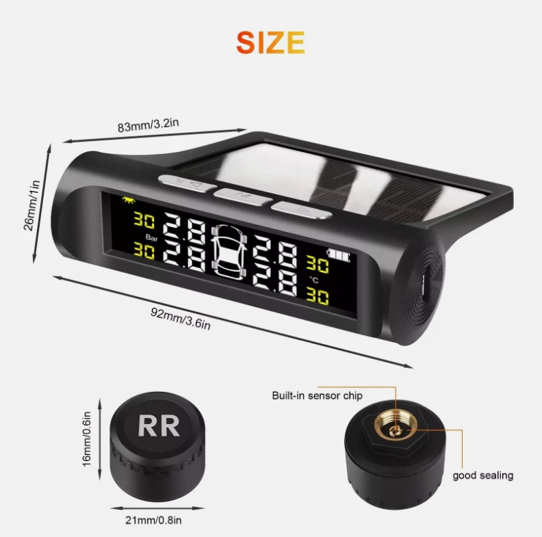 Product Description Real-time Monitoring: The LCD display can clearly display the temperature and pressure of the tire in real time. The temperature and pressure data can be switched (default is 0- 3.5 Bar / 0-50 Psi), the temperature unit ℉ / °C / Bar and the pressure unit: PSI / Bar are optional. Solar Power & USB Charging: Support solar power charging and USB cable charging, do not occupy the car cigarette lighter socket,ensure that the TPMS can work continuously, You don't need to worry about low battery. Intelligent Voice Alarm: When the tire temperature or pressure is abnormal, TPMS will give voice Alarm to broadcast tire problem immediately, you don’t need to stare at the monitor screen to confirm tire problems, Press any button will stop alarming, it is more convenient and safe. Intelligent on and off: It has vibration sensing, After the tire pressure monitoring system is opened, If the tire pressure monitor sensor does not detect vibration, the display will automatically enter sleep mode to save power, it will automatically turn on when the car vibrating. After manually shutting down, you need to manually start it. 4 External Waterproof Sensors: 4 IP68 sensors can be waterproof, dustproof and snowproof, anti-corrosion,good accuracy for measure temperature and pressure, monitor the temperature and pressure of the tires for you, ensure the safety of the driver, and extend the service life of the tires. Specification: Display screen:LCD Operating temperature: -30°C-85°C Working voltage: 3.7-5V Daytime operating current/Night operating current/Standby current:<20mA/<4mA/<50uA Transmission frequency:433.92MHZ+/-20KHZ Transmission mode:FSK Pressure unit: BAR/PSI Charging ways:Solar energy/USB Battery:1*303450 3.7V 500mAh Sensor: Operating temperature: -30°C-85°C Working voltage: 3.7-5V Standby current:<1uA Transmission frequency: 433.92MHZ+/-20KHZ Transmitted power:>8dBm Open Distance:>30M Battery(each sensor):1*CR1632 3V Monitor size: Approx.9.5*8.5cm Sensor size(each): Approx.2*2*2cm Package Included: 1 TPMS Receiver host 4 Sensors 4 Anti-lost nuts 1 Hex spanner 1 Anti-slip Pad 1 User manual Fit for Ford Fusion Ford Escape etc 20PCS M12x1.5 19 mm Wheel Lug Nuts 13.99 USD Free shipping Carburetor Carb Assy For Yamaha A iPower SC2000i 2000/1600 W Inverter Generator 14.99 USD Free shipping 60" Inch Truck Tailgate LED Light Bar Brake Reverse Turn Signal Stop Tail Strip 12.99 USD Free shipping Electric Oil Transfer Pump Extractor Fast Change Transmission Fluid Extractor 17.99 USD Free shipping 2 x Copper Nickel Brake Line Tubing Kit 3/16 OD 25 FT Coil Roll All Size Fitting 19.0 USD 22.35 USD Free shipping 15% off 3.5V-36V Digital Automotive Car Power Circuit Electrical Tester Probe Test Light 16.88 USD 19.99 USD Free shipping 16% off powered by
