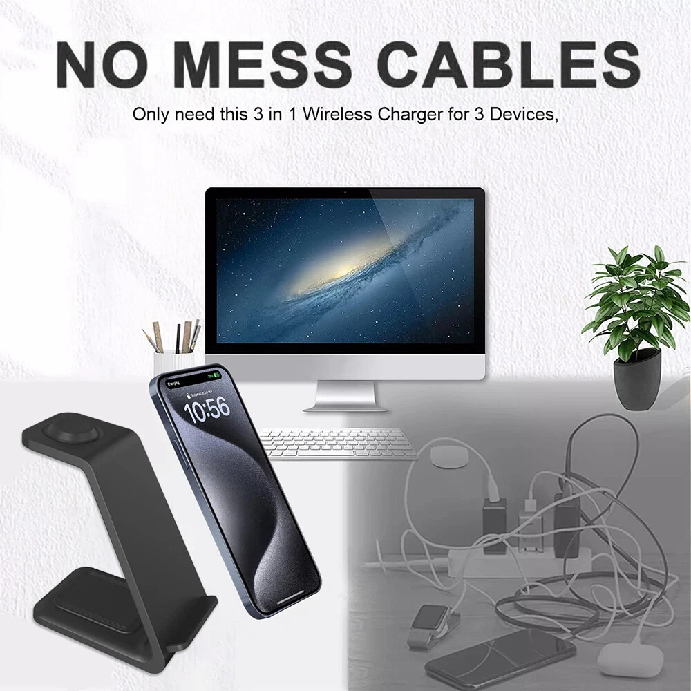 Note: For a fast charging experience, please use a QC 3.0 power adapter (QC 3.0 adapter not included) Features: 1. [Multi-Device Wireless Charging Station] The 3 IN1 wireless charger is specifically designed for charging Apple devices. 2. [With Dual Charging Coil Design] The new 2024 3 in 1 wireless charging station provides a more stable charging experience without intermittent charging or overheating due to mismatches. Increases charging speed and eliminates the hassle of finding the “sweet spot”. 3. [Safe Charging] The wireless phone charger provides temperature control and voltage protection to prevent short circuits, with ventilation holes on the back of the charger to ensure safe and stable charging. Anti-slip silicone pads on the base and bottom protect your device from scratches and slips while charging. 4. [For Apple Watch] For Apple Watch Ultra2, Ultra, SE 2nd, SE 1st, 9, 8, 7, 6, 5, 4, 3, 2 5. [For Apple] For Apple iPhone 15Pro Max, 15 Pro, 15 Plus, 14 Pro Max, 14 Pro, 14 Plus, 13 Pro Max, 13 Pro, 13 mini, 13, 12 Pro Max, 12 Pro, 12, 12 mini, 11 Pro Max, 11 Pro, 11 XS Max, 11 XS Max, 11 XS Max. Pro, 11 XS Max, XS, XR, X, 8Plus, 8, SE 3rd, SE 2nd 6. [Applicable Headphones] For Apple AirPods Pro 2nd, Pro, 3, 2 (Note: Not applicable to Samsung Watch or other brand watches). Specification: *Product Name: 3 IN1 Wireless Charger *Mobile phone output: 5W/7.5W/10W/15W/30W *Watch output: 5W (max) *Headphone output: 5W (max) *Transmission distance: ≤6MM *Charging efficiency: ≥73% *Product Material: ABS *Product color: black/white Package List: 1*3-in-1 wireless charger 1*Type-C cable 1*User Manual Attention: 1. QC 3.0 adapter is not included! 2. Item is limited to charger only, not including headphones, watch! 3. Please allow 1cm difference due to manual measurement! 4. Depending on the light color or monitor hue may vary! On Jan 25, 2025 at 12:07:34 PST, seller added the following information: