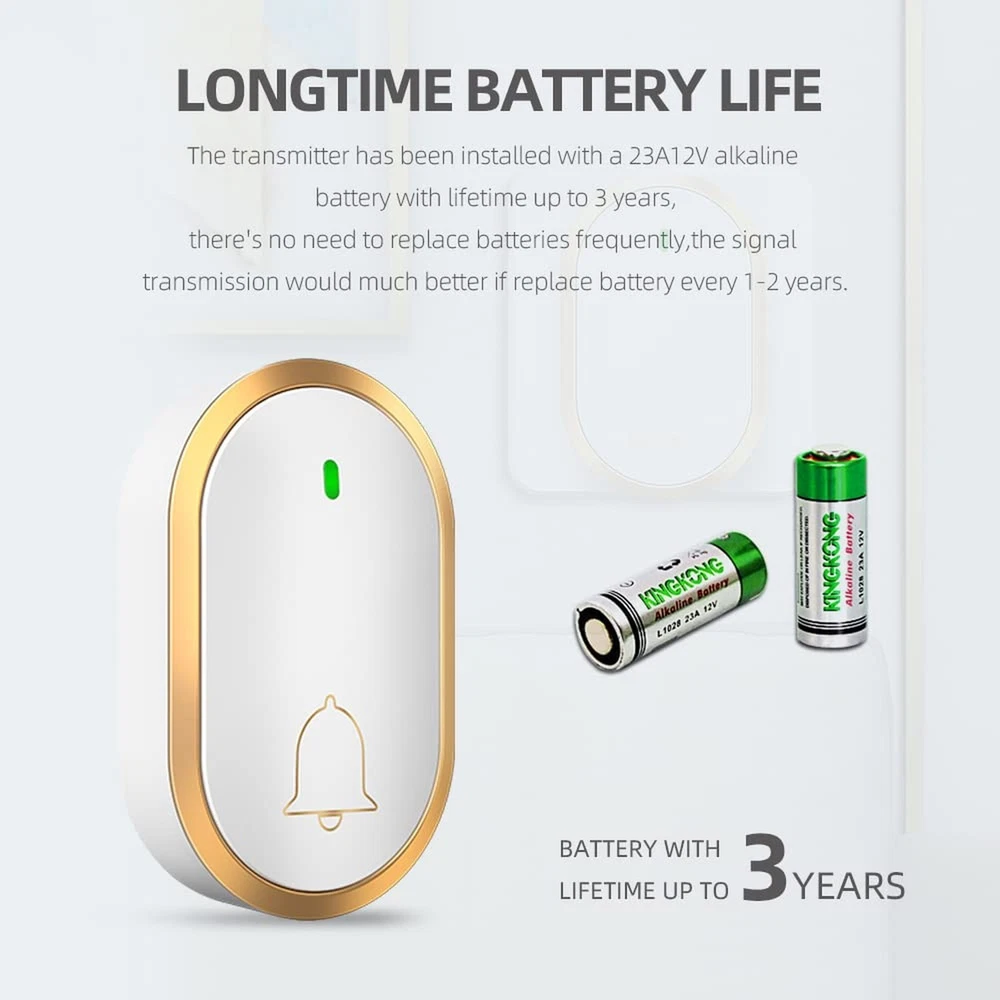 Wireless Doorbells for Home, Doorbell Chime, Wirelss Doorbell in1000ft Range, 60 Chimes, 4 Volume, Waterproof, LED indicator Product Details Color: White+Golden Number of Items: 1 Brand: Bensejk MPN: A68GW UPC: 765015661690 EAN: 0765015661690 Manufacturer: Shenzhen Jingke Zhichaung Co.,ltd Part Number: A68GW Item Weight: 4.5 ounces Product Dimensions: 2.2 x 0.86 x 3.6 inches Country of Origin: China Item model number: A68 Color: White+Golden Item Package Quantity: 1 Included Components: Transmitter, Reveiver Batteries Included?: Yes Batteries Required?: Yes Battery Cell Type: Alkaline Date First Available: September 14, 2024 [Multi-Ringtones and Adjustable Volume]: Take this door bells for homes, there are 60 ringtones and 4 adjustable volume levels for choosing, the voice is loud enough to hear clearly [Long Wireless Doorbell Range]: The reveiving distance is long, up to 1000ft Range in open area. This wireless doorbell transmitter and receiver adopts FM signal, no need wired which has strong anti-interference features and one-to-one signal pairing [Loud Doorbell Kit]: Doorbell Adjustable Sound is from 25-115DB. With Metal speaker, the ringer is loud enough you can hear it clearly in your house. Nice bedroom doorbell [Easy Installation]: Plug the doorbell receiver in the socket and place the Transmitter on the wall, either by double sided tape or screws(See the user guide), easy set up and simple operate. Nice wireless doorbells for home [Water Resistance]: The door bell is steek design, dustproof and waterproof protection, IP44 compliance. Working temperature:-4 F -140 F. The transmitter does not consume power without being pressed and battery life: 3 years [Call Alarm] A Door bell but A Call bell too, It helps alarm and take notice as need, Call from dooryard/upstairs or Call Button Alerts for caregivers