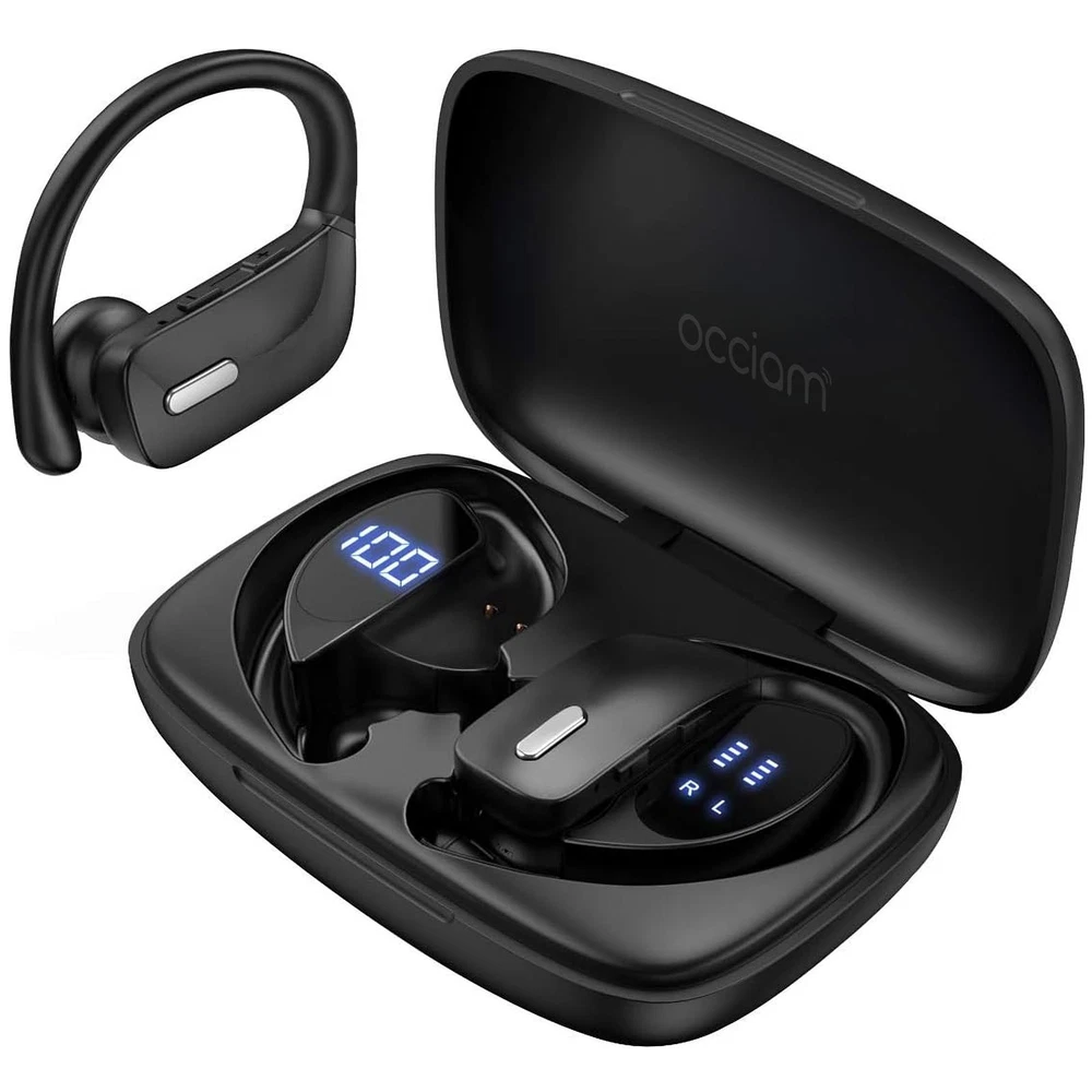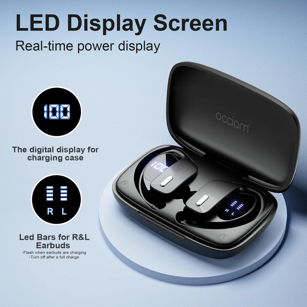 LED Power Display for Charging Case: the wireless Bluetooth headphones' charging case features an LED power display that shows the remaining power in percentage. The charging case displays its battery level from 1% to 100%. While charging the right or left wireless ear buds earbuds Bluetooth, the LED bars for the earbud on the case will flash. Once the earbuds wireless Bluetooth are fully charged, the LED bars will no longer flash.Convenient to know the charging status of your wireless earbuds 48 Hours Battery Life with Charging Case: The built-in 600mAh charging case provides a total of 48 hours of battery life. Each sport Bluetooth wireles earphone can last for 8 hours of music time on a single 1.5-hour charge.The charging case can recharge the twin Bluetooth wireless sports earbuds up to 6 times, resulting in a total playtime of 48 hours when using the portable charging case.You can enjoy uninterrupted music with wireless Bluetooth headphones during your workouts Stereo Music & Clear Call: With audio technology, Bluetooth wireless earbuds produce rich, immersive sound with deep bass and clear treble.The true wireless earbuds feature noise-canceling calls, effectively reducing partial background noise, guaranteeing a stable signal and minimal power usage during phone calls.Experience immersive stereo sound and enjoy hands-free calls while working out, wirelessly and effortlessly One-Step Auto Pairing: Simply pick up Bluetooth earbuds wireless from the charging case, and they will power on and automatically pair with each other.Then activate Bluetooth function on your mobile phone and search for "T17" to connect. After the initial successful connection,the earbuds wireless Bluetooth will automatically connect to the last paired device upon reboot.When using a single earbud wireless, just remove the second one to seamlessly transition between single mode and twin mode Engineered Design for Sports: The wireless Bluetooth earbuds are designed with adjustable and secure-fit silicone ear hooks and an ergonomic design, ensuring a comfortable and firm fit during running, and other outdoor sports activities.They come equipped with 3 pairs of different-sized spare ear caps for options. Even during strenuous exercise,the earbuds wireless Bluetooth will not fall off. And IPX5 waterproof rating protects headphones wirelsess Bluetooth from water drops or sweat damage