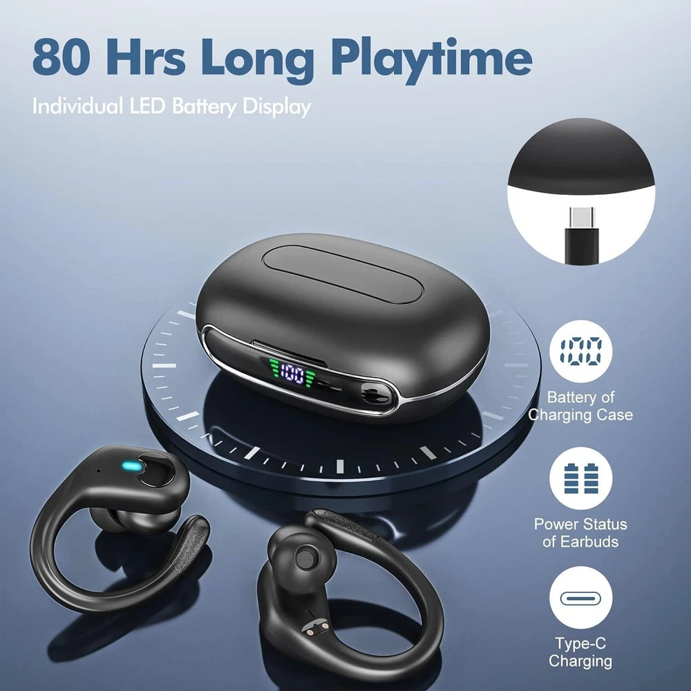 【80 Hrs of Playtime & LED Digital Charging Case】Each earbud provides up to 10 hours of listening time per charge. With the charging case, you can enjoy up to 80 hours of music wherever you go.The BX30 bluetooth headphones also feature a dual LED digital display that shows you the battery status in real time. 【2024 Upgraded Bluetooth 5.3 & 0.1 s Auto Pairing】The headphones wireless use the latest Bluetooth 5.3 wireless technology, with 2X faster signal transmission and 45% more stability to ensure a smooth experience. The wireless earbuds are widely with most Bluetooth devices: iPhones, Android mobile phones, iPads, etc. They are suitable for Android 4.4 or iOS 8.0 and above. 【85% Bass Enhancement & ENC Clear Calls】The wireless headphones features a large 14.5mm speaker driver unit with 85% bass enhancement for an immersive listening experience. micrs enhance conference calls and reduce external ambient noise for clear calls. Ideal for music lovers and those who need to use it for web conferencing and online classes. 【Comfortable to Wear & IPX7 Waterproof】The Bluetooth earbuds with 3 pairs (S/M/L) of soft silicone wireless earphones, stable and even force. The non-slip design on the end of the earhooks will not fall off even with strenuous exercise. Featuring IPX7 seam sealing and nano-coating waterproof technology, making them resistant to daily sweat and rain. 【Unique Button Design】The bluetooth earphones feature a new button design. Allows you to access music play/pause, change tracks, volume +/-, activate Siri, answer/hang up calls and more.