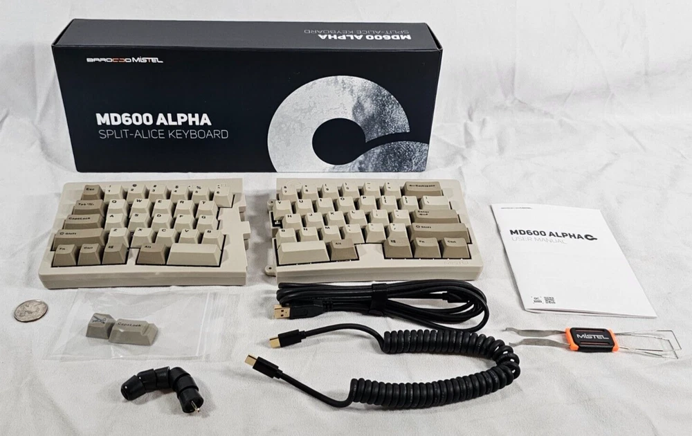 The BAROCCOMiSTEL MD600 Alpha BT is a 60% ergonomic split mechanical keyboard designed for seamless connectivity, comfort, and adaptability. With a unique Split-Alice layout, this keyboard is perfect for gamers, typists, and programmers seeking flexibility and precision. Key Features: Ergonomic Split Design – Adjust the keyboard to your preferred distance and position for optimal comfort. 60% Curvy Layout – Designed to match finger length and press distance, allowing relaxed finger positioning. Dual Mode Connectivity – Switch between Bluetooth and USB-C for both wireless freedom and wired responsiveness. Multi-Device Pairing – Connect up to 3 devices via Bluetooth, with easy switching between them. Programmable Macro Functionality – Customize key bindings to suit your personal workflow or gaming needs. Durable PBT Keycaps – Features double-shot PBT keycaps that resist fading and provide lasting stability. Adjustable Keyboard Angle – Magnetic rubber feet let you modify the angle for improved ergonomics. Additional Information: Device Compatibility : Laptop, PC, Gaming Console Battery Capacity : 2000mAh lithium battery (approx. 3.5 hours to fully charge) Key Switches : MX Mechanical (available in multiple variants) Polling Rate : USB=1000Hz, BT=125Hz Number of Keys : 64 (ANSI layout) Dimensions : 13.5 x 5.2 x 1.1 inches Quarter in photo used for scale.