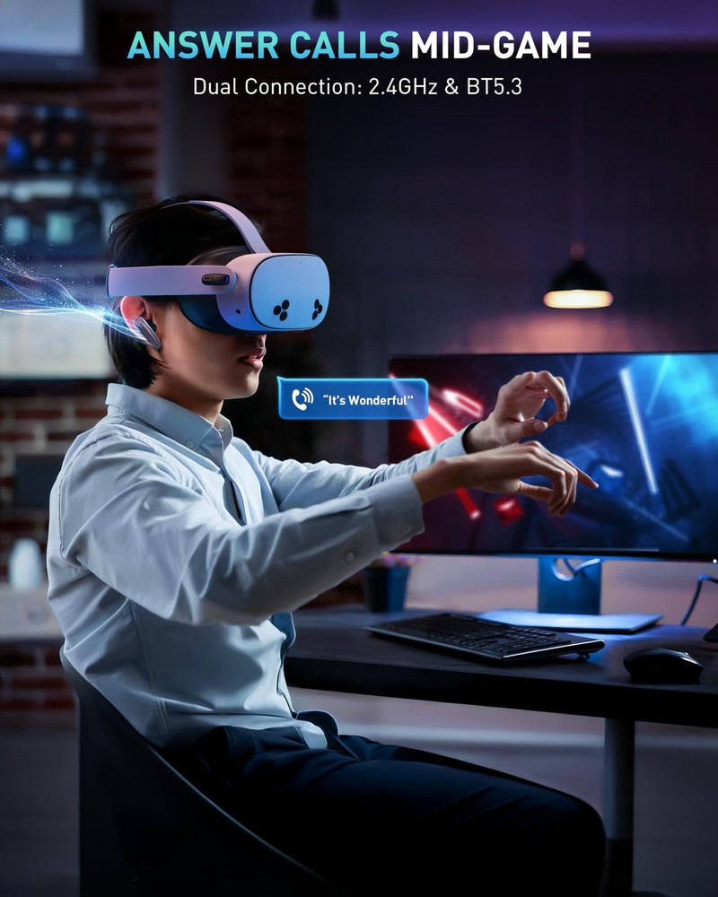 Gaming Earbuds: Elevate Your Gaming Experience Notice: It does not support Xbox Introducing the Gaming Earbuds, the ultimate accessory for serious gamers. Designed specifically for PS5/Quest 3S/3/2, these earbuds deliver an unparalleled audio experience with a host of features that cater to the needs of every gaming enthusiast. Key Features: Compatibility: Perfectly compatible with PS5, Quest 3S/3/2, ensuring seamless integration with your gaming setup. Low Latency: With an impressive 25MS low latency, enjoy perfectly synchronized audio and visuals for an immersive gaming experience. Dual Connectivity: Featuring both Bluetooth and Dongle connections, you can game and take calls simultaneously without any interruptions. High-Quality Sound: Experience superior sound quality with high-fidelity audio and a built-in microphone for crystal-clear communication. Convenient Charging: The Dongle does not occupy the C port, allowing you to charge your device while using the earbuds. Extended Battery Life: Enjoy up to 6 hours of continuous playtime on a single charge, and extend your gaming sessions up to 24 hours with the charging case. Seamless Switching: Effortlessly switch between 2.4GHz and Bluetooth 5.3 modes without any additional operations, ensuring a smooth and uninterrupted gaming experience. 18-Month: Benefit from an 18-month friendly customer service, providing peace of mind and reliable support. What's in the box: Wireless Gaming Earbuds Charging Case USB-C Dongle S/M/L Ear Tips Short USB-C Cable G11 Gaming Earbuds are designed for gamers who demand the best. Whether you're in the heat of battle or exploring new worlds, these earbuds provide the sound quality and functionality you need to stay ahead. Join the ranks of elite gamers and elevate your gaming experience with G11. Designed for PS5/Quest 3S/3/2: gaming earbuds are perfectly compatible with PS5, Quest 3S/3/2. Our advanced pro gaming headset creates incredible soundscapes, taking your game immersion to the next level 25MS Low Latency: Experience real-time audio and video synchronization with 2.4GHz high-speed lossless wireless technology. Enjoy seamless and rapid connections, ensuring no interruptions during gameplay for a smooth experience Dual Connection - 2.4GHz & Bluetooth 5.3: Answer calls mid-game without pausing. Connect the G11 to PS5/Quest via the included USB-C dongle and to your phone via Bluetooth. Stay connected and never miss a call while gaming Hi-Fi Stereo Sound & Clear Calls: G11 gaming earbuds feature double-layer diaphragm drivers, delivering powerful bass, clear mids, and bright treble. Experience high-fidelity sound reproduction that brings every game detail to life. The built-in dual mic with ENC Noise Reduction ensures high-quality call performance Charging While You Play: Your USB-C port will not be occupied by the dongle. With 18W Super Pass-Through Charge, you can quickly charge your Quest 3S/3/2, and Switch while playing