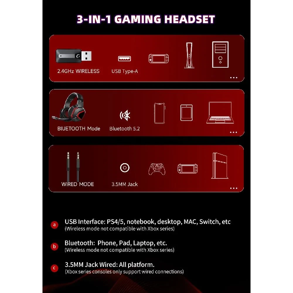 Wireless Gaming Headset 2.4G USB for PS5 Switch PC Mac,Bluetooth 5.2 Gaming Head