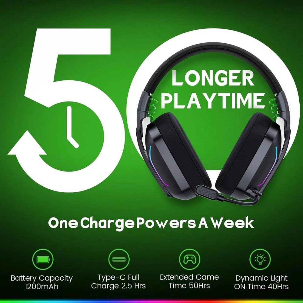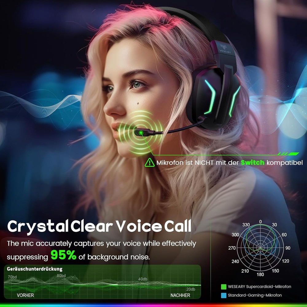 Wireless Gaming Headsets for PC, PS5, PS4, Switch, Mac, 2.4GHz Cool Black Product Details Noise Control: Passive Noise Cancellation Headphones Jack: TYPE-C jack Model Name: WG1 Connectivity Technology: Wireless Wireless Communication Technology: 2.4GHz Wireless Included Components: Wireless Gaming headset *1, User Manual, Type-C Charging Cable *1, 2.4GHz USB Dongle *1 Age Range (Description): Adult,Kid Material: Plastic Specific Uses For Product: Gaming Charging Time: 2.5 Hours Recommended Uses For Product: Gaming Compatible Devices: PS5, PS4, PC, Mac, Laptop, mobile, Nintendo Switch (Invalid Microphone). All modes Not compatible with All xbox series Theme: Video Game Control Type: Volume Control Cable Feature: Without Cable Item Weight: 0.25 Kilograms Water Resistance Level: Not Water Resistant Frequency Range: [Inferred] 20Hz-20,000Hz Customer Package Type: FFP Unit Count: 12.0 Ounce Style: Pro-Wireless Control Method: Touch Number of Items: 1 Controller Type: Button Battery Life: 50 Hours Audio Driver Type: Dynamic Driver Bluetooth Range: 10.5 Meters Bluetooth Version: 5.4 Carrying Case Battery Average Life: 50 Hours Carrying Case Length: 14.2 Centimeters Carrying Case Width: 8.3 Centimeters Carrying Case Height: 14.1 Centimeters Carrying Case Weight: 330 Grams Carrying Case Material: Hard Plastic or Composite Carrying Case Color: Black Audio Latency: 20 Milliseconds Audio Driver Size: 50 Millimeters Earpiece Shape: Over Ear Is Autographed: Yes Series Number: 1 Manufacturer: WESEARY Product Dimensions: 5.59 x 3.27 x 5.55 inches Item Weight: 8.8 ounces Item model number: WG1 Batteries: 1 Lithium Ion batteries required. (included) Department: Unisex Adult Country of Origin: China Brand: WESEARY Color: Cool Black Ear Placement: Over Ear Form Factor: Over Ear Impedance: 32 Ohm 【Immerse Yourself in Epic Sound】Experience gaming like never before with our PC wireless headset, equipped with a 50mm dynamic driver for unparalleled 3D stereo sound. Capture every detail—from teammates' voices and footsteps to the sharpest gunshots. Gain a competitive edge with an immersive audio experience that heightens your gaming atmosphere and boosts your chances of victory. The hot headset is perfect gift for Christmas & birthdays, delighting boys, girls, family, and friends alike. 【Versatile Compatibility】 WESEARY gaming wireless headphones for PC, Switch, Mac, and laptops are your all-in-one solution, supporting 2.4GHz dongle mode, surpassing other gaming headsets in performance. Easily switch to Bluetooth 5.4 mode for mobiles, tablets, iPads, and smart devices. ❌Note 1: Both modes are NOT compatible with any Xbox.⚠️ Note 2: The microphone is NOT compatible with Switch.Note 3: Bluetooth mode is NOT compatible with PS4/PS5. 【Ultra-Low Latency Gaming】Experience unparalleled gaming with our state-of-the-art wireless gaming headset for PS5/PS4/PS3. Equipped with a 2.4GHz USB dongle, it delivers ultra-low latency audio (≤20ms) for a truly immersive adventure. Pressing the mic button for 2 seconds, Effortlessly switch to Bluetooth mode, enjoying swift responsiveness (<48ms). Embrace wireless freedom and precision. Customize your auditory journey for an unrivaled gaming experience. 【Omnidirectional Mic with Noise Cancellation】Lead your team to victory with our wireless headphones with NEC microphone, featuring a 360° rotatable mic for crystal-clear communication. Advanced noise-cancelling tech blocks out background noise, ensuring you hear every crucial step, reload, or voice cue in games like Fortnite, Call of Duty, The Legend of Zelda, and RPGs with precision. giving you full control and clarity in every intense battle.Mute the mic with a single click. 【Ergonomic Comfort Redefined for Premium Gaming】Indulge in unmatched comfort with our gaming wireless headset for PS4/PS5, engineered with adjustable headbands that distribute pressure evenly for a custom fit. Suitable for gamers of all ages, it provides enduring comfort, even during marathon gaming sessions. The advanced breathable earmuffs offer exceptional noise isolation, the moisture-wicking design keeps you cool and comfortable, even in the heat of intense gameplay. 【Dynamic LED Lighting for Immersive Gaming】Elevate your gaming experience with the touch of a button, activating vibrant, color-shifting LED lights. These dynamic lights not only enhance your gameplay but also add a stylish, fashionable flair to your gaming setup, creating the perfect atmosphere for every session.