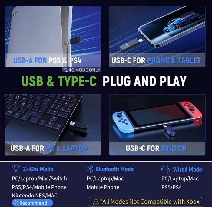 About this item 【7.1PRO Surround Sound】Equipped with a 50mm dynamic driver and advanced 2.4GHz lossless technology, this gaming headset delivers enhanced audio clarity and precise spatial awareness. The 7.1 surround sound creates lifelike 3D soundscapes, allowing you to hear critical details like enemy footsteps and distant gunfire for a fully immersive gaming experience. 【20ms Ultra-Low Latency Gaming Headset】Experience flawless audio-video sync with industry-leading <20ms latency – faster and more stable. Ideal for immersive gaming, this headset delivers ultra-smooth performance. The ideal holiday or birthday gift for gamers of all ages – boys, girls, friends, and family alike! 【Dual Wireless Tech & 2 Mode Online】The widest compatibility than any other gaming headsets: Bluetooth & 2.4GHz wireless tech, Both USB & Type-C connectorwhich means suit for almost all gaming devices except XBOX. 【40H+ All-Day Comfort】1000mAh battery delivers 40+ hours of playtime with 3-hour fast charging + low-battery alert. Breathable nylon mesh earcups and ultra-soft cushions keep you cool and fatigue-free, even during long sessions. 【Multi-platform Compatibility 】This gaming headphones with the 2.4GHz USB & Type C dual dongle and 3.5mm cable, compatible with Ps4/Ps5/PC/Switch/Mobile phone. Just plug in the equipment, and you can get an immersive and convenient gaming experience anytime, anywhere Note 1: In wireless mode, this headset is not compatible with the XBOX series Note 2: In Bluetooth mode, this headset is not compatible with the Ps5 / Ps4 Note 3: In wired mode compatible for game boy color, game boy advance Product information Item details Brand Tatybo Model Number WT01 Model Name WT01 Built-In Media Bluetooth Age Range Description Kid, Teen, Adult Number of Items 1 Is Autographed No Manufacturer Tatybo ASIN B0C5DCRRN7 Warranty Description 3 Year Warranty Measurements Item Weight 1.1 Pounds Unit Count 1.0 Count Controls Control Type Button Control Control Method Touch Additional details Additional Features 7.1 Surround Sound, Detachable Microphone Included, Adjustable Headband, Lightweight Enclosure Material Polycarbonate (PC) Compatible Devices PS4, PS5, PC, Switch, Mobile Phones Cable Features Without Cable Style Color Black Theme Video Game Style Name Gaming Connectivity Headphone Jack 3.5 mm Jack Connectivity Technology Wireless Wireless Technology Wi-Fi Design Headphone Folding Features Over Ear Battery Battery Charge Time 3 Hours Battery Average Life 40 Hours
