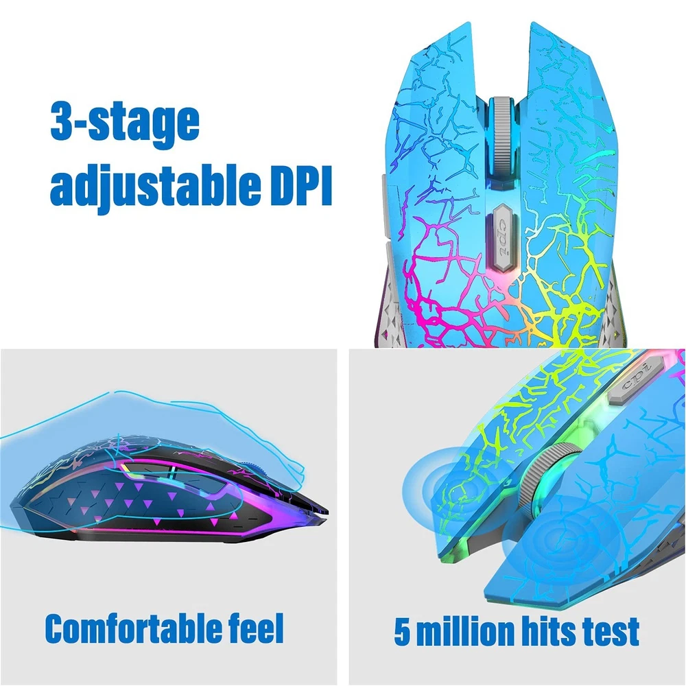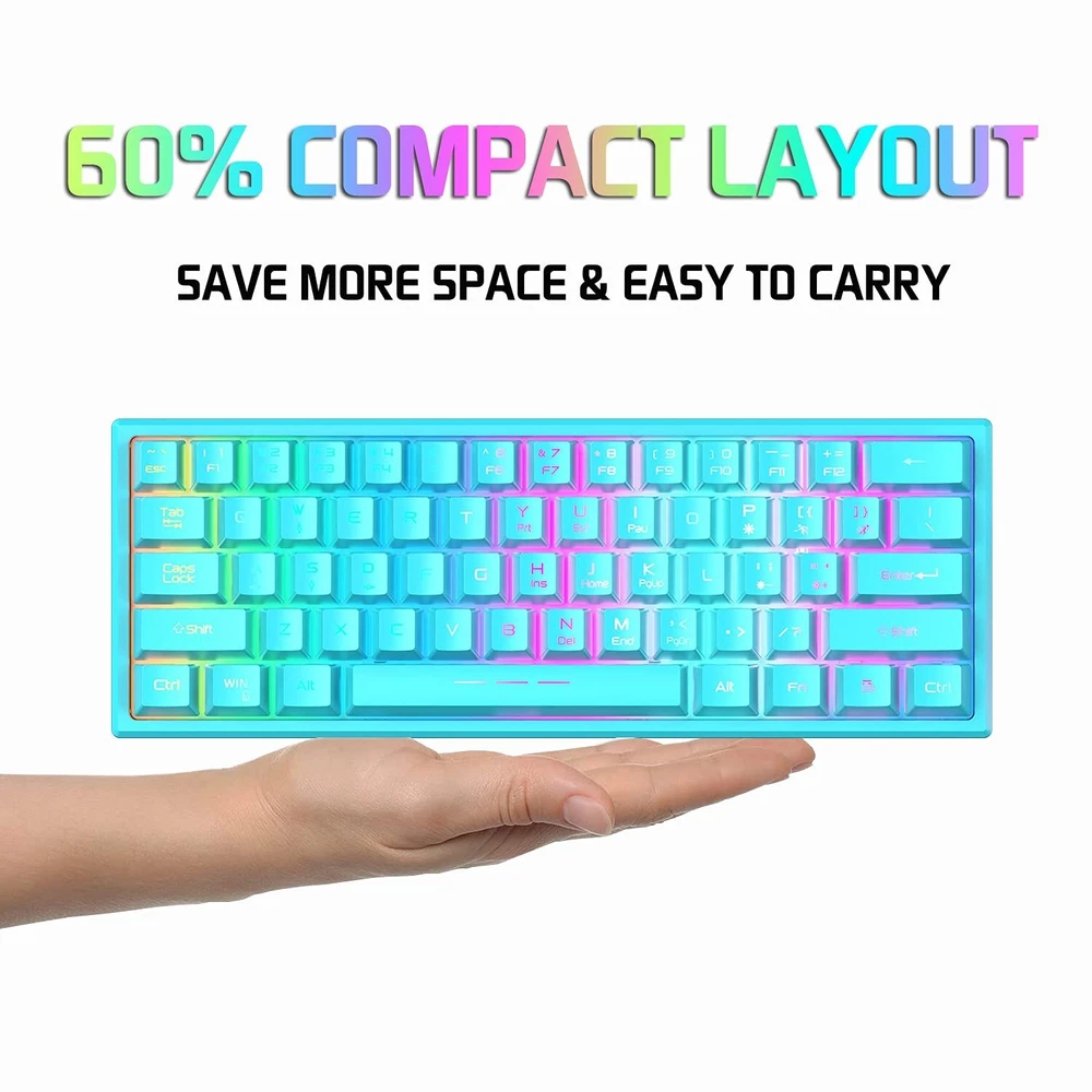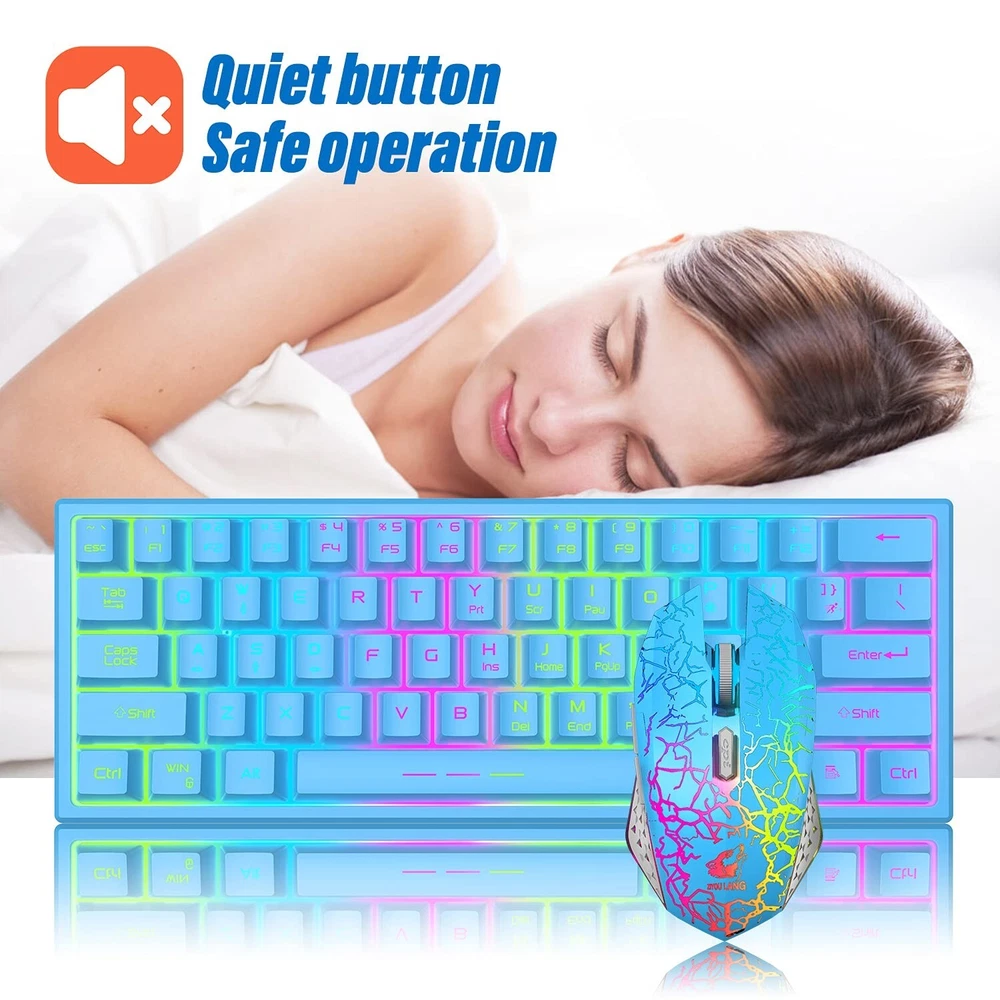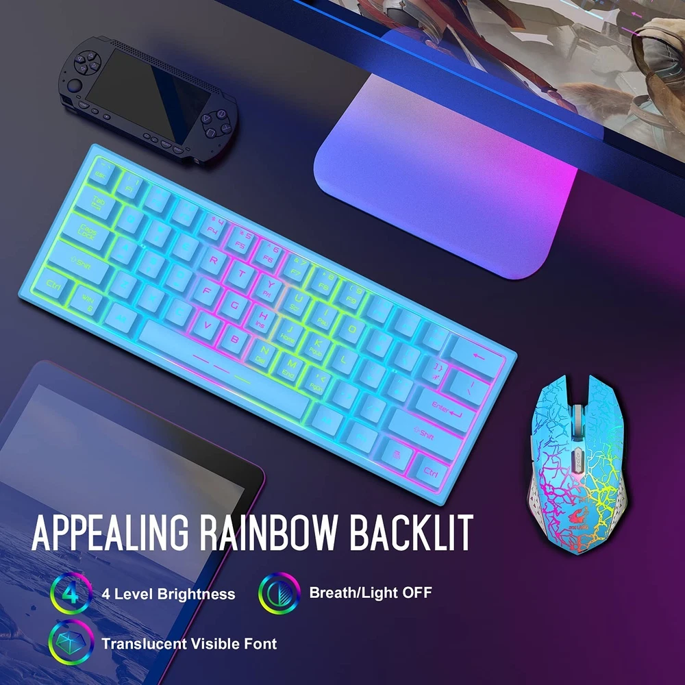 Wireless Gaming Keyboard and Mouse Combo,61 Key Rainbow Backlit Keyboard with Rechargeable 3800mAh,Mechanical Feel,Ergonomic,Quiet,Waterproof,RGB Mute Mice for PS4,Xbox One,Desktop,PC Product Details Color: Blue Rainbow Brand: LexonElec MPN: T61 UPC: 678324622880 EAN: 0678324622880 Brand: LexonElec Color: Blue Rainbow Connectivity Technology: Usb, Radio Frequency Special Feature: Backlit Keyboard Compatible Devices: Personal Computer Package Dimensions: 15.83 x 5.35 x 2.13 inches Item Weight: 1.72 pounds Manufacturer: LexonElec Item model number: T61 Date First Available: July 17, 2021 60% Compact keyboard, 100% PortableThis 60 percent wireless gaming keyboard is more compact and space-saving to sit on your desk and leave more room for your mouse movement. Its easier and super portable to travel with or carry around when youre out. 2.4G wireless keyboard and mouse3 in 1 keyboard and mouse set and mousepad, the wireless keyboard and mouse share a 2.4G dongle, just insert a USB dongle, you can use keyboard and mouse at the same time, keyboard and mouse have no signal interference, no delay, 29 anti -ghosting keys Rechargeable keyboard and mouseThe gaming keyboard is equipped with 3000 mAh battery,and the mouse is equipped with 1000 mAh battery.It only takes 4 hours to charge the keyboard and mouse, and it can be used continuously for more than 48 hours. There is no need to purchase additional batteries. Two charging cable is included in the package(type-c charging cable for the keyboard). Wireless silent keyboard and mouseThe keyboard adopts the buttons similar to the mechanical feel, and takes into account the characteristics of the mechanical feel and the mute button. The mute button used in the mouse will not fade. (Note: The keyboard is not a mechanical keyboard). In addition, it is waterproof, so you don't have to worry about spilled liquid that will damage the keyboard. Plug and play keyboard and mouseThe keyboard and mouse have been set for code matching by default. You only need to plug in the USB receiver to directly use the keyboard and mouse. If you cant use the keyboard or mouse, please set the code according to the instructions,Compatible with Windows 10, Windows 8, Windows 7, Windows XP, Windows VISTA, Mac OS, etc.