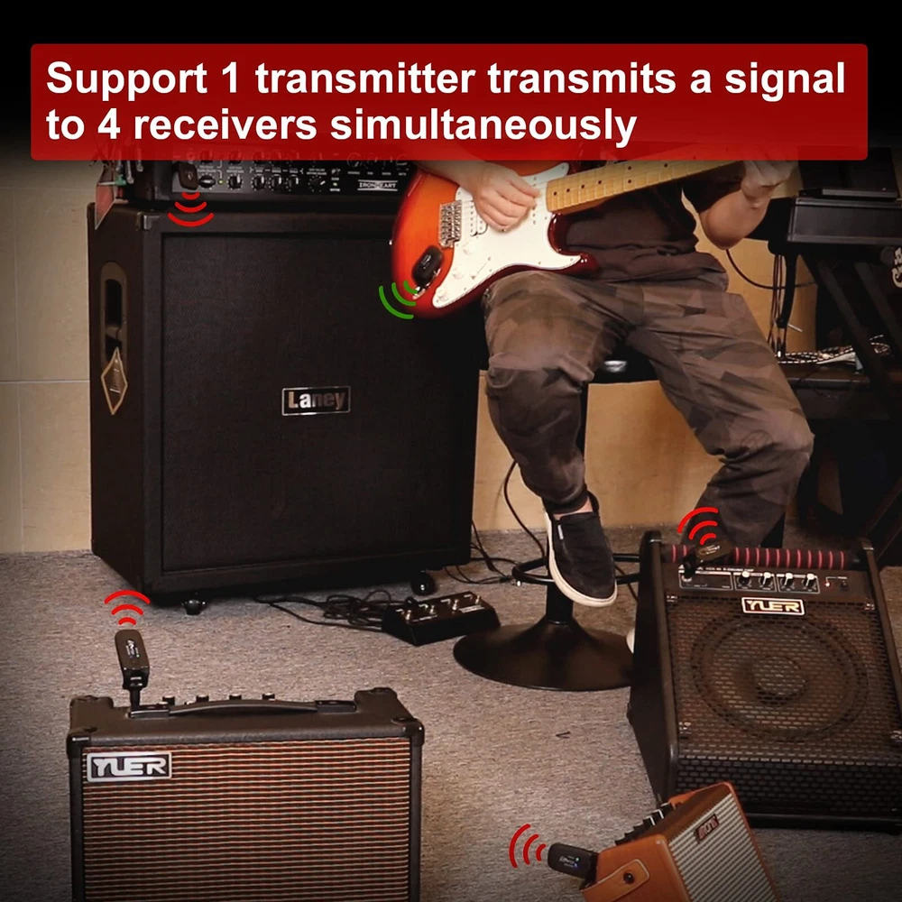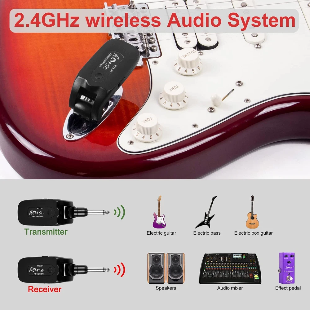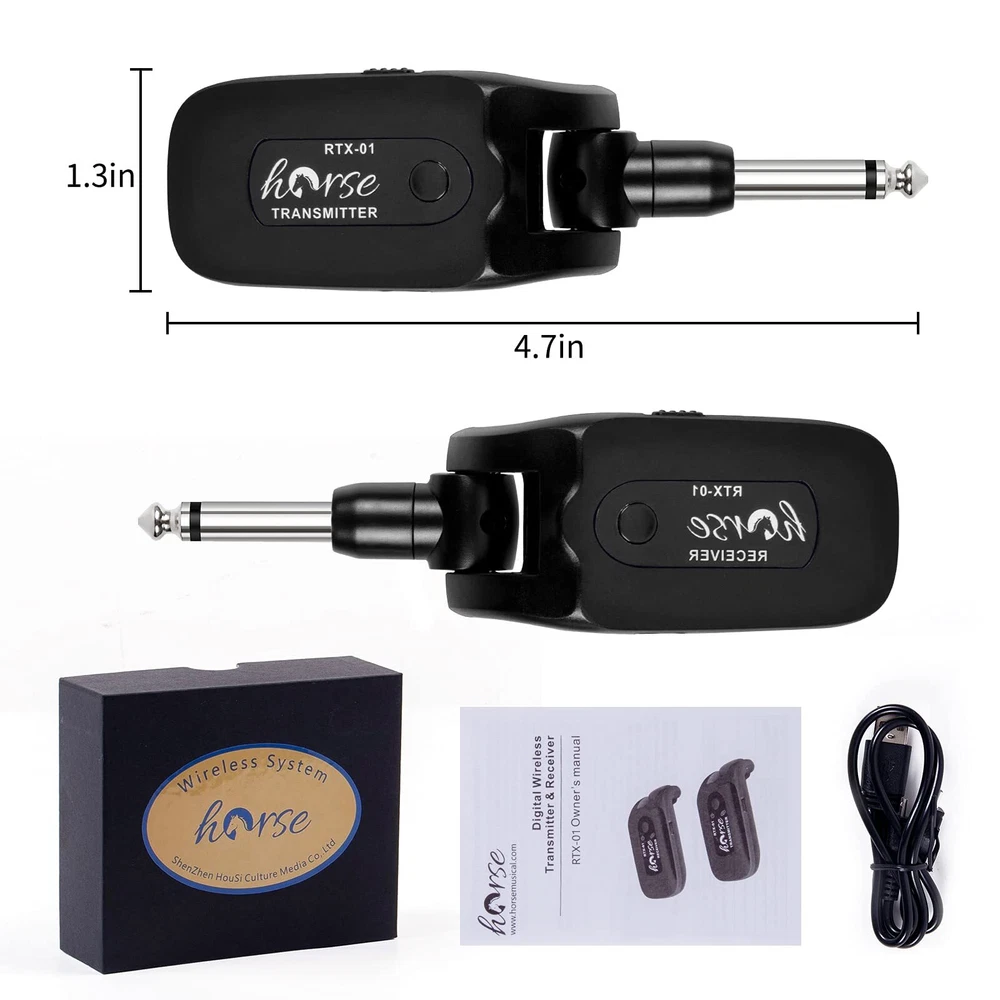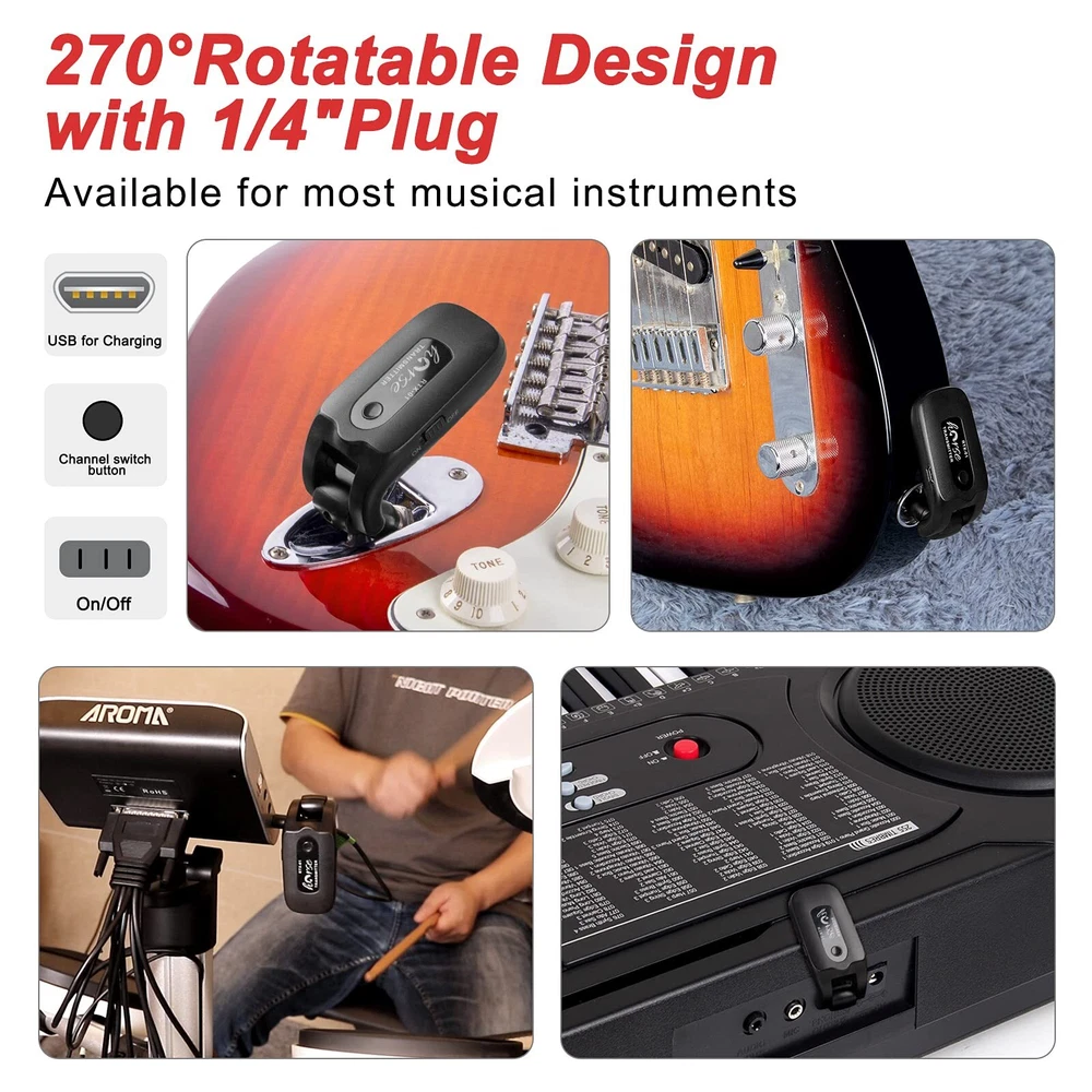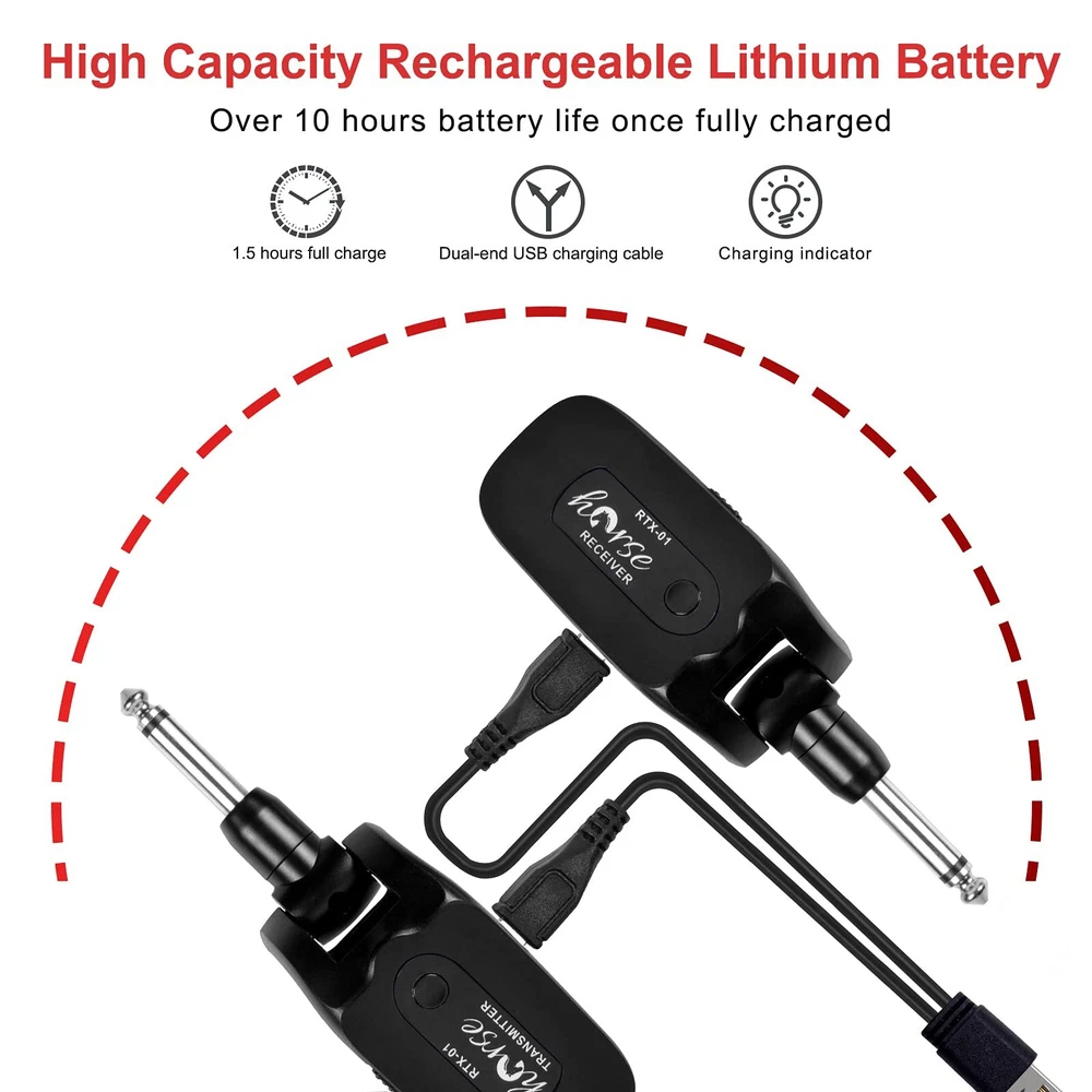 Plug and Play: Supports 4 sets of devices working simultaneously, wireless guitar transmitter-receiver one-to-one and no-interference; and one transmitter can transmit a signal to several receivers at the same time also. Impressive Perform: Crystal-clear sampling at frequency range spanning 10Hz to 22kHz, you can capture and transmitted the most subtle of nuances with our wireless guitar system Transmitter Receiver. 20m Stable and Clear Signal Transmission: Our guitar wireless system apply 2.4GHZ Chip, uncompressed signal transmission, low noise, and latency, the effective range is about 20 meters. Suitable for Variety Occasions: 270° rotatable plug design. Fit for all the electronic music instruments with a 6.35 jack, this wireless guitar/instrument transmitter receiver system can be used for electric guitar, violin, bass, effet pedal, and keyboards, etc. Long Working Time and Rechargeable: Built-in rechargeable lithium battery, working hours over 10 hours for 1.5 hrs charging, the package of wireless guitar transmitter comes with a USB cable for convenient recharging.