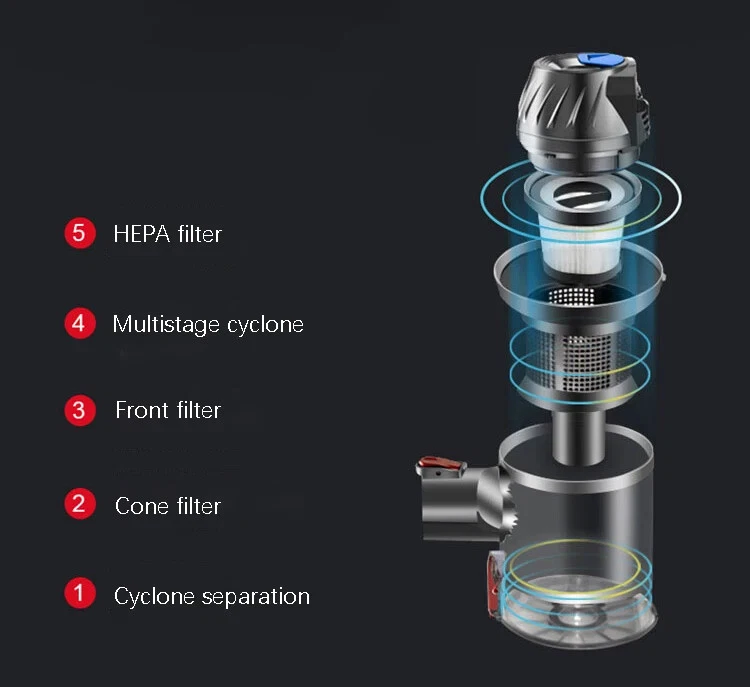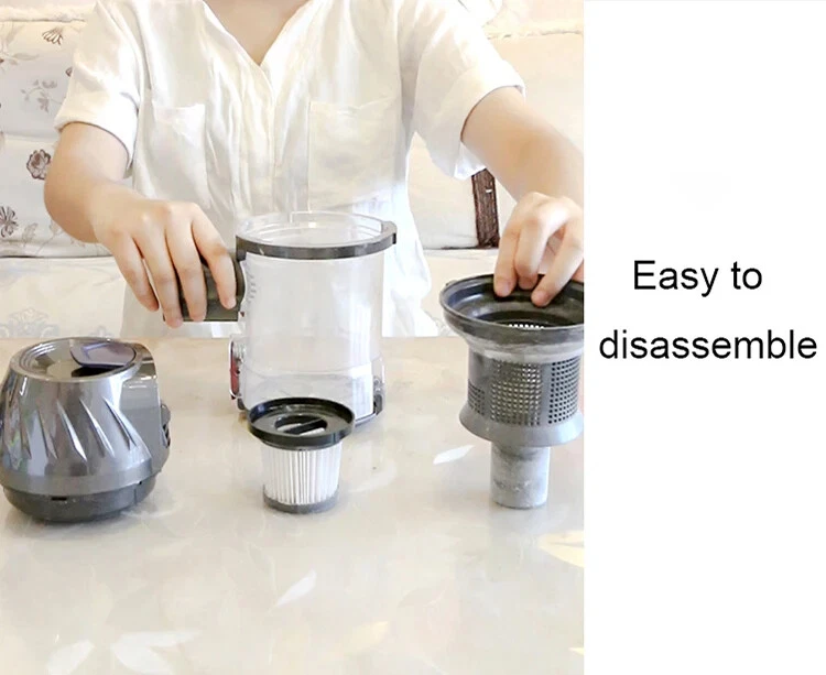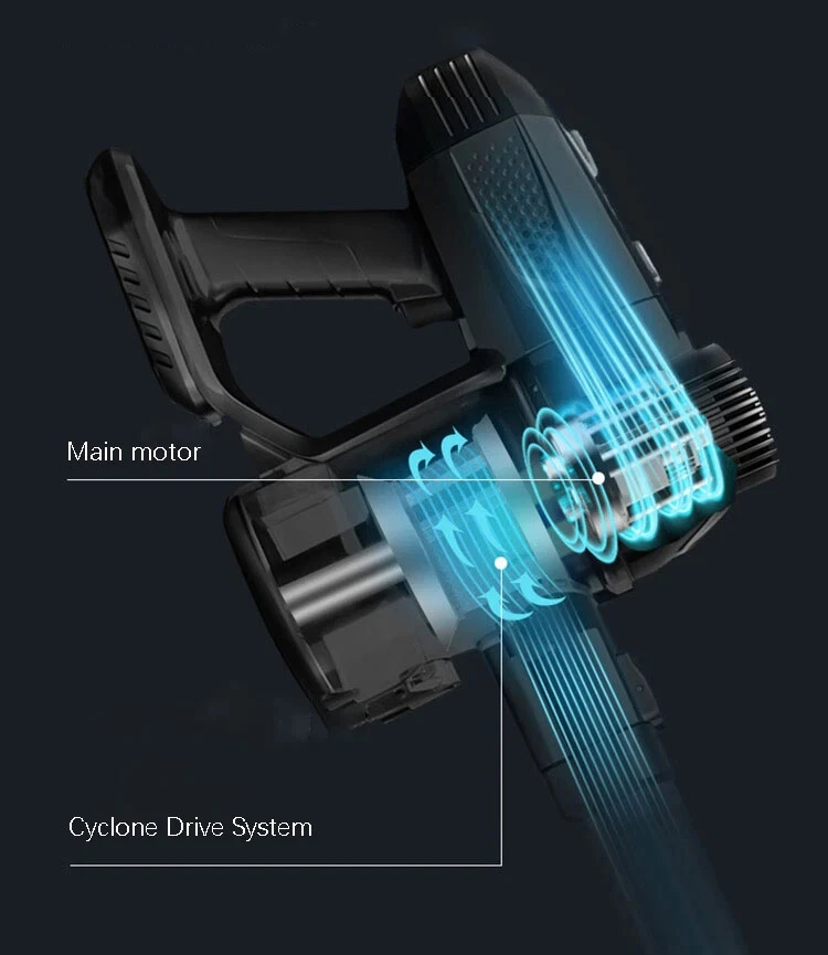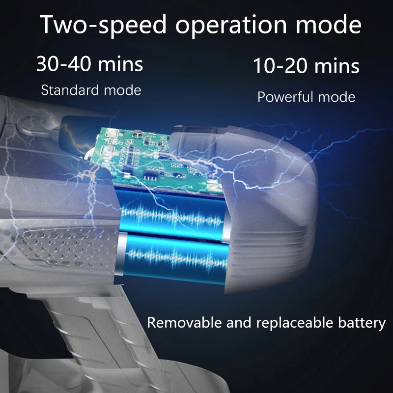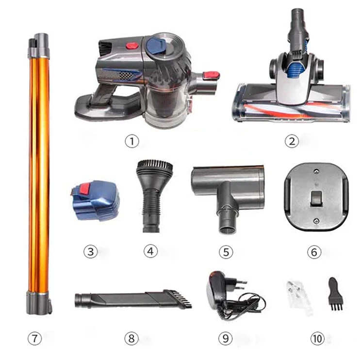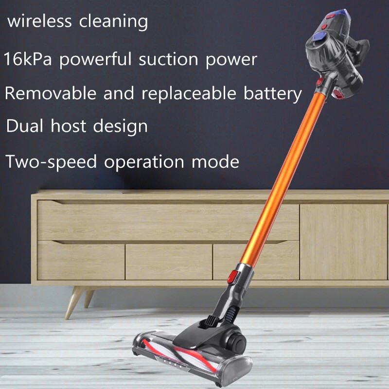 Wireless detachable battery dual motor vacuum cleaner 1. Powerful Suction: With a strong suction power of 16kPa, this wireless vacuum cleaner effectively removes dirt and debris from surface. 2. Detachable and Replaceable Battery: Our wireless vacuum cleaner comes with a removable battery. 3. Built-in LED Light: The integrated LED light provides enhanced visibility, helping you clean hard-to-reach areas and corners, leaving no dirt or debris behind. 4. Dual Operation Modes: Choose between two operation modes - standard and strong - to adjust the suction power according to your cleaning needs. 5. Advanced 5-Stage Filtration System: Equipped with a comprehensive 5-stage filtration system, our vacuum effectively captures particles as small as 0.3 microns, leaving behind cleaner air and reducing allergens in your home. 6. Long-lasting Battery: The 2600mAh battery ensures longer cleaning sessions without the hassle of frequent recharging. Double motor drive cleaning more thoroughly The main motor is matched with the independent motor of the floor brush The dual motors are driven at the same time, which significantly increases the dust removal force The dust collection efficiency is higher, and the dust that is difficult to remove is deeply cleaned. Electric mite removal brush head Suck away the dust, dander, mites, etc. hidden deep in the quilt and mattress, and give yourself and your family a healthy living environment Independently brush the motor Increase the suction power again to completely remove dust and dirt Switch between two modes at will The suction power can be adjusted according to the degree of dirt, making it easier to clean 5-fold filtration system Filter dust particles layer by layer to avoid secondary pollution, and protect your health while removing dust Front LED lighting Visually clean, illuminate dead spots Floor brush can be up and down 90°, left and right 180° rotation Easily clean the bottom of the furniture and the corners of the walls, and the narrow and difficult-to-clean areas in the corners of the furniture Easy to disassemble Consumables can be disassembled, making daily maintenance easier Dust cup, honeycomb filter and filter element are all washable Clean and environmentally friendly, no need to replace parts frequently Equipped with a variety of brush heads, clean without dead ends more details Product acessories 1. Main motor 2. Floor brush 3. Battery 4.Round brush 5. In addition to mite brush 6. Hanger 7. Telescopic tube 8. Two-in-one brush head 9. Power adapter 10. Other accessories Q&A Q1:How long can the battery last? The vacuum cleaner has two gears, the powerful gear can run for 20 minutes, and the standard gear can run for 40 minutes. Q2:Does the vacuum cleaner clean the carpet or only the floor? The vacuum cleaner cleans carpets and floors very well. Q3:If the suction power weakens after using for a period of time Please check whether the HEPA filter element is wet, or whether it should be cleaned. Wet and clogged HEPA filter elements will cause the suction to weaken Precautions for use: 1. The product needs to be charged for 4-5 hours and used after fully charged (it is forbidden to turn on the phone during charging, and it will cause battery damage when turned on during charging) 2. After the product has been used for a period of time, the HEPA filter needs to be cleaned or replaced. If the filter is blocked, the suction will be reduced. 3. When using, pay attention to if the floor brush wheel is entangled with hair, it needs to be cleaned in time to avoid damage