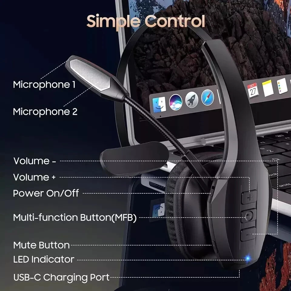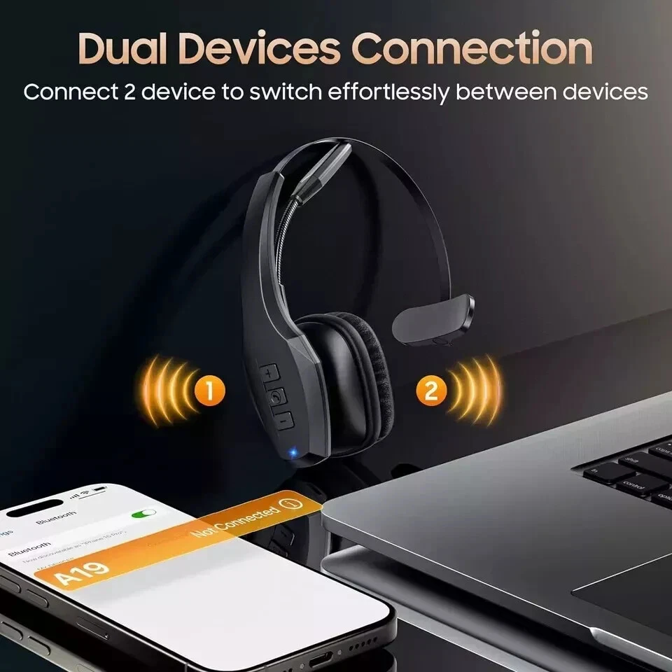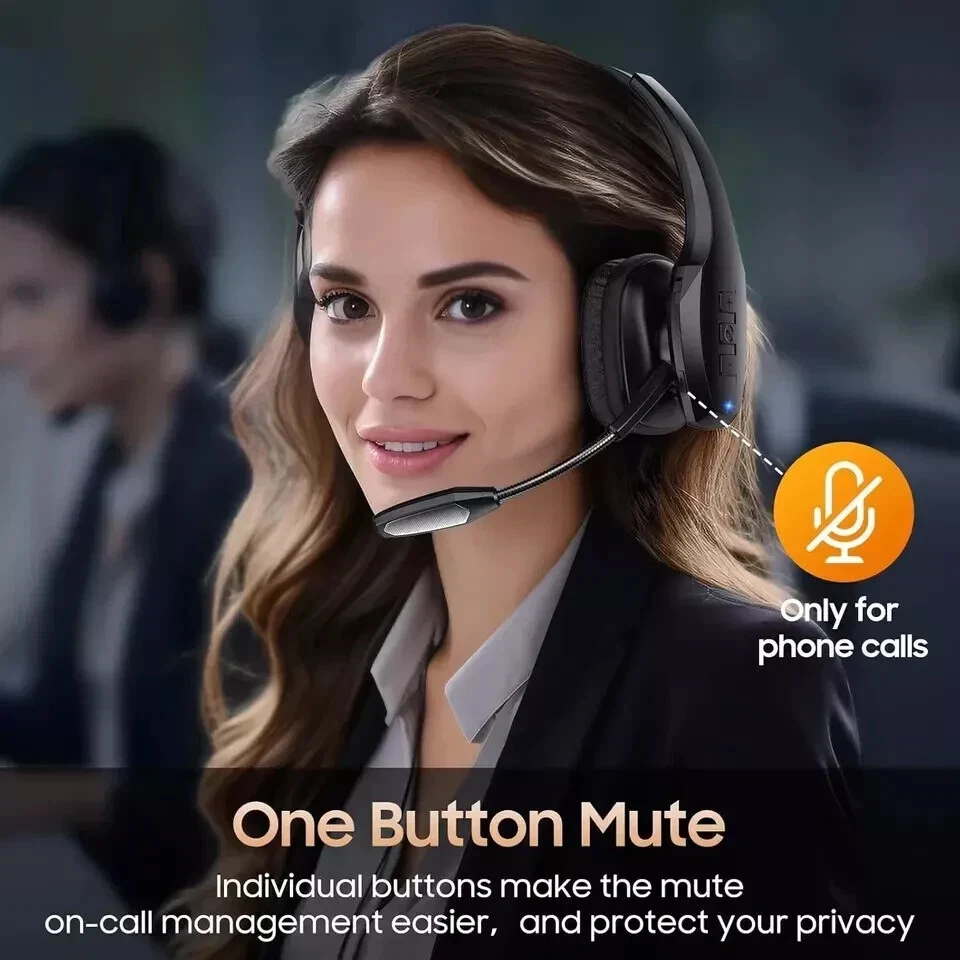 About this item Experience Effortless Communication, Anywhere: Our Bluetooth headset incorporates cutting-edge AI noise reduction technology, delivering premium sound quality that effectively blocks 95% of background noise. Enjoy a crystal-clear, lifelike calling experience akin to in-person conversations. Extended 55Hrs Battery Life: With a swift 2-3 hours charging time, our Trucker Bluetooth headset offers an extended battery life of up to 36 hours of talk time, 55 hours music time and 80 days of standby time. Drive, commute, meeting or work from home without the hassle of frequent recharging, empowering you to make calls or attend meetings at your convenience. All-Day Comfort for Prolonged Wear: Crafted with soft, breathable earmuffs and an ultra-soft adjustable headband, our bluetooth headset features a 270° rotatable design for both earmuffs and microphone, ensuring prolonged comfort and easy to switch and left/right ear available. Ideal for extended use, this wireless headset is perfect for work, promising day-long comfort. Seamless Connection to 2 Devices: Effortlessly connect our bluetooth headset to two Bluetooth devices simultaneously. Never miss important calls or meetings while enjoying your favorite music. Compatible with various Bluetooth-enabled devices, this headset ensures versatility. Extended 59ft Wireless Range: Enjoy unparalleled freedom of movement with our wireless Bluetooth headset, featuring an impressive working range of up to59ft/18m. Maintain clear and smooth call quality, even when your mobile phone isn't immediately accessible. If you have any problems with the trucker headset, please feel free to contact us, we will offer 24 hours online serivce.