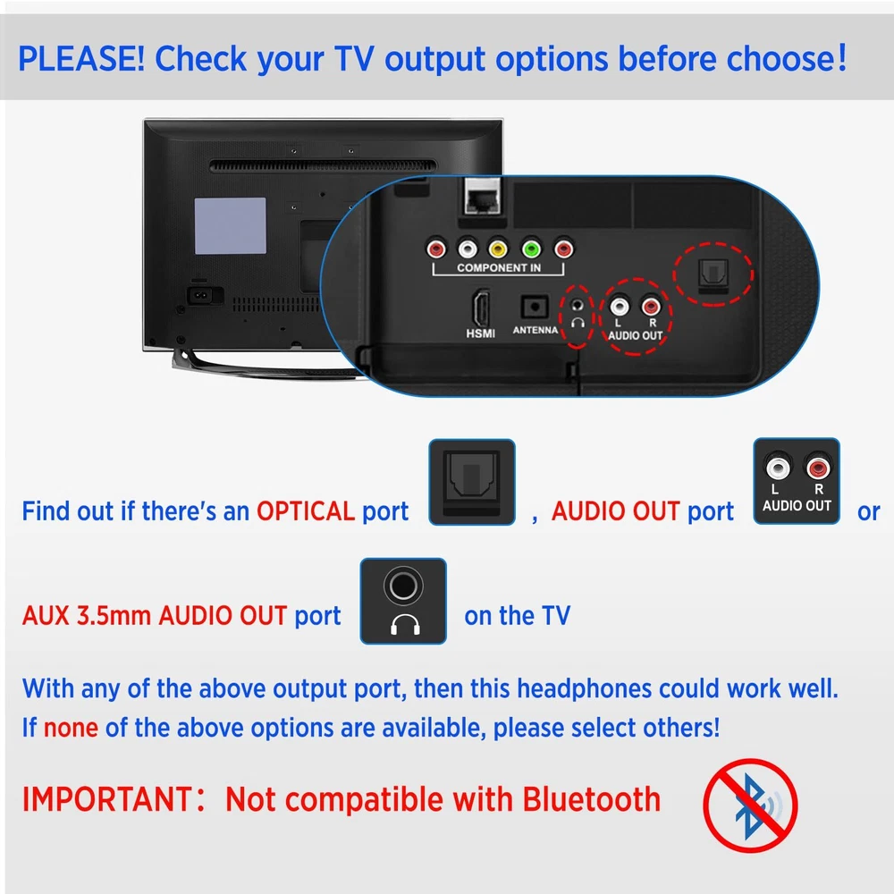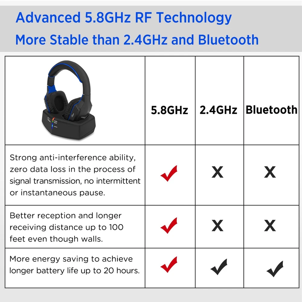 [๐—Ÿ๐—ผ๐—ป๐—ด-๐—ฟ๐—ฎ๐—ป๐—ด๐—ฒ ๐—–๐—ผ๐—ป๐—ป๐—ฒ๐—ฐ๐˜๐—ถ๐—ผ๐—ป, ๐—Ÿ๐—ถ๐˜€๐˜๐—ฒ๐—ป ๐—ณ๐—ฟ๐—ผ๐—บ ๐—”๐—ณ๐—ฎ๐—ฟ] TV headphones wireless with 5.8GHz transmitter, more stable than 2.4GHz or Bluetooth. Ensure stable and reliable connectivity of up to 100ft (30m) even through walls. You could explore every corner of your home while enjoying your favorite programs. (Not with Bluetooth) [๐—›๐—ถ๐—ด๐—ต-๐—พ๐˜‚๐—ฎ๐—น๐—ถ๐˜๐˜† ๐—ฆ๐—ผ๐˜‚๐—ป๐—ฑ, ๐—ก๐—ผ ๐—Ÿ๐—ถ๐—ฝ-๐—ฆ๐˜†๐—ป๐—ฐ ๐——๐—ฒ๐—น๐—ฎ๐˜†] wireless headphones for TV provide high-quality audio that will help you feel fully immersed in the experience every detail of the soundtrack in total privacy and comfort. The superior sound not only to engage yourself in the content without any external distractions but also without disturbing others. [๐—˜๐—ฎ๐˜€๐˜† ๐˜๐—ผ ๐—จ๐˜€๐—ฒ, ๐—ฃ๐—น๐˜‚๐—ด ๐—ฎ๐—ป๐—ฑ ๐—ฃ๐—น๐—ฎ๐˜†] Ready to use wireless tv headphones right out of the box, no pairing required. The set of TV headphone and RF transmitter dock are paired well in factory setting, you only need to confirm the signal connecting before using, very convenient to use for seniors/elderly. [๐—–๐—ผ๐—ป๐˜ƒ๐—ฒ๐—ป๐—ถ๐—ฒ๐—ป๐˜ ๐—–๐—ต๐—ฎ๐—ฟ๐—ด๐—ถ๐—ป๐—ด ๐—ฎ๐—ป๐—ฑ ๐—Ÿ๐—ผ๐—ป๐—ด ๐—•๐—ฎ๐˜๐˜๐—ฒ๐—ฟ๐˜† ๐—Ÿ๐—ถ๐—ณ๐—ฒ] With a built-in rechargeable battery, simply place the headphones on the charging dock to easily recharge. Enjoy up to 20 hours of uninterrupted use after a full charge. Please fully charge the headphones before first use. [๐—”๐—ฑ๐—ท๐˜‚๐˜€๐˜๐—ฎ๐—ฏ๐—น๐—ฒ ๐—›๐—ฒ๐—ฎ๐—ฑ๐—ฏ๐—ฎ๐—ป๐—ฑ, ๐—ฆ๐˜‚๐—ฝ๐—ฟ๐—ฒ๐—บ๐—ฒ ๐—–๐—ผ๐—บ๐—ณ๐—ผ๐—ฟ๐˜] headphones are designed with high-quality, soft cotton material for both ear pads and headband. The length can be adjusted according to your needs. Enjoy a comfortable wearing experience during movie marathons or binge-watching sessions.