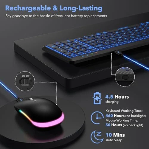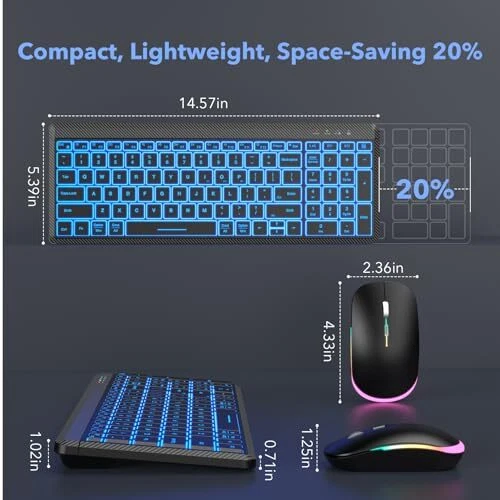 7 BACKLIGHTS TO CHOOSE:The wireless keyboard has 7 switchable backlight colors + an RGB illuminated wireless that automatically switches colors to create a cool and eye-catching working atmosphere, so you can type easily even in the dark. Note: The keyboard backlight has three brightness levels to choose from and they can all be turned off when you don't need the light. MULTI-DEVICE, 99% COMPATIBILITY:The keyboard and provide three types of wireless 2.4G+BT1+BT2 connectivity which is with 99% of devices and operating systems (Mac, Windows, iOS, Android,Ipad, etc.), in addition it can connect up to three devices at the same time and can be switched between these three devices at will. Note: Switching is done via the buttons above the number keys. RECHARGEABLE AND LONG-LASTING:Say goodbye to the hassle of frequent battery replacements, the wireless keyboard and are equipped with 1500mAh and 650mAh batteries respectively, and the keyboard can standby for 365 days on a single charge (the can standby for 270 days). Note: Backlight condition and working time will affect the standby time. POWER SAVING :Keyboard and enter automatic hibernation mode after 10 minutes/8 minutes of inactivity, respectively, and can be woken up by pressing any key or moving the ; both are equipped with an on/off switch; the power indicator light flashes when the power is low. SAVE 20% SPACE:The compact and slim appearance of the wireless Bluetooth keyboard saves up to 20% of desktop space compared to traditional keyboards, so you can easily fit it into your backpack, which makes it an excellent choice for both business and travel! LESS NOISE, MORE FOCUS:Thanks to the soft film keys of the keyboard and the silent click design of the , the wireless keyboard and kit reduces noise by more than 95%, allowing you to focus more, you can click to your heart's content in any quiet environment (e.g.: library or late at night)! Don't worry about disturbing others. COMFORTABLE TYPING:The wireless bluetooth keyboard's slightly concave keycaps are designed to fit your fingers perfectly, reducing force and relieving your finger aches and pains due to long hours of typing, while the sensitive response of the keycaps and the perfect travel keys (0.1MM) provide you with a unique typing experience.