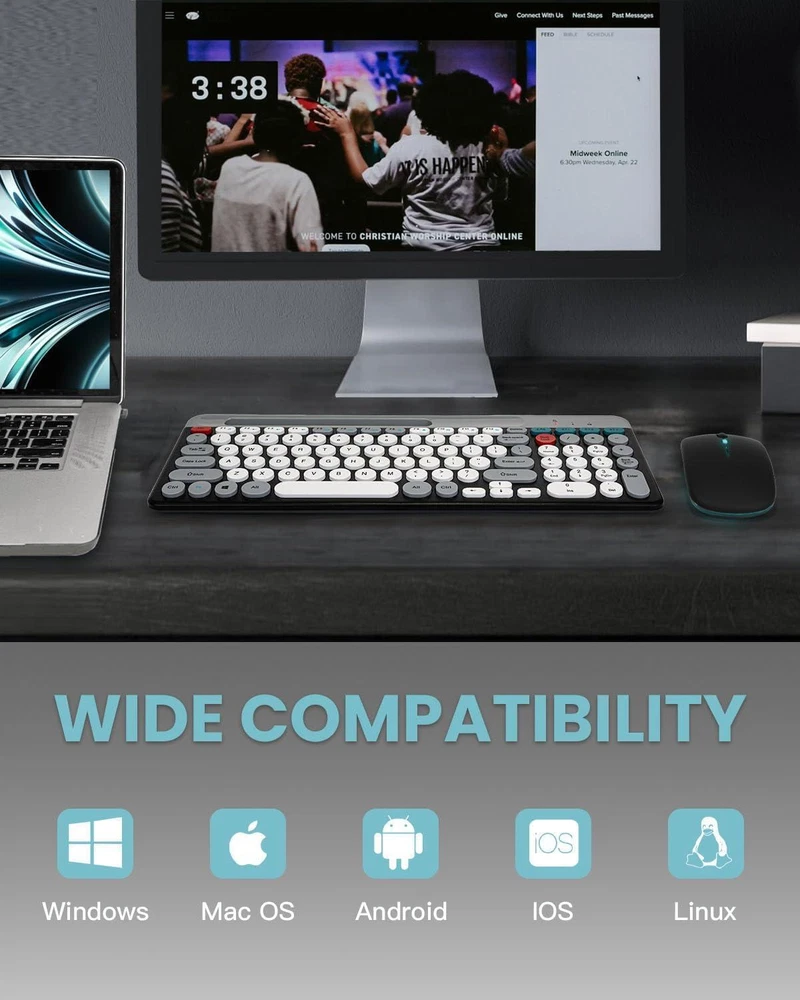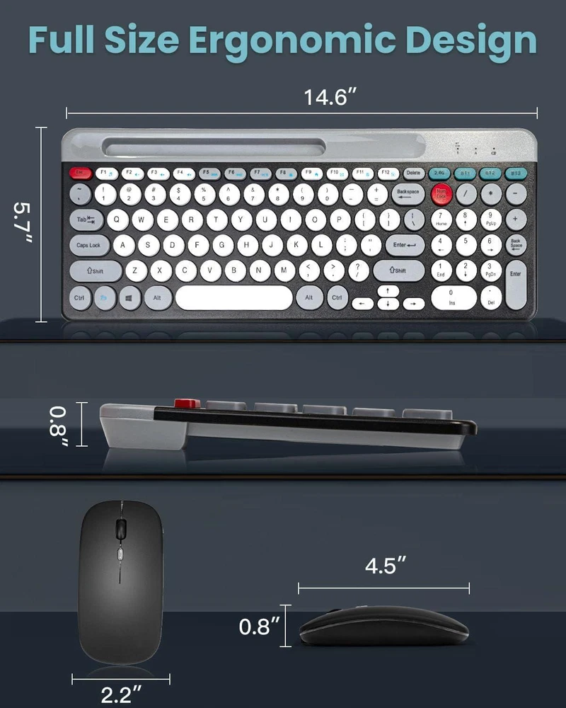 CONTACT US DIRECTLY FOR FREE & PREPAID RETURNS Wireless Keyboard and Mouse Combo, Multi-device (bluetooth+2.4g) Keyboard Mouse 【Bluetooth & 2.4G Wireless Connection】 Bluetooth 5.0 + 3.0 technology provides stable connection and within 33 feet without any delays. One plug and play 2.4G USB receiver (stored on the bottom of the mouse) or via Bluetooth can connect both the keyboard and mouse without installing additional software or driver, ensures a stable and reliable connection. 🌟【Full Size Keyboard with Holder】 Even when working with office computer, you’ll never miss any messages from your phone with this pink keyboard, since the built-in cradle can prop up your smartphone horizontally or vertically at a perfect angle to read or watch videos. 🌟【12 Multimedia Hot Keys】 This cute wireless keyboard and mouse layout with numeric keypad. 12 multimedia hotkeys combined with FN provide a shortcut to your music, emails, movies, web, ect. (Note: the 12 Multimedia shortcuts are not compatible with Mac systems.) 🌟【Silent Wireless Mouse & Long Battery Life】 Computer mouse provides whisper silent click, no need to worry about disturbing others to rest while working or playing. DPI adjustable mouse provides 3 levels of DPI (800/1200/1600) to meet your different needs in terms of sensitivity. 🌟【Wide Compatibility & Great Service】 Typewriter keyboard wireless and mouse combo compatible with Windows 2000 / ME / XP / 7 / 8 / 10, VISTA and Mac. Wireless keyboard brown, suitable for desktops, Chrome-book, PC, Laptop, Computer,Smart TVs and more. If you encounter any problems during use, please , we will provide a satisfactory solution. REVIEWS The product came very well packaged. I'm very happy. thank you for everything. Seller strongly recommended. This is great! I definitely recommend! Product looks amazing Delivery was fast. Excellent seller, great communication. I advise everyone