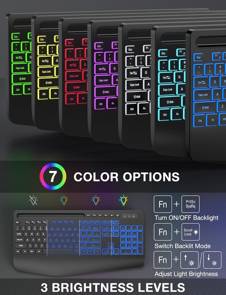 Product Description 54%+ WRIST SUPPORT: The wireless keyboard is equipped with an extra-large wrist rest with a widest edge of 2.8'', which can increase wrist support by 54% and provide you with the most ergonomic Cushioning power and height. This helps prevent common problems like wrist pain that come with long-term computer use. FIND YOUR COLOR: The wireless keyboard and mouse feature color backlit. And both the keyboard and mouse can quickly switch/turn off the backlight with one step. In addition, our cordless combo has 7+1 backlight colors, and the keyboard has 3 backlight modes to choose from, which can help you work better at night and use light effects to improve the atmosphere at work space. DEVICE HOLDER FOR MULTITASKING: The full-size keyboard is designed with a phone and tablet holder. Accommodates phones and tablets under 11.9 inches, this allows you to multitask on other devices while using our wireless keyboard and mouse combo and never miss anything important again. ENERGY SAVING & RECHARGEABLE: The mouse and keyboard combo has a built-in rechargeable battery and a smart sleep mode, this not only benefits the energy saving but also your wallet in the long run. The keyboard and mouse will enter sleep mode after 90 seconds of inactivity and can be awakened by pressing any button or key. EFFICIENT HOTKEYS & MOUSE: In addition to the regular F1-F12 shortcut hotkeys, our keyboard and mouse set equips you with 6 one-touch hotkeys on the wireless keyboard. Which paired with our 6-button mouse with 3-level tracking speed and forward/backward functions, can greatly improve your smoothness and efficiency of your page browsing at offcie/home/school/college work. LESS NOISE, MORE FOCUS: Don't worried about disturbing your family when typing or clicking anymore. Our soft membrane gaming keyboard ensures consistent transmission force for each keystroke, significantly reducing typing noise by 95%. And wireless mouse features silent micro motion technology, making its clicks almost completely silent. NOTICE: USB-C dongle is not included, keyboard mouse combo can't connect to tablet or phone. About Us We are a reputable seller with many years of experience selling on eBay. Our goal is to provide high-quality products and excellent customer service. Shipping Items will be shipped within 1-3 business days when we received payment. (Orders are not processed on weekends & holidays) Tracking information will be sent once item is shipped. Delivery time depends on destination and other factors Item is shipped to ebay address. Leaving correct address can minimize delay. For international shipping and shipping to Guam, Hawaii and Alaska, Please contact us before placing the order. International buyers please note: Import duties, taxes and charges are not included in the item price or shipping charges. These charges are buyer’s responsibility. We will try our best to reduce the risk of the custom duties. Local pick-up is unavailable at the moment. Contact Us We reply any email messages within 1 business / working days(off-duty at weekend). If you do not get a response from us, then please check your junk or spam mailbox. Our Business hours: Mon-Fri 9:00-18:00, UTC/GMT +8 hours. Please contact us either by clicking "contact seller" in the "purchase history" section or simply click "ask a question" at the bottom of this page. If you are unsatisfied with our item or service, please contact us before leaving any feedback. We are committed to resolve all issues in a friendly and satisfactory manner.