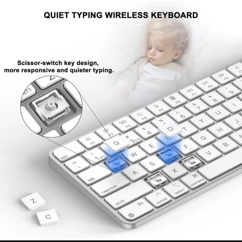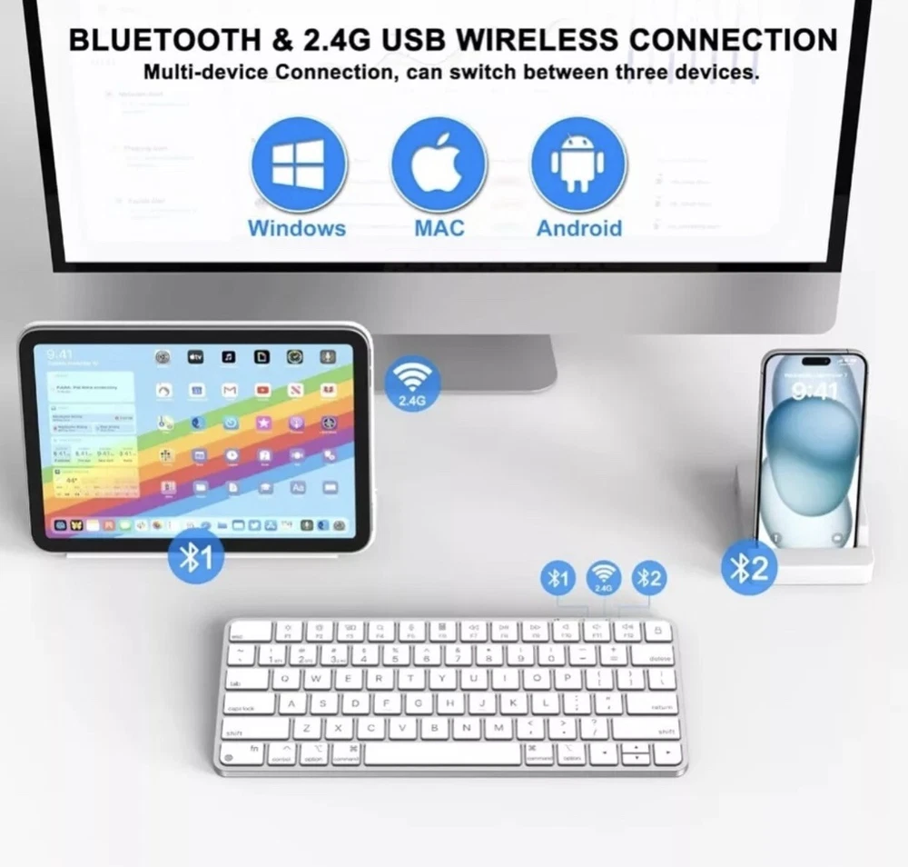 This is a Mini Wireless Keyboard designed for Mac with Bluetooth and 2.4G USB dual-channel connectivity options. It offers versatility with multiple connection methods such as Wireless, Bluetooth, USB, and more. Perfect for use with Mac computers, this keyboard provides a convenient and efficient typing experience.