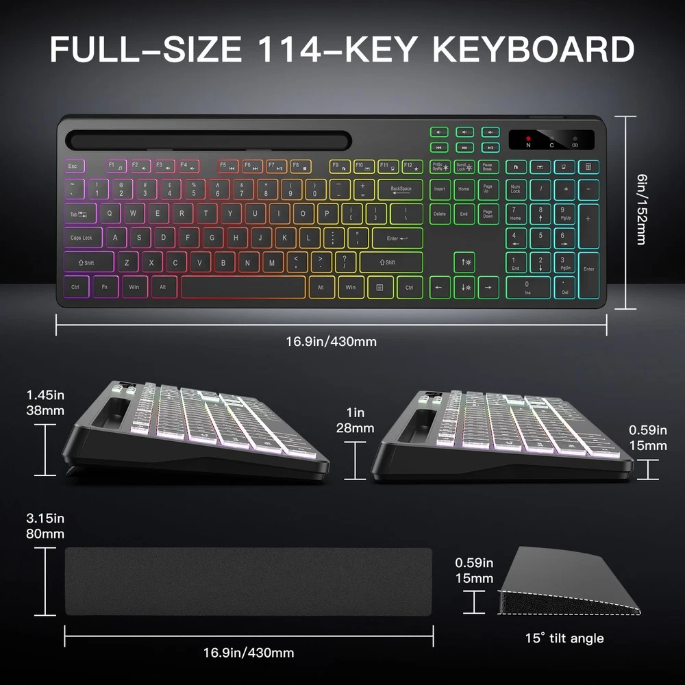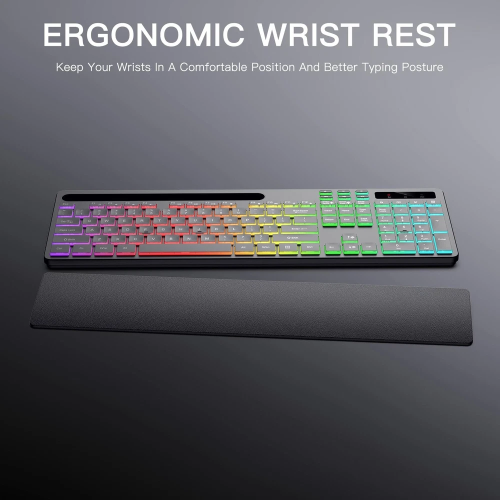 Wireless Keyboard with 7 Colors & 4 Modes RGB Backlit, Ergonomic Keyboard with Wrist Rest, Phone Tablet Holder, 2.4G Light Up Computer Keyboard with Numeric Keypad for Mac, Windows Product Details Brand: Soueto Compatible Devices: Projector, Laptop, PC, Smart TV, Gaming Console Connectivity Technology: USB-A Keyboard Description: Multimedia Recommended Uses For Product: Multimedia, Everyday Use, Personal, Student, Gaming, Business Special Feature: Backlit Color: Black Number of Keys: 114 Keyboard backlighting color support: RGB Included Components: User Manual, 2.4G Wireless Keyboard, USB Charging Cable, Separate Wrist Rest, USB-A Receiver Package Dimensions: 17.17 x 6.22 x 1.89 inches Item Weight: 1.85 pounds Manufacturer: Soueto Country of Origin: China Item model number: WS415-S-BK-US Batteries: 1 Lithium Ion batteries required. (included) Date First Available: October 7, 2024 Wireless keyboard has 7 colors & 4 modes RGB backlit options and adjustable brightness to provide you with more visual aesthetics typing atmosphere. The wireless keyboard features responsive tactile keystrokes for a smooth typing experience, ability to increase your work efficiency. Frosted textured wrist rest effectively supports your wrist and reduces muscle strain, making work easier and more comfortable. Computer keyboard is design with 8.7" convenient device holder to hold your phone or tablet, keep your desk clean and tidy. Backlit keyboard with built-in 1500mAh rechargeable battery that reduce the hassle of traditional battery replacement and wiring. With 2.4G wireless RF technology, the light up wireless keyboard provides a strong and stable connection via one USB dongle. Keyboard wireless layout with convenient access to all the right shortcut and multimedia keys, achieve more with less effort. Soueto offer 12-month worry-free warranty and friendly customer service. Please contact us for further assistance if there is any problem with the keyboard.