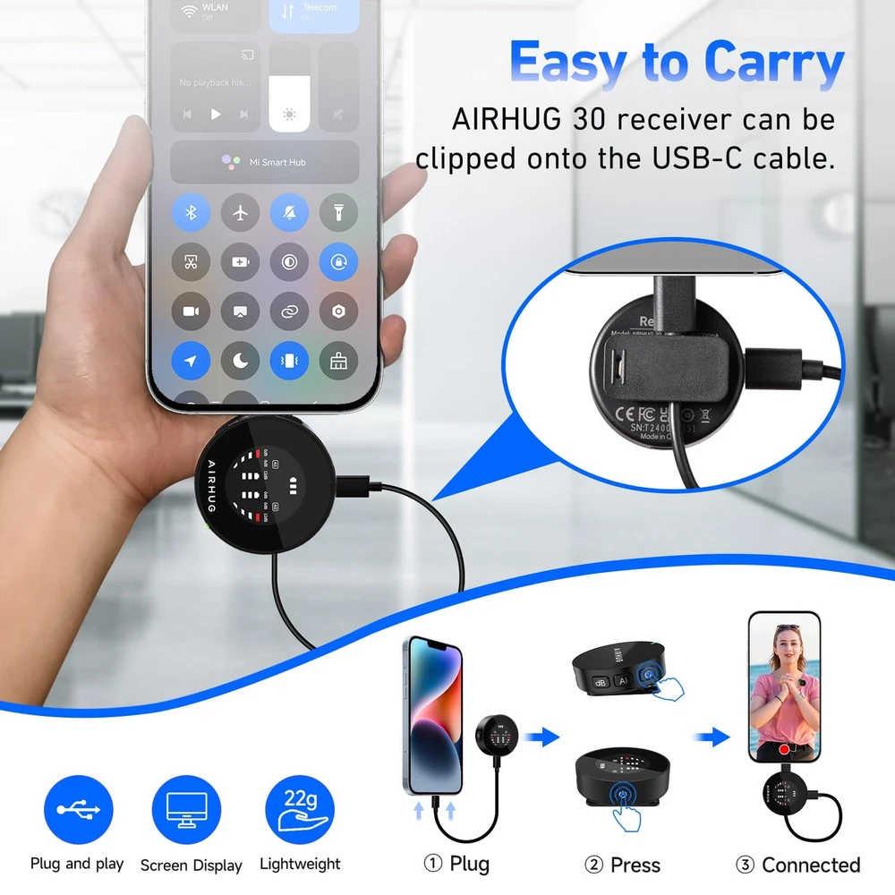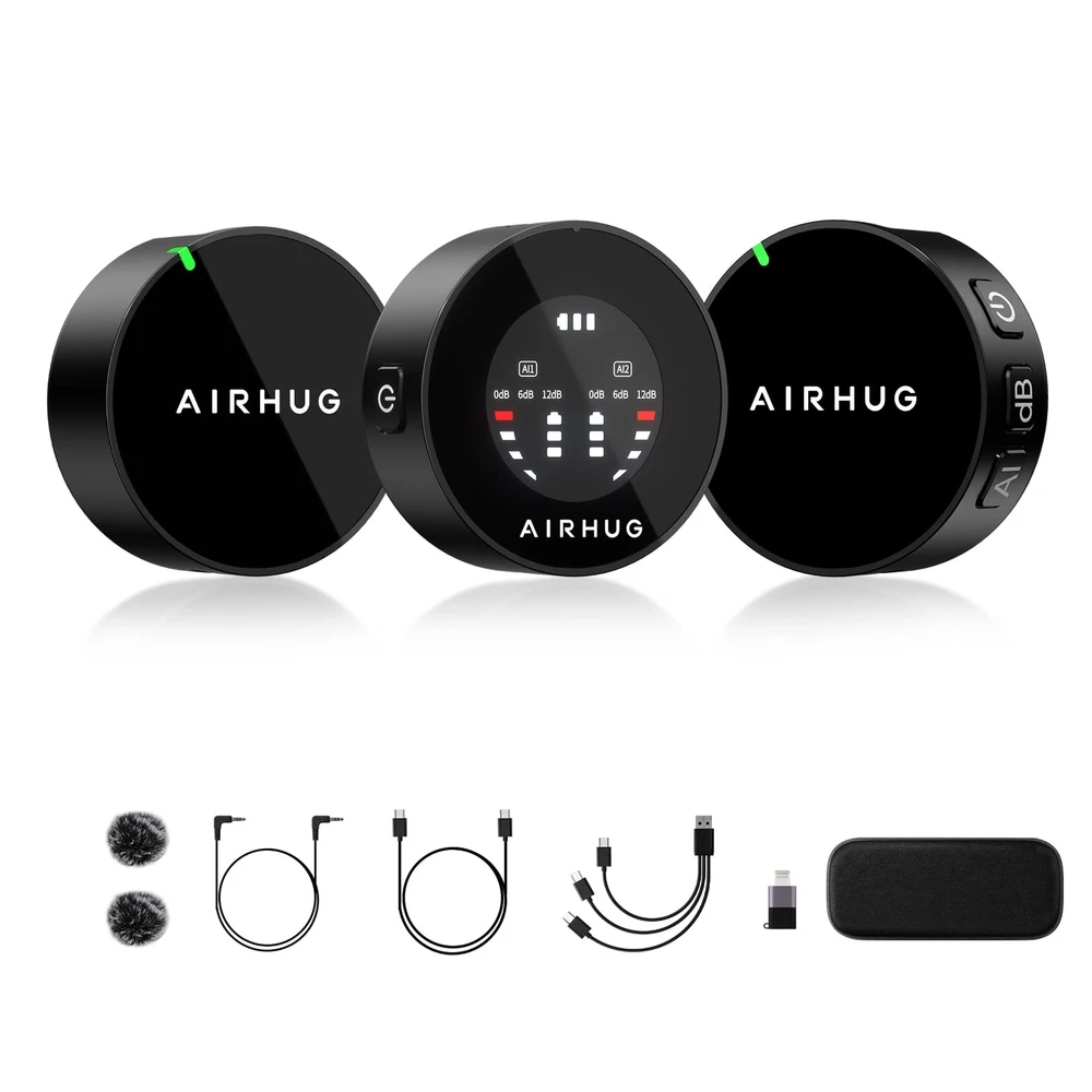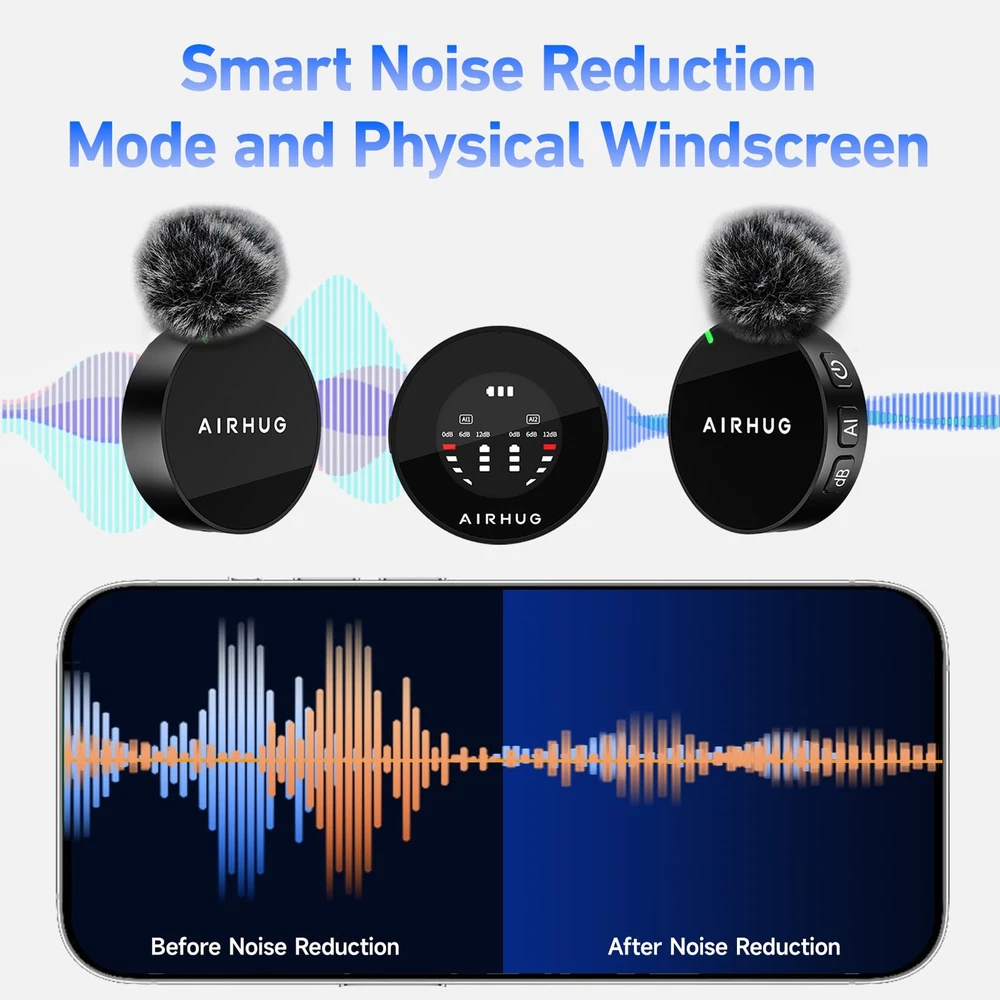 30 is a mini wireless lapel microphone Set with 2 transmitters (TX) and 1 receiver (RX). 【Universal Compatibility, Easy Switching】- This wireless lavalier microphone comes with 2 transmitters (TX) and 1 receiver (RX), which can be easily connected to a variety of devices, including smartphones, tablets, computers and cameras. Seamless switching between USB-C digital output and 3.5mm output to meet various needs. It is compatible with iOS,Android,Windows and Mac. 【Auto Pairing】- When you turn on the power of the receiver and transmitter, they will automatically pair. Plug and play mini microphone, no delay effect, make work more efficient. 30 is very easy to carry. The clip on the receiver can clip on the USB-C cable when you use it for the mobile phone. 【200 ft Wireless Range】-200 feet of stable reception, unlimited video recording. This feature is great for recording interviews, weddings or live broadcasts and other outdoor scenes. The wireless microphones adopt a convenient clip-on design that can be firmly fixed on clothes or hats for hands-free recording. Its wireless function allows you to move freely without being bound by recording equipment. 【Care Gain Levels】- The gain control of AlRHUG 30 lapel microphone largely ranges 0dB,6dB, 12dB. It ensures the mini mic captures a strong enough sound signal. When your audio signal may be too quiet or weak at different environments,you could place extra gain levels added to the microphone to make it louder. Transmitter Gain adjustment feature is particularly suitable for outdoor, such as travel vlog, outdoor sports short videos and motorcycle riding volg, etc. 【Pick up your voice any time,adjust Gain Levels】If you mind the transmitter appearing in your video, you can put it in your pocket. At the same time, adjust the gain level from 0dB to 6dB or 12dB. Even if the transmitter is a certain distance away from the sound source, the 30 transmitter still can pick up our voice very well. 【18H Long Battery Life】Charge for 2.5 hours and use for 18 hours. Only a short charging time is needed to get a full 18 hours of use time, which allows you to plan activities more effectively. Whether you use it for work, entertainment, or personal tasks, you don't have to worry about finding a power source during the day. The 32-bit float ensures clear audio. 【AI Noise Reduction Mode】- When you perform one-click AI noise reduction for the 30, the microphone provides excellent sound quality and clarity, which is great for professional recording, vlogging, and youtube production. Its advanced noise reduction technology ensures that your voice is clearly conveyed. Lavalier mics can minimize or eliminate unnecessary background noise or interference. You don’t even need to perform noise reduction on the sound of the post-production video. 【Non-AI Mode】-The non-AI noise reduction mode of the 30 wireless lav mic is very helpful to you. When you need to pick up the original background sound you want, the non-AI noise reduction mode of 30 can clearly record every sound byte, which meets your needs very well. It is very suitable for eating shows, pet short videos, cooking recording videos, etc.