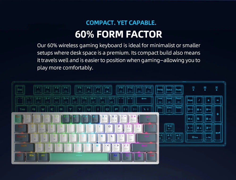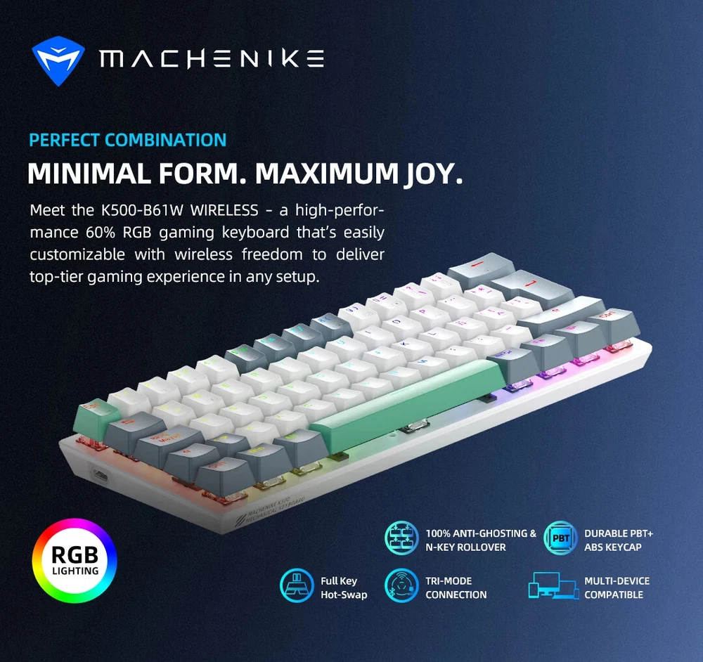 • Wireless Bluetooth Connectivity : Experience seamless gaming with the MACHENIKE K500-B61W's wireless Bluetooth connectivity, allowing you to play your favorite games without any wires. • 60% ANSI Layout : The 60% ANSI layout of this keyboard offers a compact and efficient design, perfect for gamers who value space and convenience. • Hot-swappable Tri-mode RGB : This keyboard features hot-swappable tri-mode RGB, allowing you to customize your gaming experience based on your preferences and needs. • ABS Plastic Keycup Material : Made with durable ABS plastic keycup material, this keyboard is designed to withstand intense gaming sessions, ensuring long-lasting performance. • Multicolor Backlight : The MACHENIKE K500-B61W boasts a multicolor backlight feature, adding a stylish touch to your gaming setup and enhancing visibility in low-light conditions. • WEEE Certified : As a WEEE certified product, the MACHENIKE K500-B61W meets high standards of safety and environmental friendliness, making it a reliable choice for environmentally conscious gamers. FILE K500-B61W MINI 60% FORM FILE K500 SERIES WIRELESS MINI EDITIONED SPECIFICATION * Hot-swappable: 3-pins key switch hot-swappable * Connectivity: wired USB-C / 2.4GHz / Bluetooth * Lighting: Full 16.8m RGB Backlit * Keyswitches: HUANO Red/Brown Switch * Size : 60% Form Factor * Keycaps : Doubleshot PBT + abs keycaps * ANTI-GHOSTING KEYS: N-Key Rollover(NKRO) FEATURES * Doubleshot PBT+ABS Keycaps with printed Secondary Functions * Tri-mode connectivity with Wired USB/ 2.4GHz / Bluetooth ensures seamless integration , plug and play * Full key are hot-swappable with 3-pin keyswitches * Dynamic RGB backlighting. * 100% Anti-ghosting keys & N-key rollover MINIMAL FORM. MAXIMUM JOY. Meet the K500-B61W WIRELESS – a high-performance 60% RGB gaming keyboard that’s easily customizable with wireless freedom to deliver top-tier gaming experience in any setup. 60% FORM FACTOR Our 60% wireless gaming keyboard is ideal for minimalist or smaller setups where desk space is a premium. Its compact build also means it travels well and is easier to position when gaming—allowing you to play more comfortably. HOT-SWAPPABLE KEYSWITCHES K500-B61W WIRELESS has a full-key hot-swappable PCB allowing the users to change the switches to their liking. Switch it up with most compatible 3-pin keyswitches. DYNAMIC RGB BACKLIT With RGB backlit, the entire color spectrum and a range of dynamic lighting effects are at your command. Driver support allow you to create a keyboard that's uniquely yours. GO WIRELESS. TRI-MODE CONNECTIVITY. The K500-B61W WIRELESS feature versatile triple connectivity options for seamless integration, offering wired, Bluetooth, and USB-C connections. EZ FUNCTIONS Unlock efficiency through streamlined actions with versatile key combinations, enhancing overall productivity and user experience. WHAT‘S YOUR CHOICE TROUBLESHOOTING : If you are unable to connect your keyboard with other devices or it can not be used normally in Bluetooth or 2.4G mode, please try the following steps: 1, Please use the brand’s Bluetooth adapter, using other adaptors may cause compatibility issues. Refer to the instructions that came with the adaptor for installation details. 2, Before connecting the keyboard, make sure you have correctly installed the Bluetooth adapter, and that the computer’s Bluetooth device has been properly activated. 3, If you can’t connect, disable or delete the original keyboard connection in the Bluetooth device selection bar, and then re-pair according to the aforementioned steps. 4, Make sure that the computer’s Bluetooth device has not changed. If changed, you must re-pair it again. 5, If your computer’s Bluetooth device is also connected to other Bluetooth terminals, make sure that the speed of the Bluetooth device is adequate. 6, If there is an anomaly in 2.4G mode, follow the steps to re-pair the keyboard and device (pull out the 2.4G receiver and insert it into another valid USB port). 7, Check if the keyboard has a low battery indication. If so, charge the keyboard as per the instructions given in the manual. 8, Ensure that the keyboard is used within a working range of 10 meters. Safety Guidelines 1, Avoid Spills: Keep liquids away from your mechanical keyboard as spills can damage the circuitry. 2, Don’t Pull Out the Cable Forcefully: When disconnecting, pull on the plug rather than the cord to avoid damage. 3, Regular Cleaning: Dust and debris can affect performance. Regular cleaning can prolong the life of your keyboard. 4, Be Mindful of Noise: Mechanical keyboards can be louder than regular ones. Be considerate of your surroundings when typing. 5, Protect the USB Connector: When not in use, unplug and store the keyboard properly to protect the USB connector. 6, Software Updates: Keep the keyboard software up to date to ensure optimal performance. 7, Avoid Dropping: Mechanical keyboards are sturdy, but harsh impacts can still cause damage. 8, Understand Your Keyboard Layout: Mechanical keyboards can have different layouts. Make sure you’re familiar with it for optimal use. USER MANUAL: