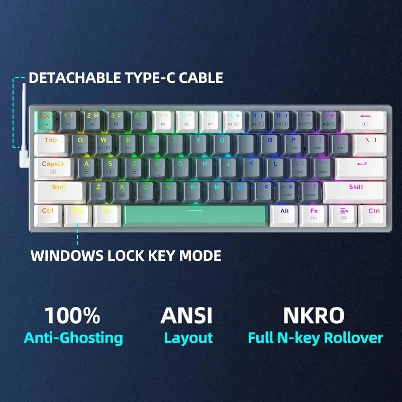 Keyboard Standard: 61 Keys Axis Body Brand: HUANO Keycup printing: Doublshot Interface Type: USB,Bluetooth/USB Operation Style: Mechanical Full Size keyboard: No Switches Hot swap: YES Keycup material: ABS plastic Backlight Type: MULTICOLOR Wrist Support: No Style: Standard Package: Yes Application: Desktop,Laptop,Tablet Type: Bluetooth Wireless Language: English Brand: Unbranded MACHENIKE Model: K500-B61W
