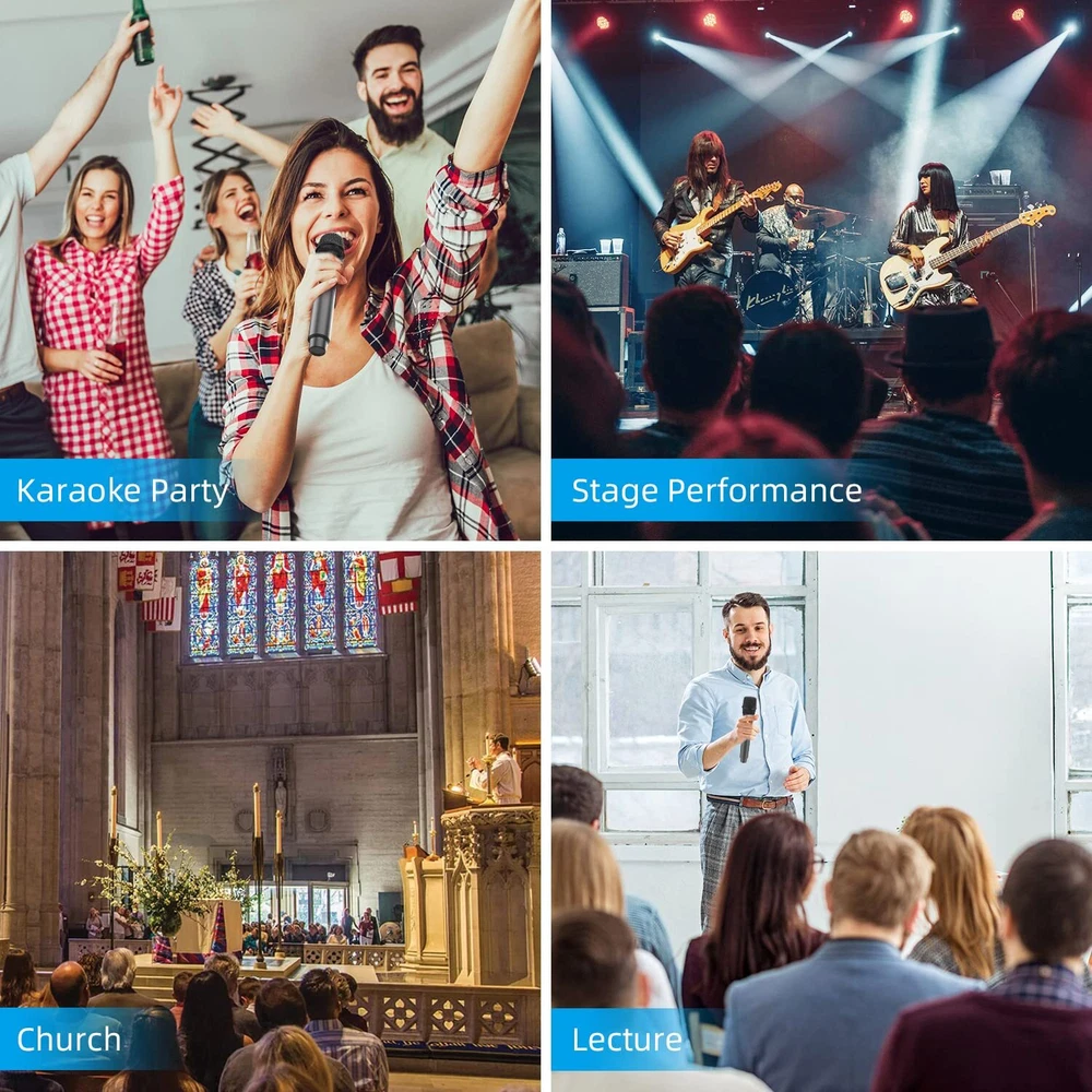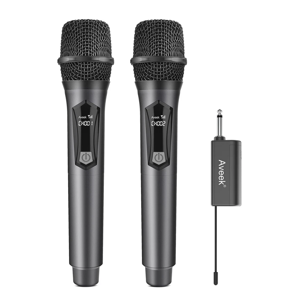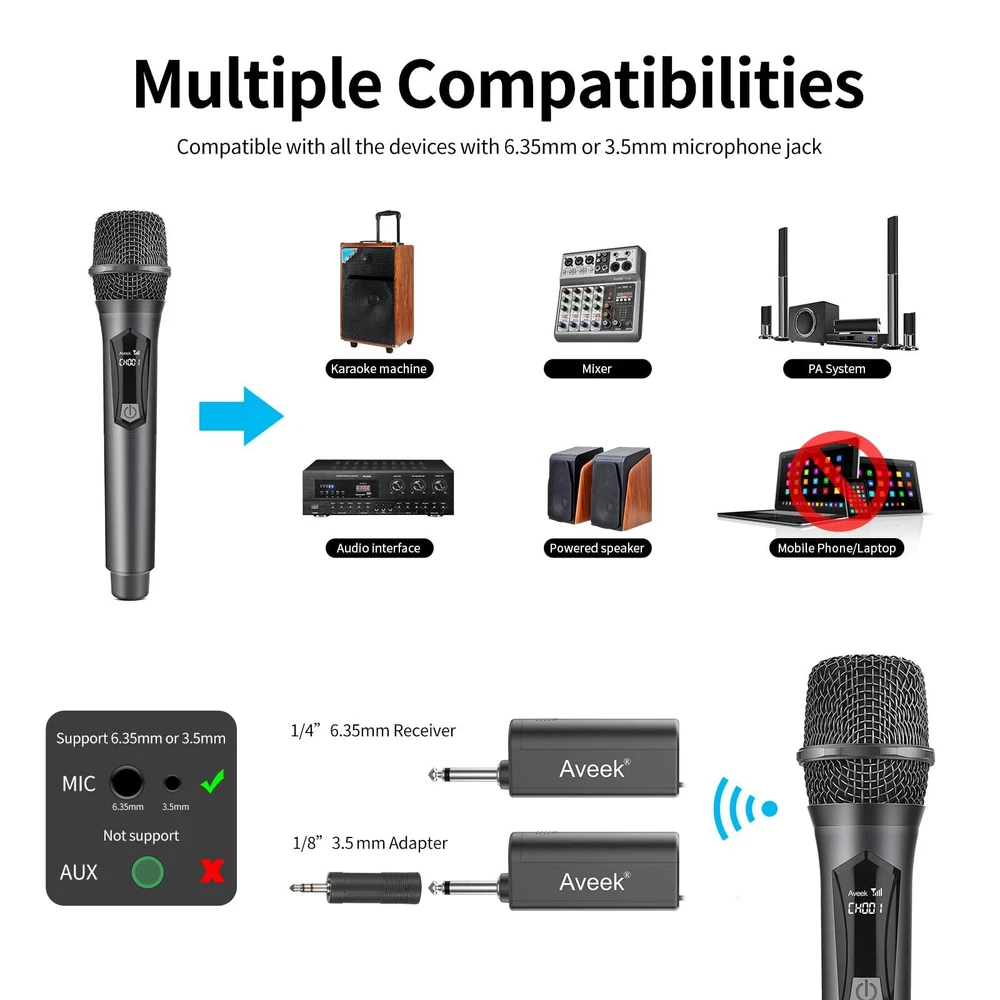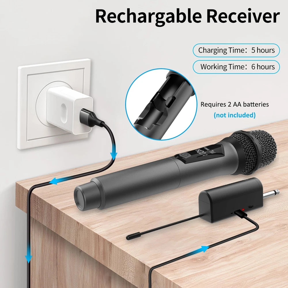 🎤Great Sound Quality: The wireless microphones provide a clear and crisp with no distortions whatsoever sound quality. and can be heard clearly at both indoor or outdoor parties with ease.great for home karaoke, performance, doing duets and public speaking; 🎤Compatibility: With its 6.35mm wireless microphone receiver and 3.5mm converter, excellent signal stability, compatible with Singing Machine,With Mic input Speaker(powered speaker), Audio Amplifier, Pa System, Mixer, Voice Amplifier And More Streaming Multimedia Equipment. NOTE: the wireless microphone system is Not Compatible with Bluetooth Speakers and Laptop, Phones, Computers, Smart tv or Tablets; 🎤Rechargeable Receiver & Battery Powered Microphone : The rechargeable and portable receiver charge for about 5 hours and can be used up to 6 hours.The Microphone Does Not Come With Any Batteries, We Recommend Using 2 AA Amazon Alkaline Batteries. Please Correctly install the battery + - direction; 🎤Operating Range: Maximum 100 feet (the open area) to freely move around during performances Reliable signal and no worried about the sound will be cut in and out during use.Use it for a multitude of events, such as family karaoke, church gatherings, weddings, meetings, and presentations; 🎤Plug and Play:Simply plug the receiver(1/4" or 1/8" ) into an Powered Speaker,amp or karaoke machine,Turn on the receiver and mic for automatic pairing,and you're good to go instantly.
