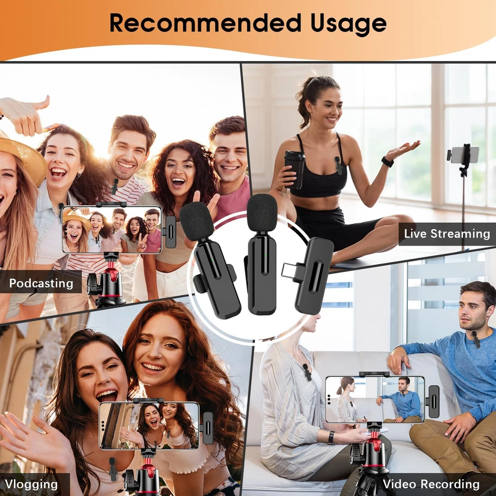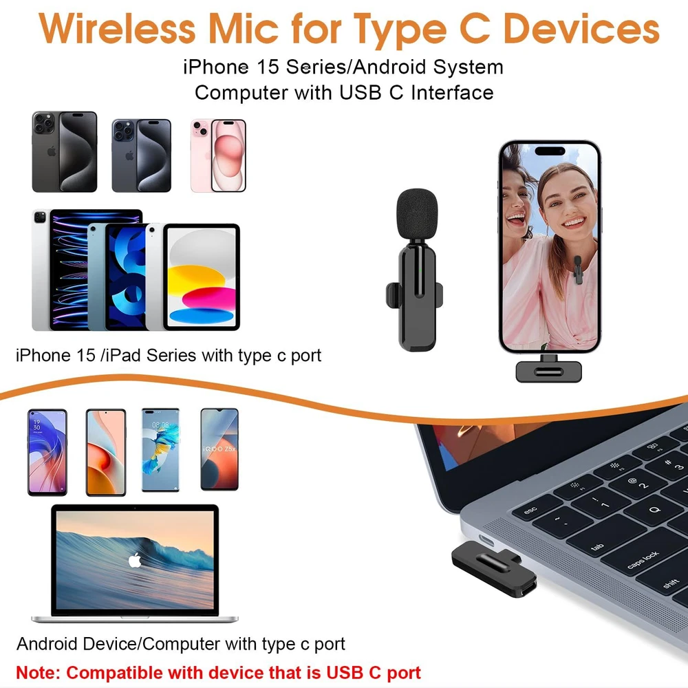 Wireless Mini Microphone for iPhone 15 - Bluetooth Lavalier Android Mic for YouTube Video Recording, Clip-on USB C Phone Microphones for Tiktok Vlog Livestream Podcast Easy Connection: This innovative wireless lav microphone is much easier to set. No adapter, bluetooth or application needed. Just put the receiver into your devices (USB C interface), then turn on the portable mic, these two parts will pair automatically Note: Please make sure the bluetooth in your cellphone is OFF before starting to make audio/video recordings 360°Rotatable Clip: Different from other lapel mic, we have upgraded the microphone clips with 360 degree rotation feature. That is to say you can change the mini mic to any direction you want while you’re making audio or video recordings. More importantly, the microphone’s clip can be largely protected from being broken easily, because you don’t have to take it off from your mic before changing directions Omnidirectional Sound Reception: equipped with high density spray-proof sponge and high-sensitivity microphone, our wireless microphone can clearly record every detail of the sound regardless of surrounded environment. The noise reduction technology cuts off any noise interference while recording so as to ensure the sound quality Full Compatibility: The wireless clip-on microphone is equipped with a Type C connector and a USB A to Type C charging Cable. Compatible with Android smartphones, iPhone 15 series, laptops etc, the handheld mic is suitable for interviewing, online conferencing, podcasting, vlogging, live streaming Note: This lavalier microphone is compatible with devices like Android phones, iPhone 15 series/iPad pro series that is usb c port. NOT Compatible with Lightning port Universal Wireless System: The small lapel microphone is free of wire. You can hold it by hand or clip it on your shirt. Enable to cover about 50ft for signal, helps you get rid of messy wire and clearly recording or taking video at a further distance indoors or outdoors Real Time Monitoring: The mini mic is equipped with a monitoring system, that is to say you can know what you are saying while making recordings. To achieve this, you can insert your digital earphones(with USB-C interface) to the port of the microphone after they are paired successfully. In this way, you can clearly know what content will be recorded by the microphone, so that you can make necessary adjustment to make your recordings more accurate Shipping We offer FREE shipping on all orders! We ship within Three business days of payment, usually sooner. We use a selection of shipping services such as UPS, FedEx, USPS etc. We only ship to the lower 48 states, no APO/FPO addresses or PO Boxes allowed. Local pickups and combined shipping options are not provided at this time. Return You can return a product for up to 30 days from the date you purchased it. Any product you return must be in the same condition you received it and in the original packaging. Please keep the receipt. Payment We accept payment by any of the following methods: PayPal Please pay as soon as possible after winning an auction, as that will allow us to post your item to you sooner! Feedback Customer satisfaction is very important to us. If you have any problem with your order, please contact us and we will do our best to make you satisfied. Contact Us If you have any queries, please contact us via ebay. We usually respond within 24 hours on weekdays. Please visit our eBay store to check out other items for sale! Thank you for shopping at our store.