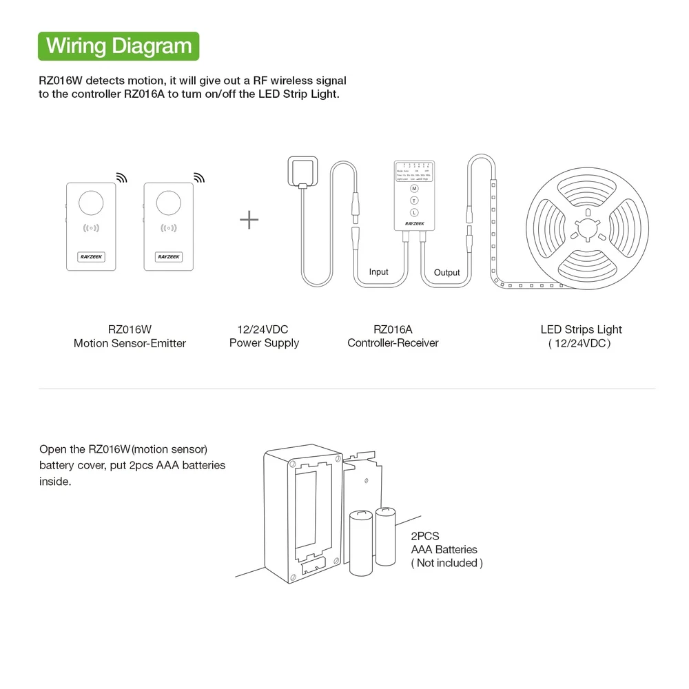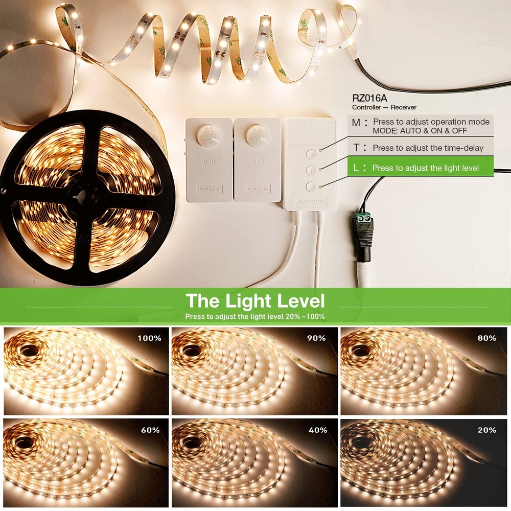 Wireless Motion Activated LED Strip Lights,19.7FT LED Strip Lights with Power Adapter,RF Wireless Motion Sensor Control Dimmer,Timing,Warm White (1×Controller+2×Motion Sensor) 【Wireless Motion Sensor】It only works with the controller and requires 2PCS AAA batteries. When it detects motion,it will give out a RF signal to the controller to turn on/off the load.Turn on the Light Sensor, and the sensor will only detect motion when the ambient brightness is lower than 35LUX to save energy 【Multi-function Controller】Auto/On/Off mode, Time-delay 15s-30s-60s-180s-300s-900s, Dimmable 20%-100%, the perfect design provides you with a variety of choices 【Cuttable/Expandable Strip Light】Wireless motion activated LED light strip with built-in 360 high-quality SMD2835 lamp beads/2520ml, 50000+ hours of long life. You can DIY cut it or extend it with the included 11.81-foot extension cord 【Reliable range and technology】The barrier-free detection range is 5-8 meters, and the wireless transmission range is 7-20 meters.The mature and reliable low-power wireless sensing technology brings more convenience to your life 【Safe to use, flexible application】Power Adapter runs on DC12V-24V, which is safe for children and the elderly. You can place the wireless sensor anywhere, it is very suitable for stairs, living room, kitchen, etc