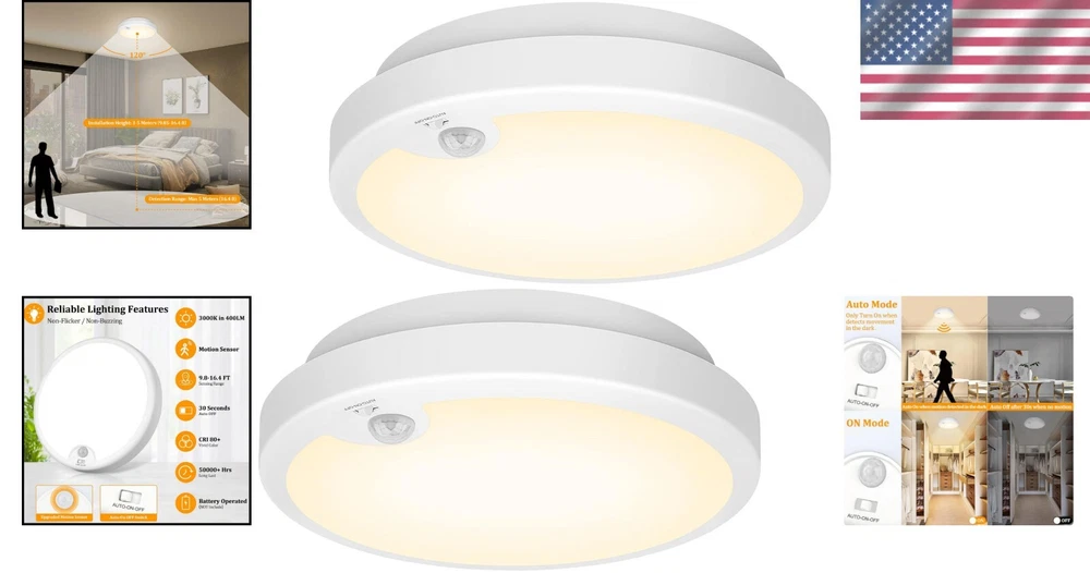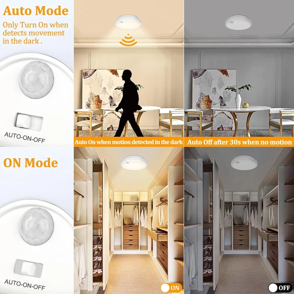 Wireless Motion Activated Ceiling Lights - 2-Pack, Ideal for Closets & Pantries