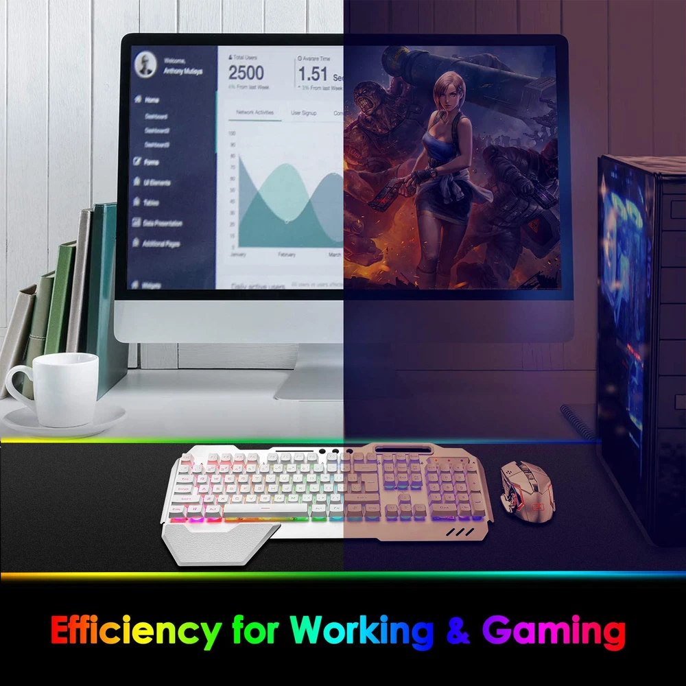 【Gaming Keyboard Mouse Combo】The gaming keyboard is made of aluminum alloy brushed panel, which is sturdy and durable. It can be waterproof a little, and the keyboard builts-in 4000mAh battery. The mouse builts-in 100mAh battery ,eliminates the trouble of frequently changing batteries. No operation automatically sleeps within 5 minutes, any key wakes up. 【2.4G Wireless Transmission】2.4G wireless technology enables the wireless gaming keyboard and mouse to achieve long-range wireless control. Plug & Play, the keyboard and mouse share an Intelligent Nano Receiver, convenient and fast. The gaming keyboard features a streamlined layout that is ergonomically designed for gaming or office or home use. 【RGB LED Backlit Keyboard】The mechanical feel Backlit keyboard with RGB backlit effect is an excellent visual experience in night operation, pressing FN+DEL to switch backlight states, The keyboard can adjust backlight brightness and breathing frequency. 【Fashionable and practical style design】Removable Hand Rest,game style floating keycap, with a variety of multimedia key combinations, two-color injection keycaps. The characteristic mobile phone bracket design on the keyboard can perfectly solve the problem of placing the mobile phone during the game, and can communicate more conveniently with the teammates when playing the game 【Gaming mouse】 The 7 color LED gaming mute mouse has a unique metal material roller, intelligent colorful light breathing light, 6-button button with the latest electroplated Electropland technology double flank, adjustable 4-speed DPI (800-1200-1600-2400), accurate positioning, touch Feel good, the game is more sensationa for mouse gamer.
