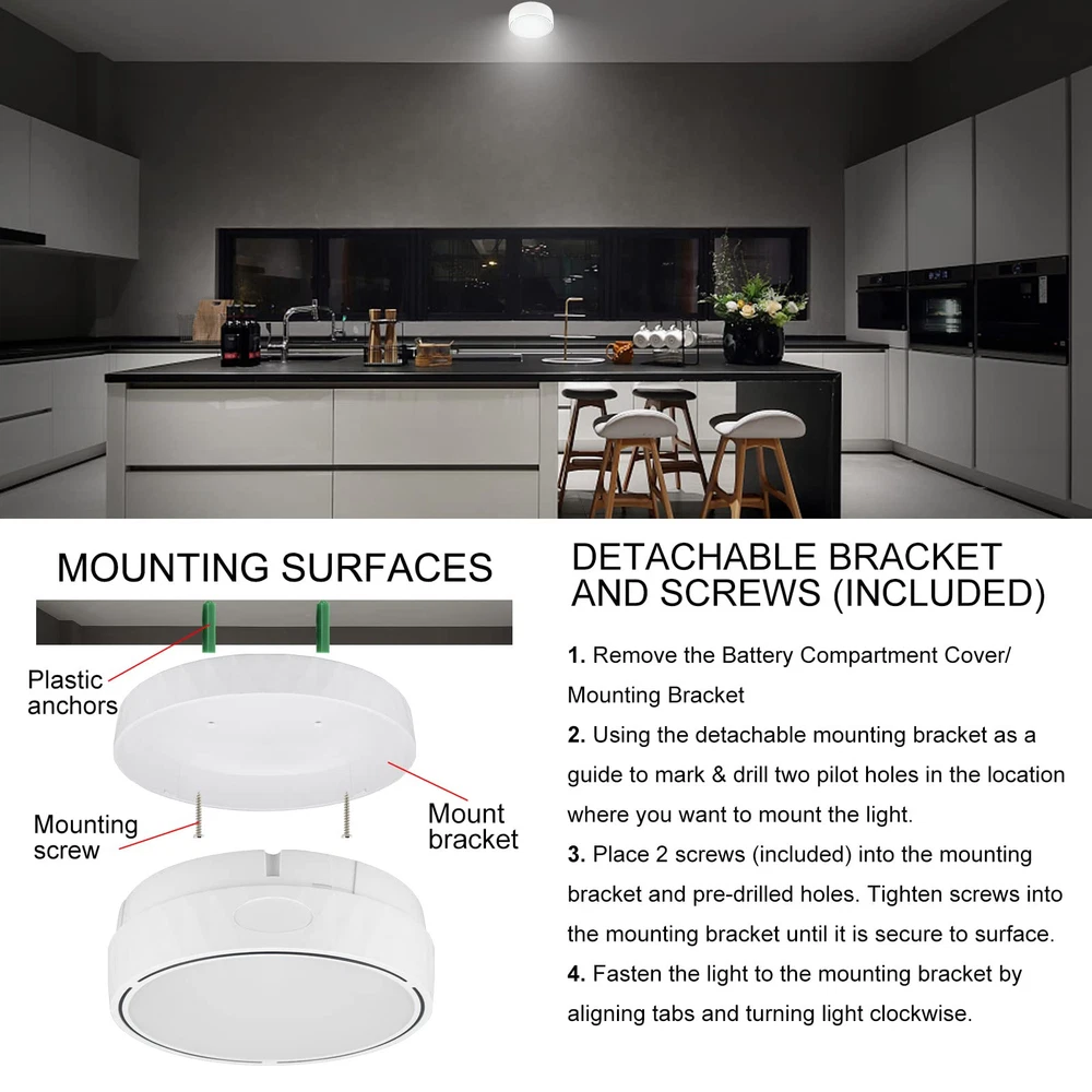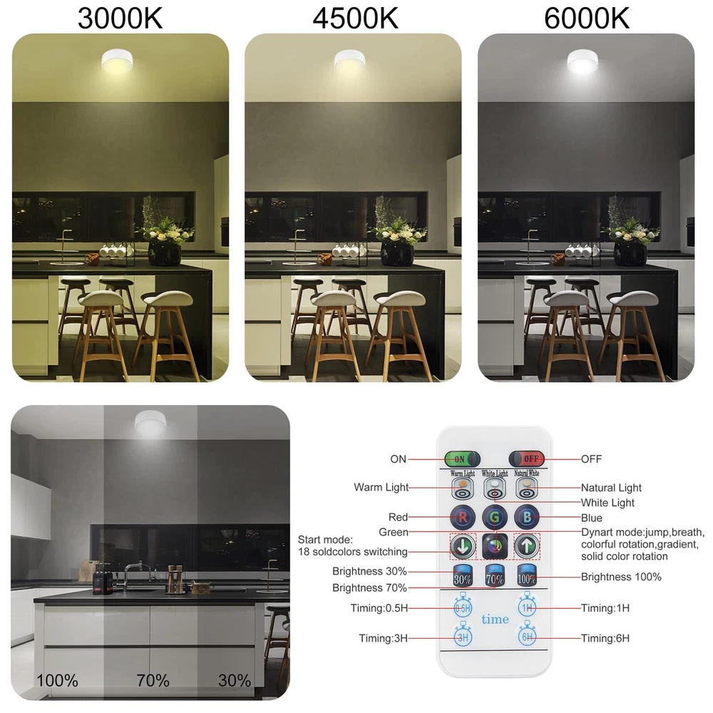 More Details *Size: 5.4"L x 5.4"W x 2"H * Material: ABS * 300 Lumens, 3000K/4500K/6000K, DC 5V, LED lifespan is 80,000 Hours. * The remote control can operate the light within 10 feet. * Powered by 3pcs D-Cel batteries (not included) or 5V/2A DC USB power cord(included, 10ft), and each set of batteries’ run time is 50-80 hours. * Choose a color from the 18 colors by pressing a corresponding color button. Set brightness and color-changing modes at dynamic mode / jump/ breath/ colorful rotation / gradient / solid color rotation. * Can be used anywhere like elder's room, kid's room, bathroom, hallway, wedding, party decoration, etc. Packing List - 1 x Ceiling Light - 1 x Remote Control - 1 x 10ft DC Power Cord - 4 x Screw Hardware - 3 x Plastic Anchor - 6 x Wire Clip - 1 x User Manual [Timer Function] -- You can set the shower light to turn off automatically in 0.5/1/3/6 hours by pressing the timer buttons on the remote, save energy and prolong battery life. [Brightness Dimmable] -- Press the dimmer buttons on the remote to adjust the brightness of the ceiling light to 30%, 70%,100%. [2 Power Supply Modes] -- The 5.4" puck light can be powered by 3pcs D-Cell batteries (not included), very long lasting, or you can use 5V/2A DC USB(included) to power it directly. [Super Bright] -- Each night light is 300 lumens, very bright, and there are 3 color temperatures for your choice, you can set it to warm white(3000K), natural white(4500K) or cool white(6000K). [5 Lighting Modes & 18 Colors Changing] -- The mood light has 18 color choices and 5 lighting modes, you can change the colors freely or set them jump or rotate. [Easy Installation] -- Very easy to mount with provided screws, no additional wiring is needed. Good choice for your bedroom, bathroom, hallway, corridor, bedside, closet, shower, stairway, closet, pantry, living room, kitchen, laundry room, etc.