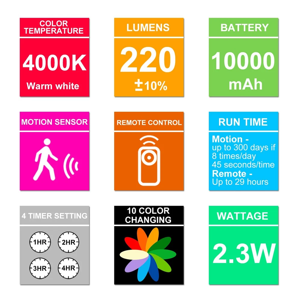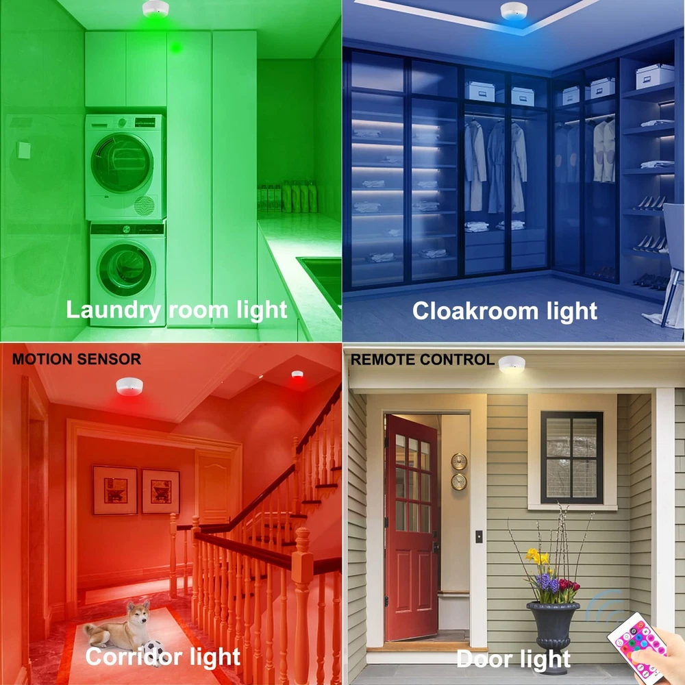 MORE DETAILS * 220 Lumens, 4000K, 2.3W, lifespan is 80,000 Hours. * The remote control can operate the light within 20 feet. * Powered by built-in rechargeable polymer lithium battery, 10000mA, and full charged run time is about 29 hours. * Choose a color from the 10 colors by pressing a corresponding color button. Set brightness and color-changing modes at FLASH/ STROBE/ FADE/ SMOOTH. * Easy to install with screws(included). * Can be used anywhere like bedroom, bathroom, hallway, corridor, closet, shower, stairway, pantry, shed, dorm, cabinet, counter, living room, etc. Packing List - 1 x Ceiling Light - 1 x Remote Control - 2 x Screw - 1 x USB Charging Cable(19.7 inches) - 1 x User Manual · [Motion Sensor ON/OFF Switch] -- You can set the closet light to motion mode or regular mode by pressing the motion sensor ON/OFF buttons on the remote. And it will auto ON when motion is detected within 16 feet, auto-off after 45 seconds if no motion detected. · [4 Lighting Modes & 10 Colors Changing] -- There are 10 colors and 4 lighting modes for your choice, you can change the colors freely or set them jump or fade, perfect for mood lighting. · [Brightness Adjustable & Timer Function] -- Each ceiling light has 42 super bright LED, 220 lumens, 4000K. And the brightness can be dimmed to 5 levels by pressing the dimmer buttons. There are 4 timer buttons on the handy remote, and you can set the light to turn off automatically in 1/2/3/4 hours to save energy. · [USB Rechargeable] --The built-in rechargeable polymer lithium battery is 10000mA, full charged run time is about 29 hours. · [Moon & Sun Mode AUTO/OFF Switch] -- Moon mode: the light will auto ON at night when motion is detected; Sun Mode: the light will auto ON at both day and night when motion is detected.
